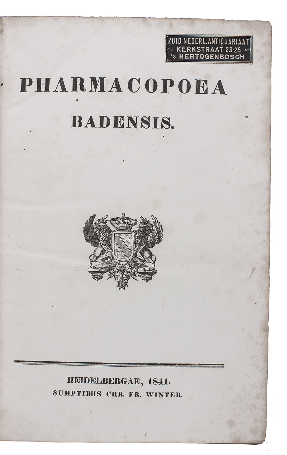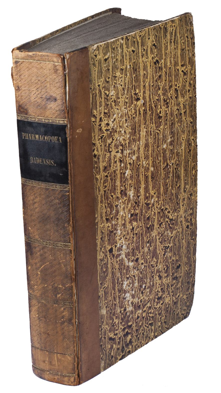 First edition of the official pharmacopoeia of the Duchy of Baden, in southwest Germany, which replaced the Preußischen Pharmakopöe used there previously. It contains a total of 822 medicines and recipes, of which 345 "Simplicia" (simple medicines) and 477 "Praeparata" (compound medicines). The book is entirely interleaved.