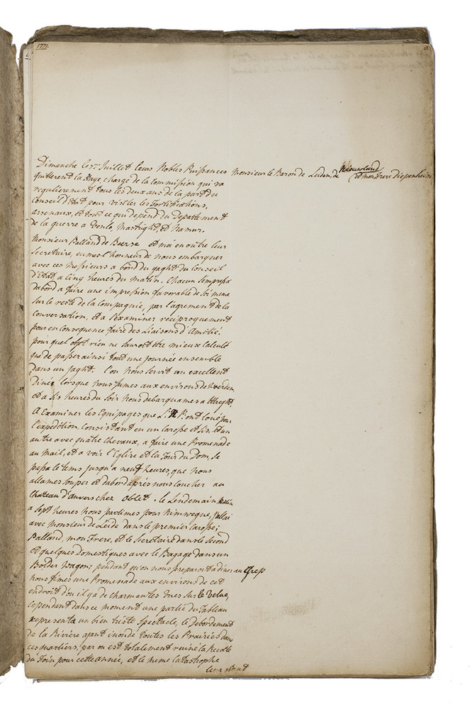 Although neither these journals nor the earlier American one (formerly kept with this one and written in a similar hand) names its author, the events in the American journal clearly identify him as Lieutenant Rudolph Bentinck, who visited William Bentinck, 2nd Duke of Portland, on his way to America. In the present 1771 journal he sets off on 7 July 1771 with (Cornelis Pieter) Baron van Leiden, (Nicolaas Baron van Denike, Heer?) van Nieuwland, (Adolf Warner), Baron van Palland(t) tot Beerse (1745-1823) and "mon frere Diepenhein" [= Derk Bentinck van Diepenheim (1741-1813)], the reference to his brother confirming his identity as Volkier Rudolph Bentinck (1738-1820). They travelled mostly by coach.