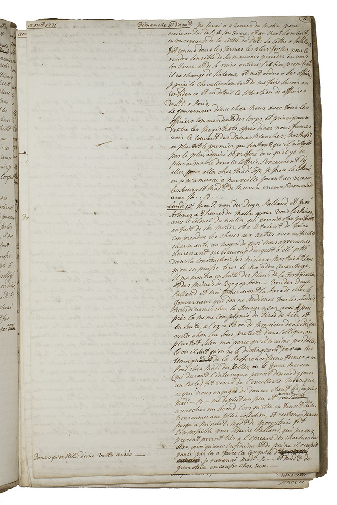 Two journals kept by the Dutch Lieutenant Colonel Volkier Rudolph Bentinck (1738-1820), usually called Rudolph or sometimes Rudolphus, in the Dutch and British army, who had earlier fought alongside George Washington in the British army in America. They give an intimate and very personal view of daily life in the army, especially social life. It does show Bentinck inspecting fortifications (at least once climbing to the top) and mines in Maastricht (including the fort on "Montagne de St Pierre" [= Sint-Pietersberg]), Den Bosch (Bois-le-Duc), Bergen op Zoom, Namur (also an armaments foundry) and elsewhere. It shows his enthusiasm for Captain Schoesters collection of battle plans ("Il me montra une fort belle collection de plans des battailles des deux derniers gueres" and later "Je passai chez Monsr de Shoester le matin, pour en tirer encore quelques informations concernant ma collection de livres et plans militaires") and he later views fortification plans with Colonel Carel Diederik du Moulin (1727-1793), a well-known Dutch fortifications engineer.