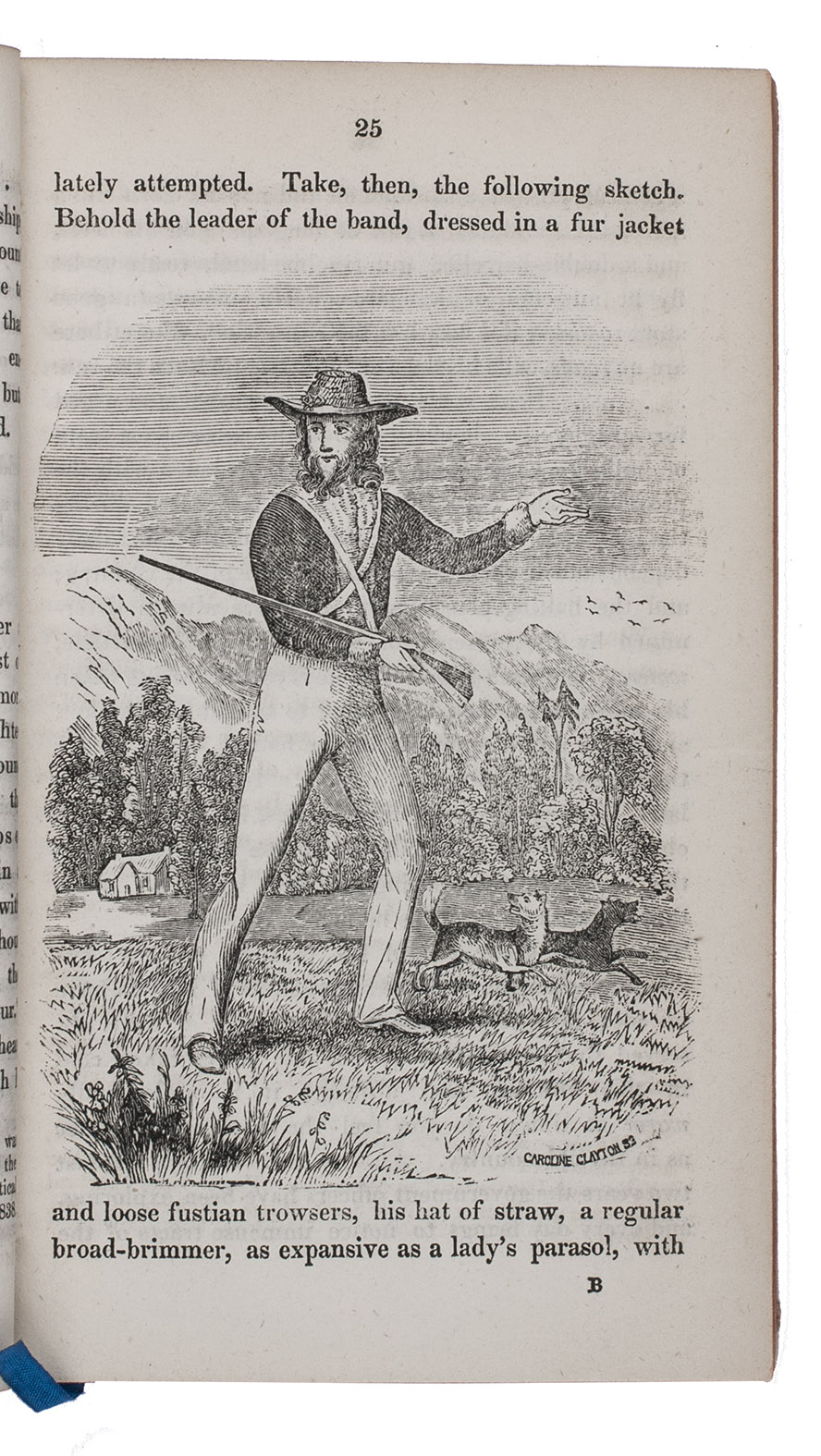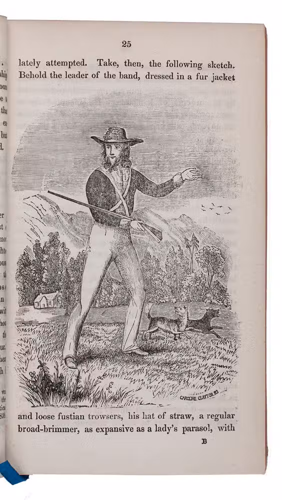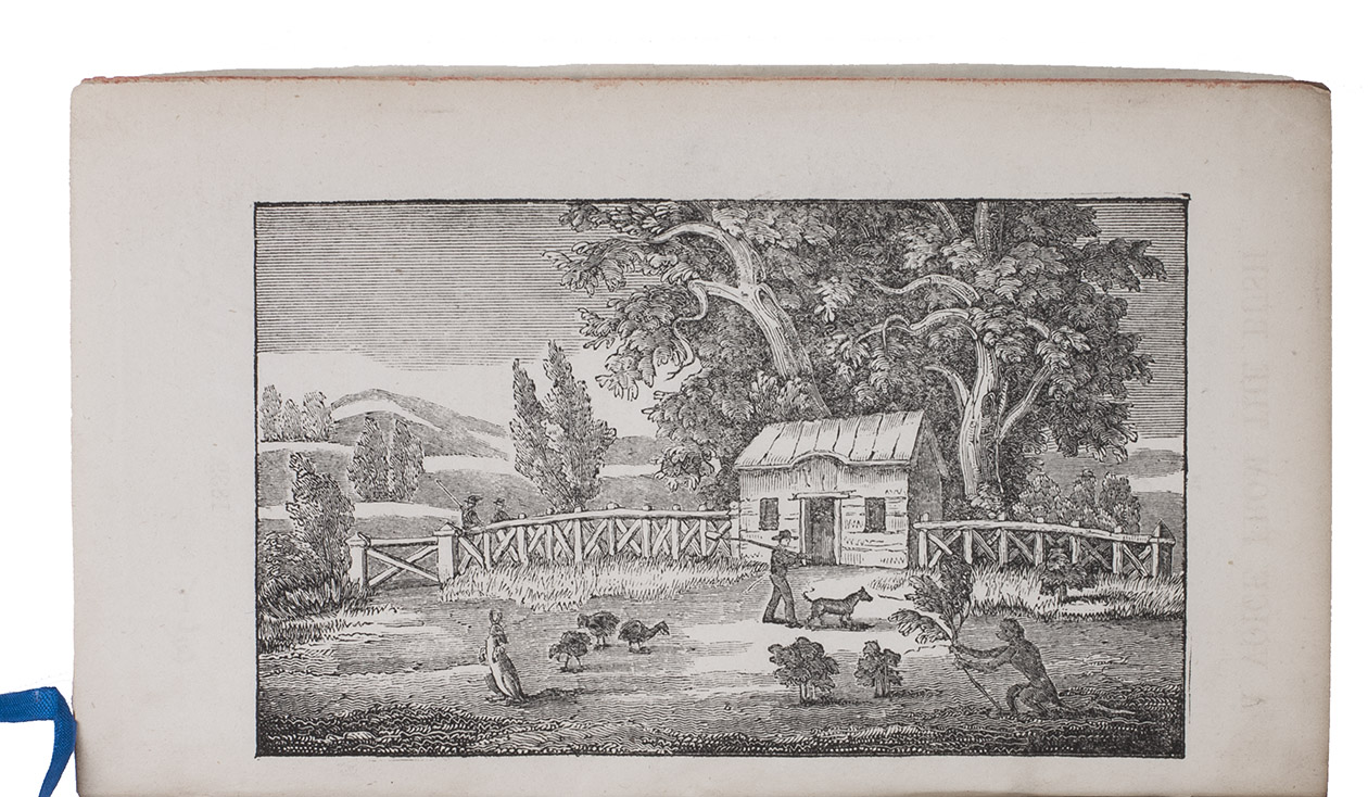 A collection of letters from New South Wales by Thomas Pope Besnard, an Irish colonist of Cork, with 4 extensive appendices containing valuable information on the early colony. Besnard became an overseer on a chain gang and writes enthusiastically about the great possibilities of life in Australia, where he is "working and faring hard, yet earning the sweet bread of honorable independence" (p. 17). The frontispiece shows a farmer in front of his small house, with other men, a kangaroo or wallaby and other animals. The wood-engraving, by Caroline Clayton, shows a hunter with two dogs. The appendices contain practical information for settlers (lists of public and commercial institutions, information on post coaches, etc.) and extracts from various publications relating to Australia.