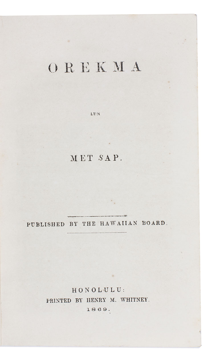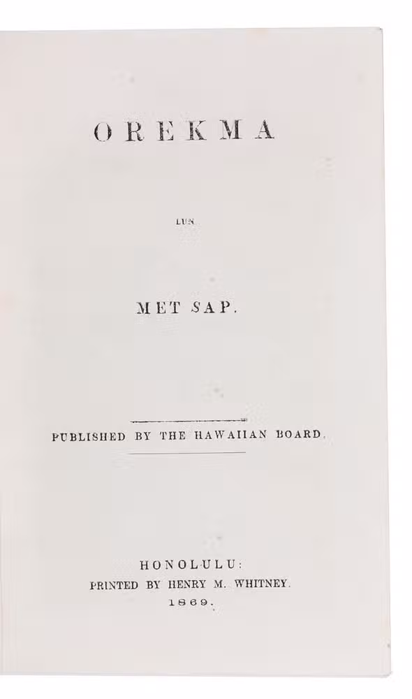 The printer of the present booklet, Henry M. Whitney, was born at Waimea in 1824. He was educated in the United States, where he became acquainted with the printing trade, working as foreman in the printing office of Harpers & Bros, New York. Upon his return to Hawaii, Whitney became the editor of the newspaper Polynesian. He later founded an independent newspaper at Honolulu and imported the first power press to Hawaii.