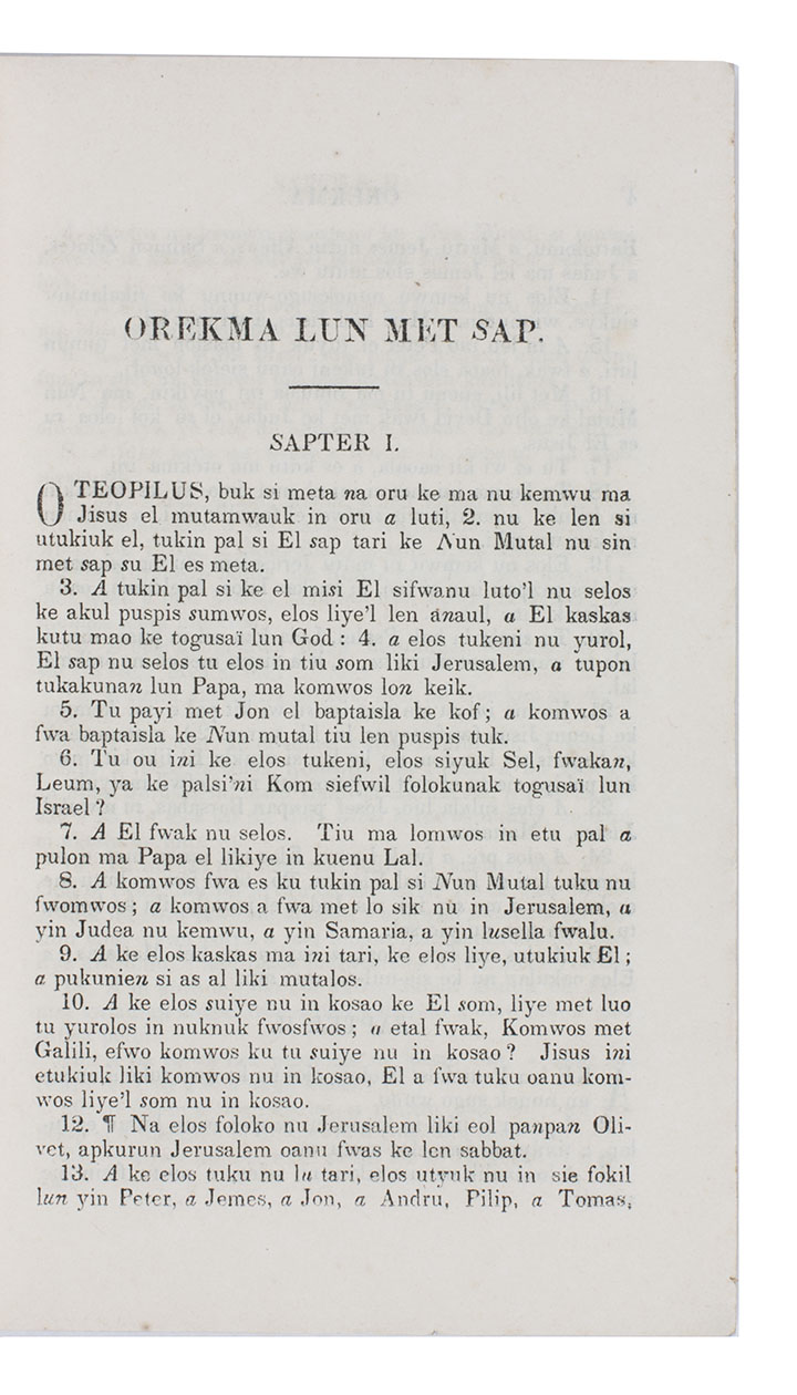 Rare edition of the Acts of the Apostles in Kosraean (Kusaiean), spoken on the islands of Kosrae, the Caroline Islands and Nauru. The translation is by Benjamin G. Snow, a pioneer of Micronesian Mission. He settled in Kosraea in 1852 and published several translations of parts of the New Testament from 1862 until his death in 1880, all printed at Honolulu.