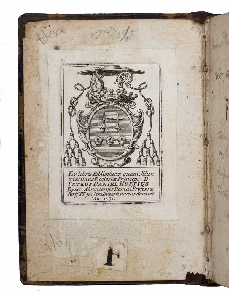Although Huet was not a member of the Jesuit order, he lived his final years in a Jesuit home in Paris. After his death, he bequeathed his library to the Jesuits and upon the dissolution of the order in France in 1764, king Louis XV bought Huet's books and they are now part of the colleciton of the Bibliothèque Nationale de France. The bookplate on the front pastedown was made by the Jesuits to commemorate Huet's donation of his library.