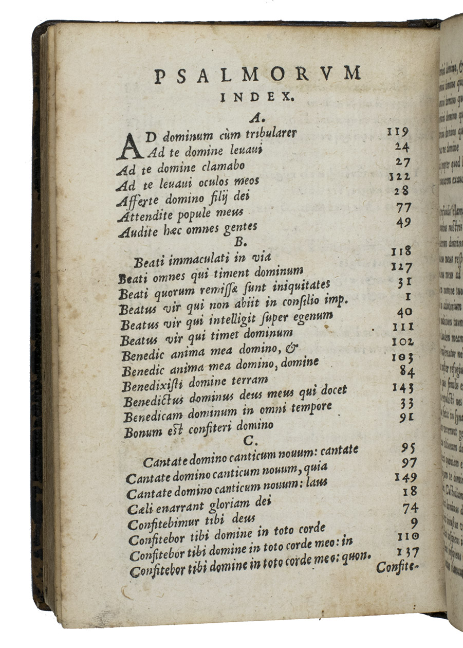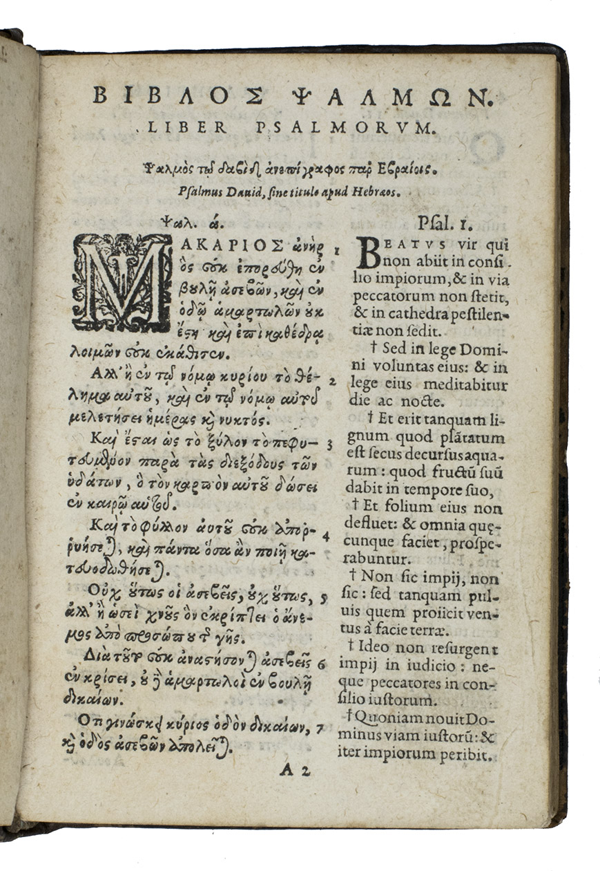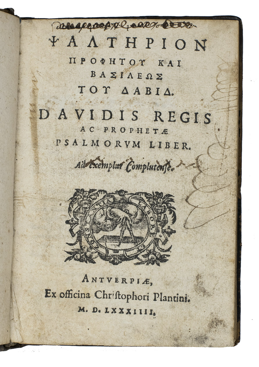 The text of this Book of Psalms is printed in Greek and Latin, in parallel columns and on each page the inner column contains the text in Greek, while the outer column contains the same in Latin. There are separate Greek and Latin indexes at the end of the work. This copy belonged to Pierre-Daniel Huet (1630-1721), a French clergyman and scholar. According to title-page, this bilingual work was published by Plantin after the example of the Complutensian Polyglot Bible (1520). Plantin also issued a 24mo edition in the same year.