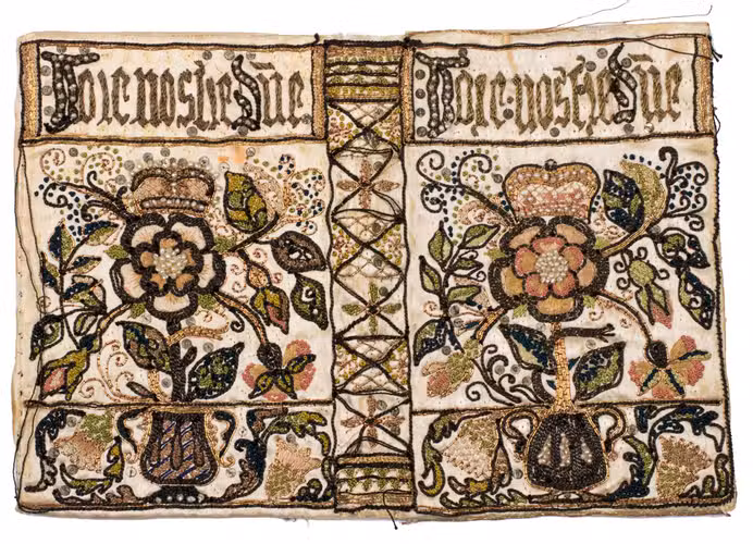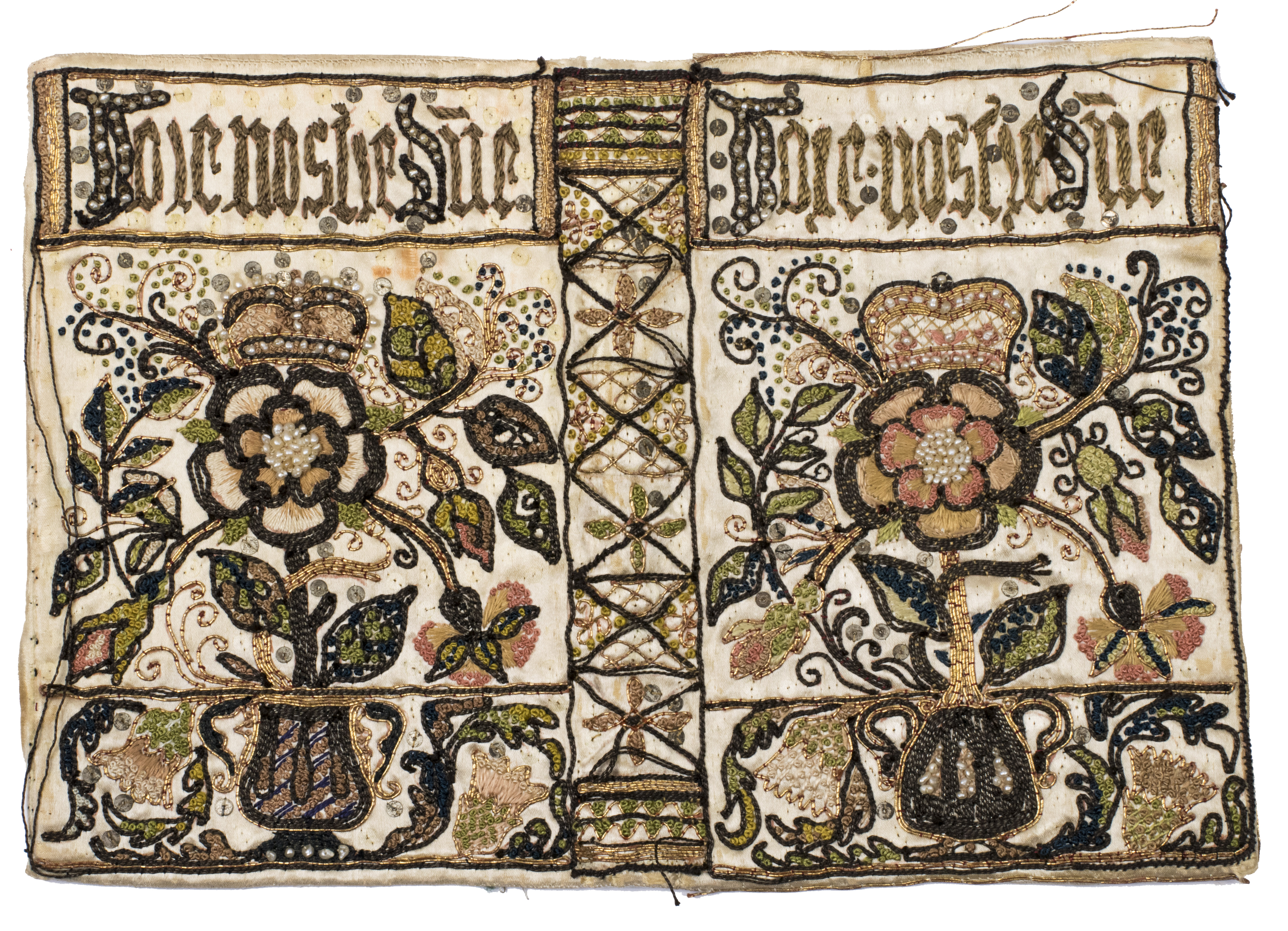 [England (London?), second quarter of the 17th century]. Size when opened: 17 x 25 cm. Ivory silk satin, richly decorated in a colourful floral design with goldwork, metal sequins, and clusters of seed pearls, the text "voir nostre do[min]e" embroidered on the front and back.