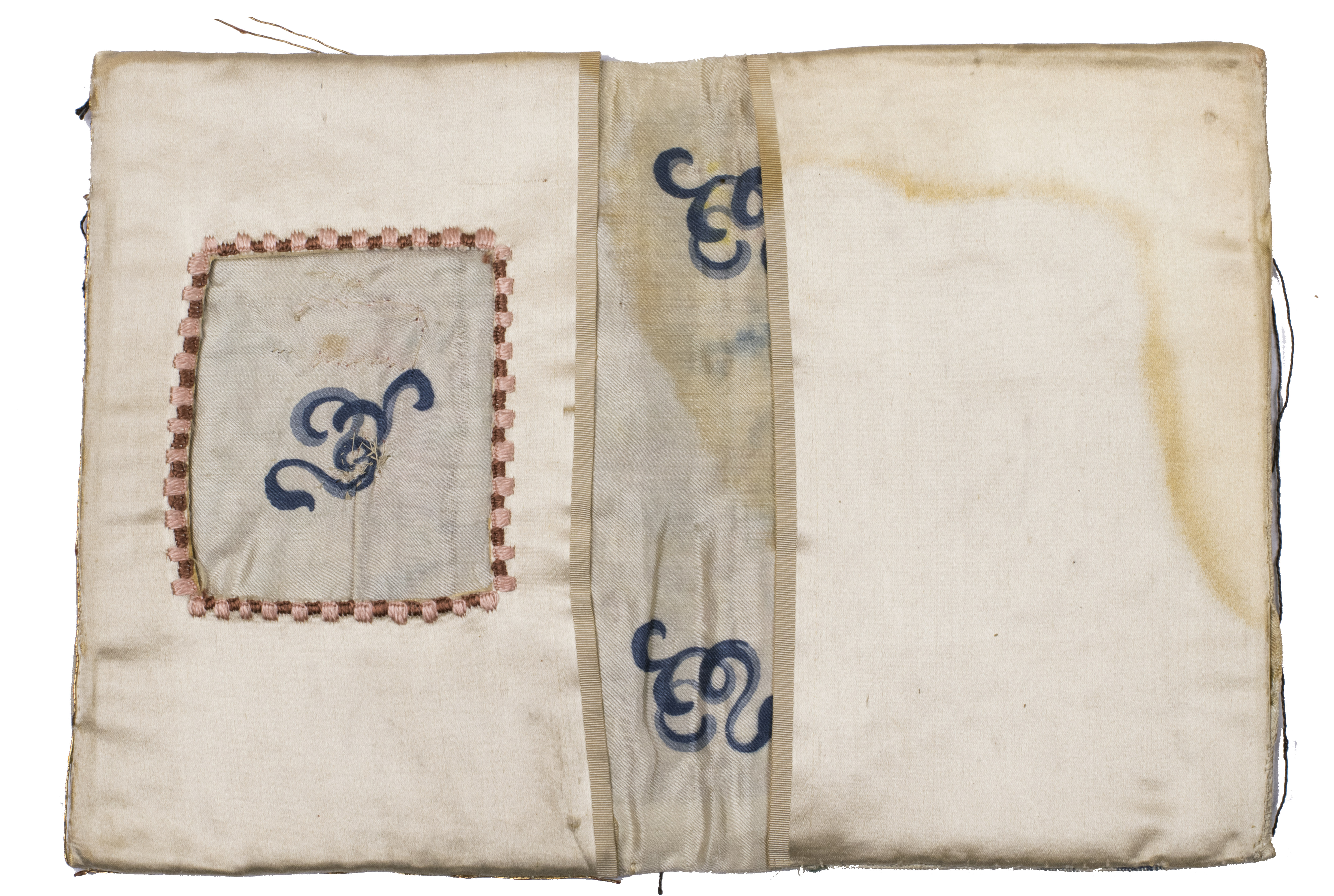 All sections and shapes have been beautifully outlined with gold thread fastened with red silk. The hearts of the roses, the crowns, the vases and the initials V and D of the text have been decorated with small pearls. Little round sequins are scattered in the foliage, filling the negative space. At the interior two pockets have been sewn, intended for the insertion of a book, probably a Psalter of ca. 16.5 x 10 cm, or 12mo format.