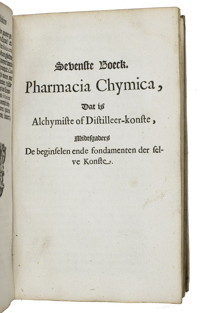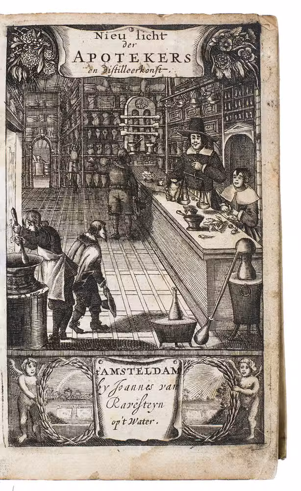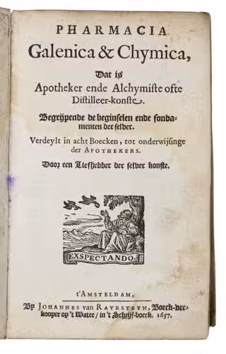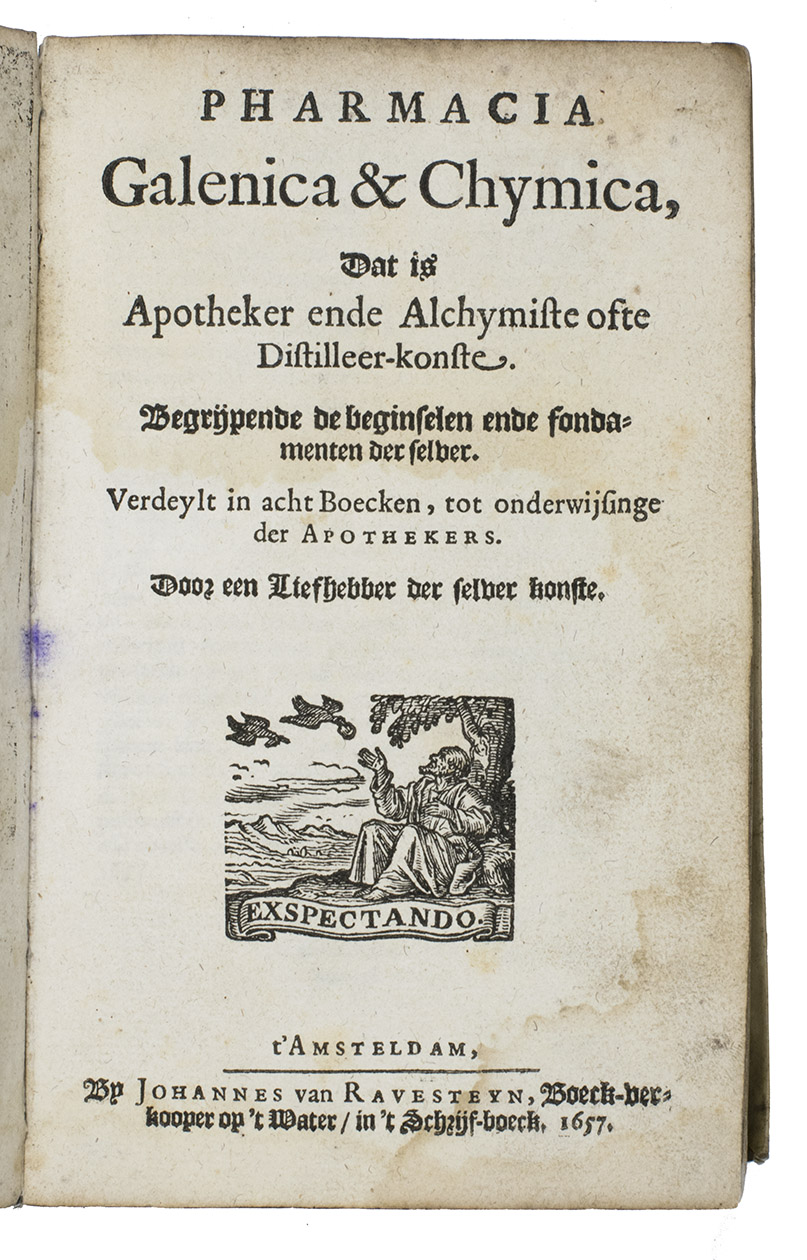 Pharmacia Galenica & chymica, dat is: apotheker ende alchymiste ofte distilleer-konste. Begrijpende de beginselen ende fondamenten der selver. [Additional title and imprint on the frontispiece:] Nieu licht der apothekers en distilleerkonst. ... tAmsteldam by Joannes van Ravesteyn op t Water.