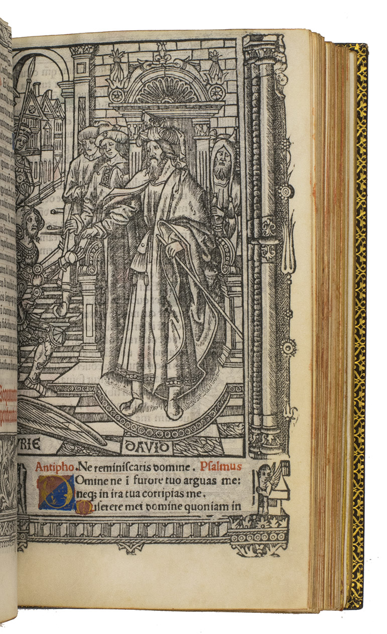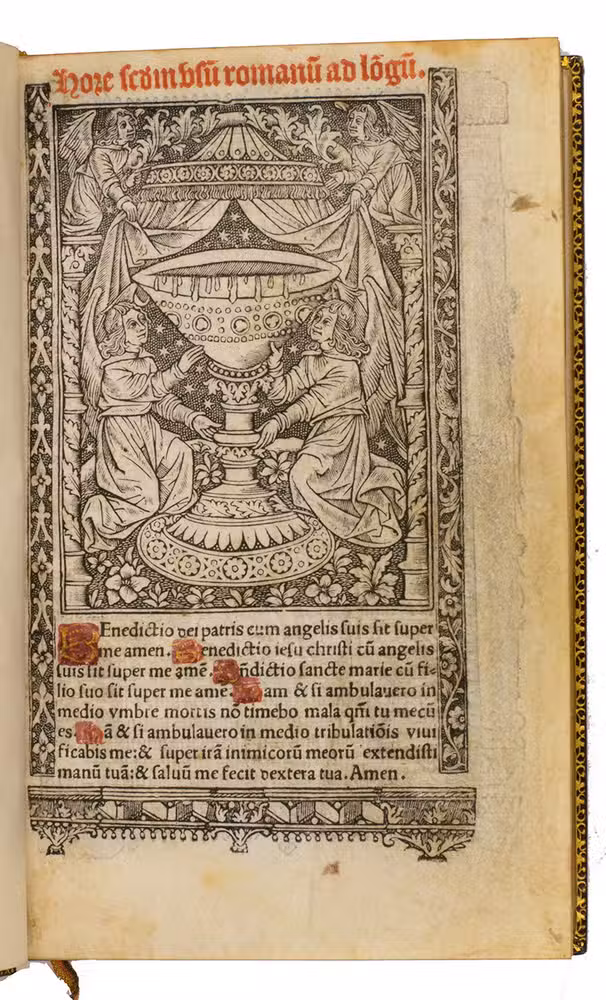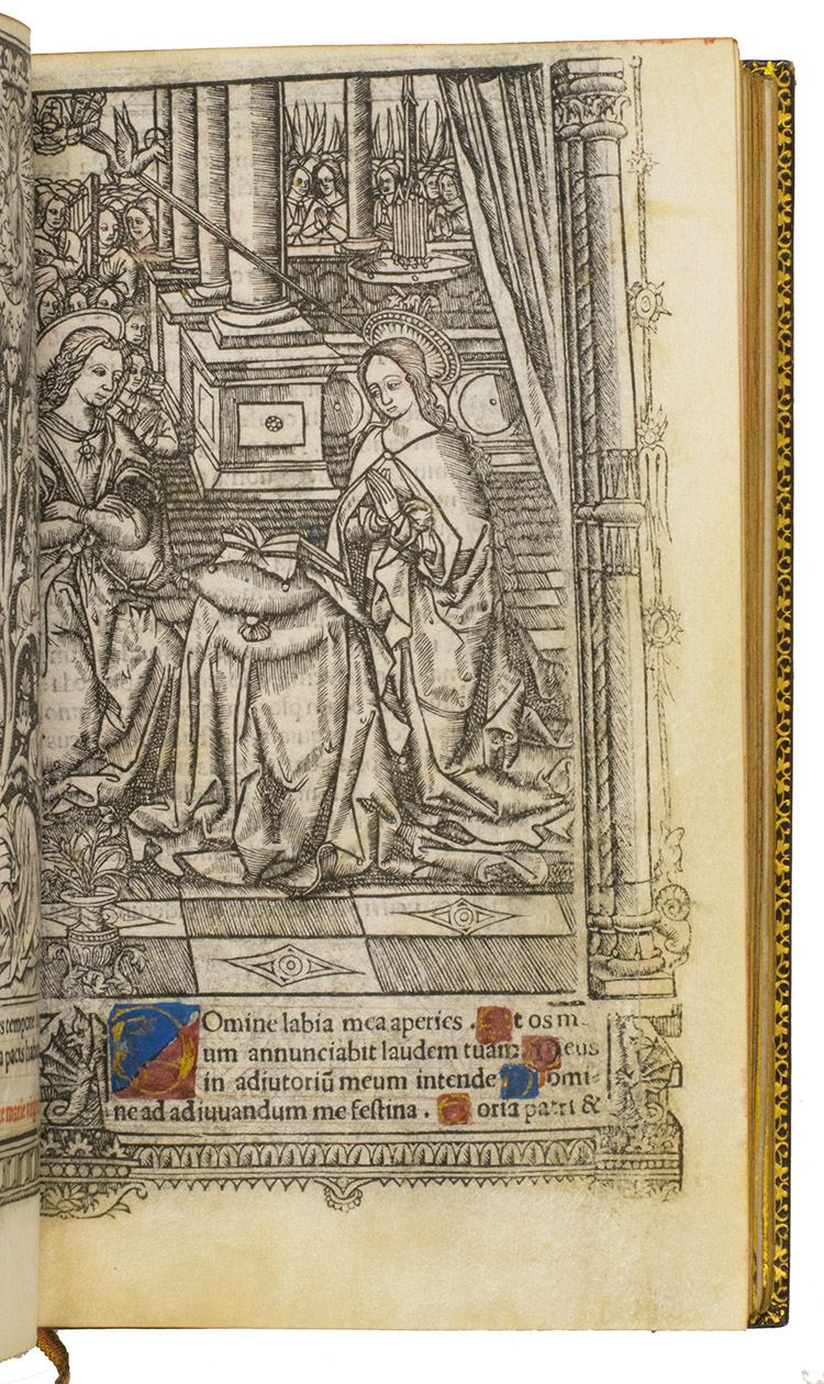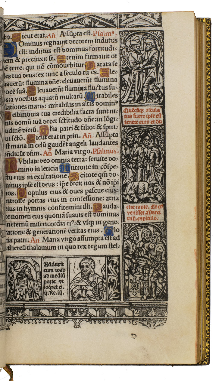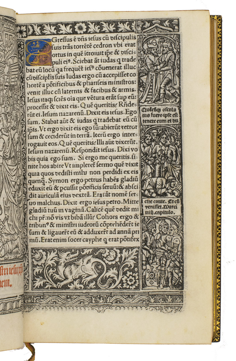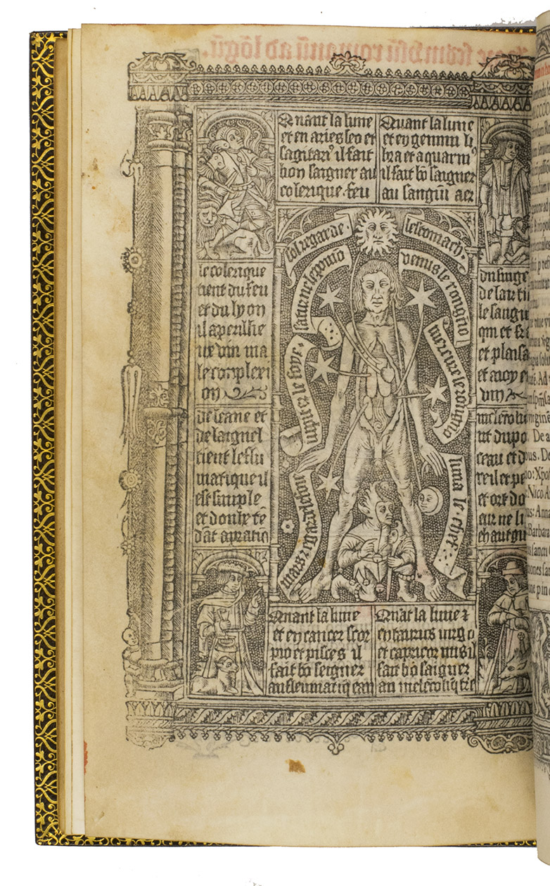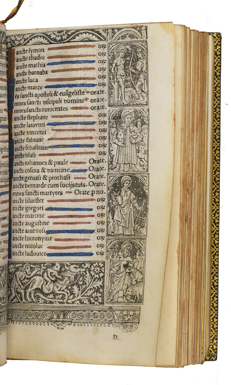 (colophon: Paris, Thomas Kees), [ca. 1511, with an almanac for the years 1511-1530]. 8vo (18 x 12 cm). Printed on vellum in red and black throughout, with illustrations printed from (mostly metal?) relief blocks: 17 nearly full-page plus 1 repeat, 27 small plus 2 repeats in the text, many additional small in the decorated border pieces that surround nearly every page. Dark brown gold- and blind-tooled goatskin morocco (ca. 1870?), signed "HARDY-MENNIL" in the foot of the front turn-in. [216] pp.