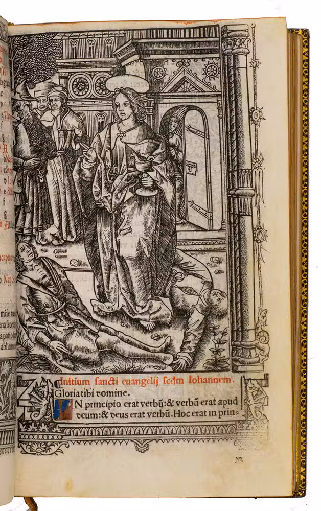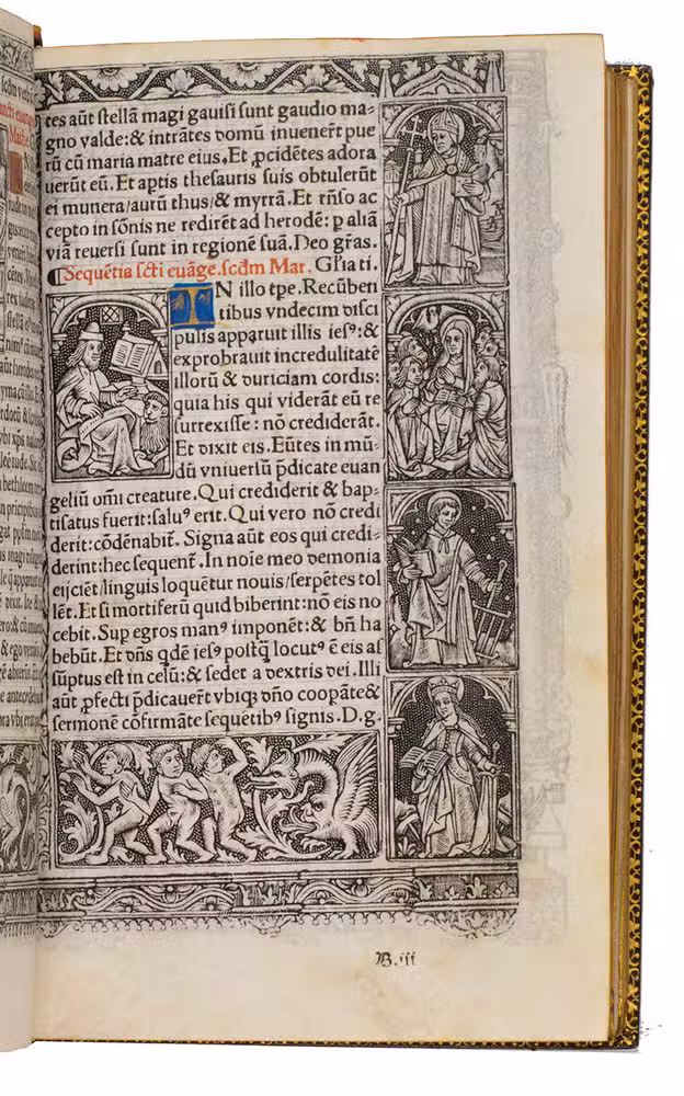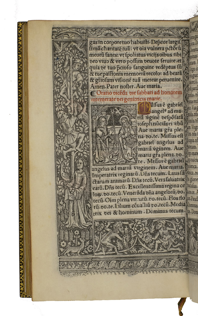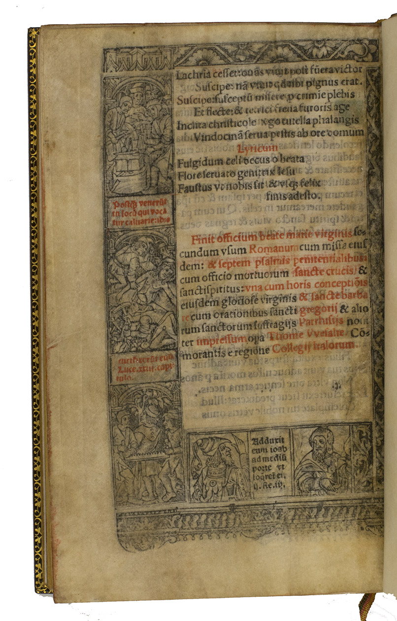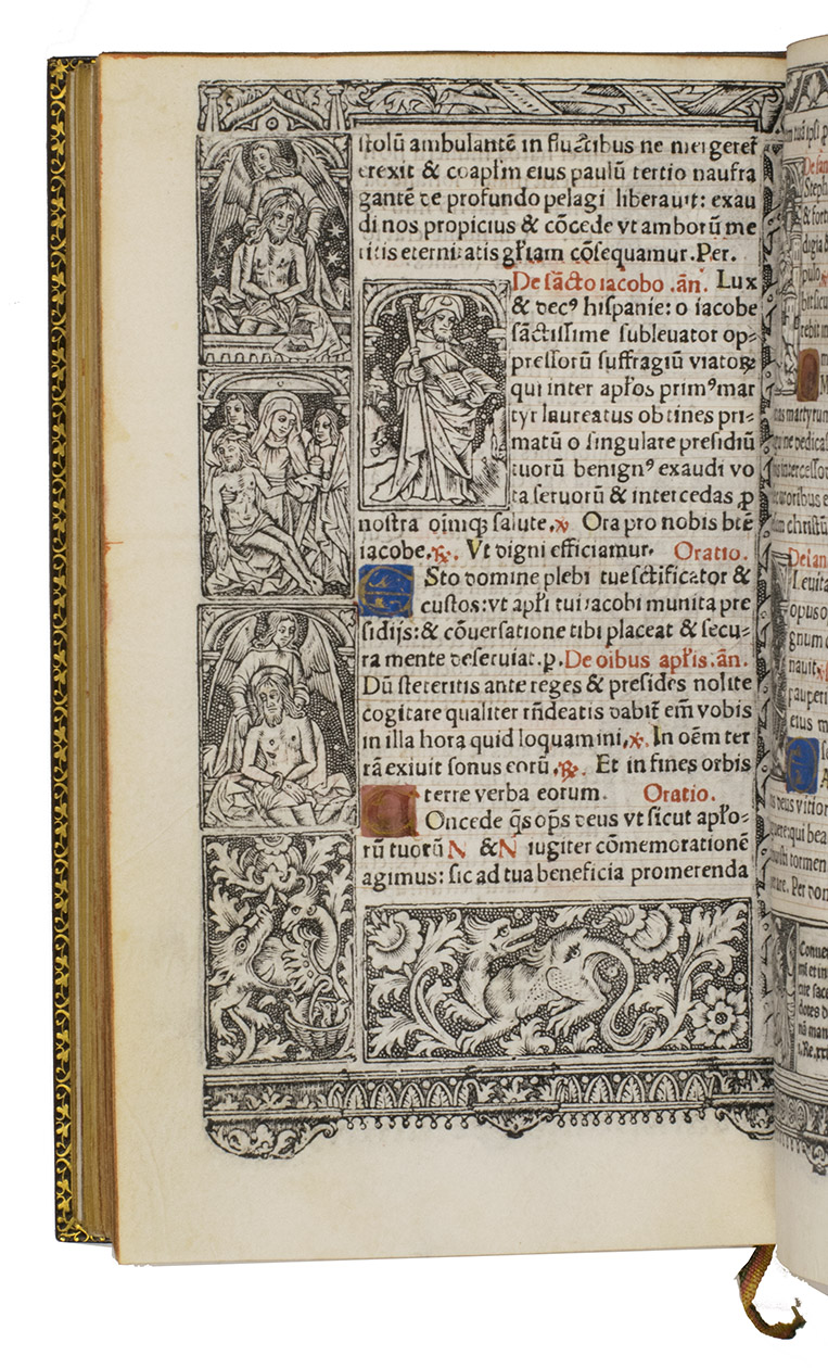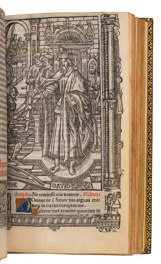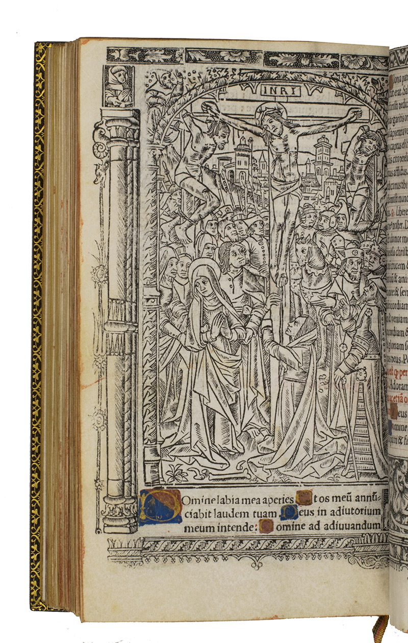 (colophon: Paris, Thomas Kees), [ca. 1511, with an almanac for the years 1511-1530]. 8vo (18 x 12 cm). Printed on vellum in red and black throughout, with illustrations printed from (mostly metal?) relief blocks: 17 nearly full-page plus 1 repeat, 27 small plus 2 repeats in the text, many additional small in the decorated border pieces that surround nearly every page. Dark brown gold- and blind-tooled goatskin morocco (ca. 1870?), signed "HARDY-MENNIL" in the foot of the front turn-in. [216] pp.