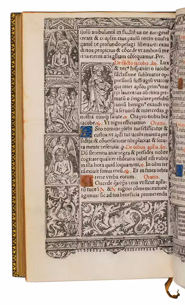 Second known copy, apparently the only known copy printed on vellum, of a Paris book of hours in Latin, probably published in 1511 (the almanac and calendar for 20 years covers the years 1511 to 1530), the only known book of hours printed by Thomas Kees (or Caseus) from Wesel in the Rhine valley, recorded as a printer in Paris from 1507 to 1516. The illustrations are finely cut, many with criblée backgrounds, and many are thought to have been printed from metal relief blocks, rather than woodcuts. Most of the small illustrations in the text depict saints. The illustrations in the border strips include scenes from the Old and New Testament, dance of death scenes, apostles, saints, scenes from daily life, fantastic beasts and more. The large illustrations may have been cut for Antoine Vérard ca. 1503 to 1507.