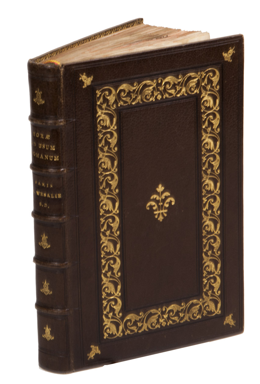 Trimmed close to the decorative borders at the head, shaving a border on 1 page and just touching a few others, with a tiny chip slightly affecting the corner of another border, but generally in very good condition, the binding fine. Bohatta 932; French vernacular books 67388 (BN Paris copy only); KVK & WorldCat (BN Paris copy only); Moreau II, 115 (p. 83) (BN Paris copy only); Van Praet, Cat. Livres imprimés sur vélin ... bibl. Tant publiques que particulières I (1824), 176? (citing Bibl. Harl. 18352, possibly the present copy); Robins, Bibliotheca Harleiana: a catalogue of ... the Harleian Library 18352 (vol. IV (1817), p. 781)? (not seen, possibly the present copy); Ludwig Rosenthal, Bibliotheca evangelico-theologica, cat. 70, part 7, [1892?], p. 96 (not seen, possibly the BN Paris or the present copy); Tenschert, Horae B.M.V.: 158 Stundenbuchdrucke der Sammlung Bibermühle (2003) 80 (lacking title-page & 2 text ll.); USTC 183113 (BN Paris copy only); cf. Davis, \Fairfax Murray (French) 253-259 & table on p. 289; (very similar illustrations in Pigouchet eds. 1496-ca. 1508); MacFarland, Antoine Vérard, table on p. 133 (the present illustrations in Vérard eds. 1503-1511); Mortimer, Harvard French 295 (ca. 1507 Hardouyn ed., noting the present illustrations in a 1510 Vérard ed.); not in Alston & Hill, Books printed on vellum in ... the British Library; Brunet; Graesse; Paul Lacombe, Livres dheures imprimés (1907); Van Praet, Cat. livres imprimés sur vélin ... Bibl. Du Roi; for the binder Hardy and finisher Marius-Michel: Fléty, pp. 120-121, 183.