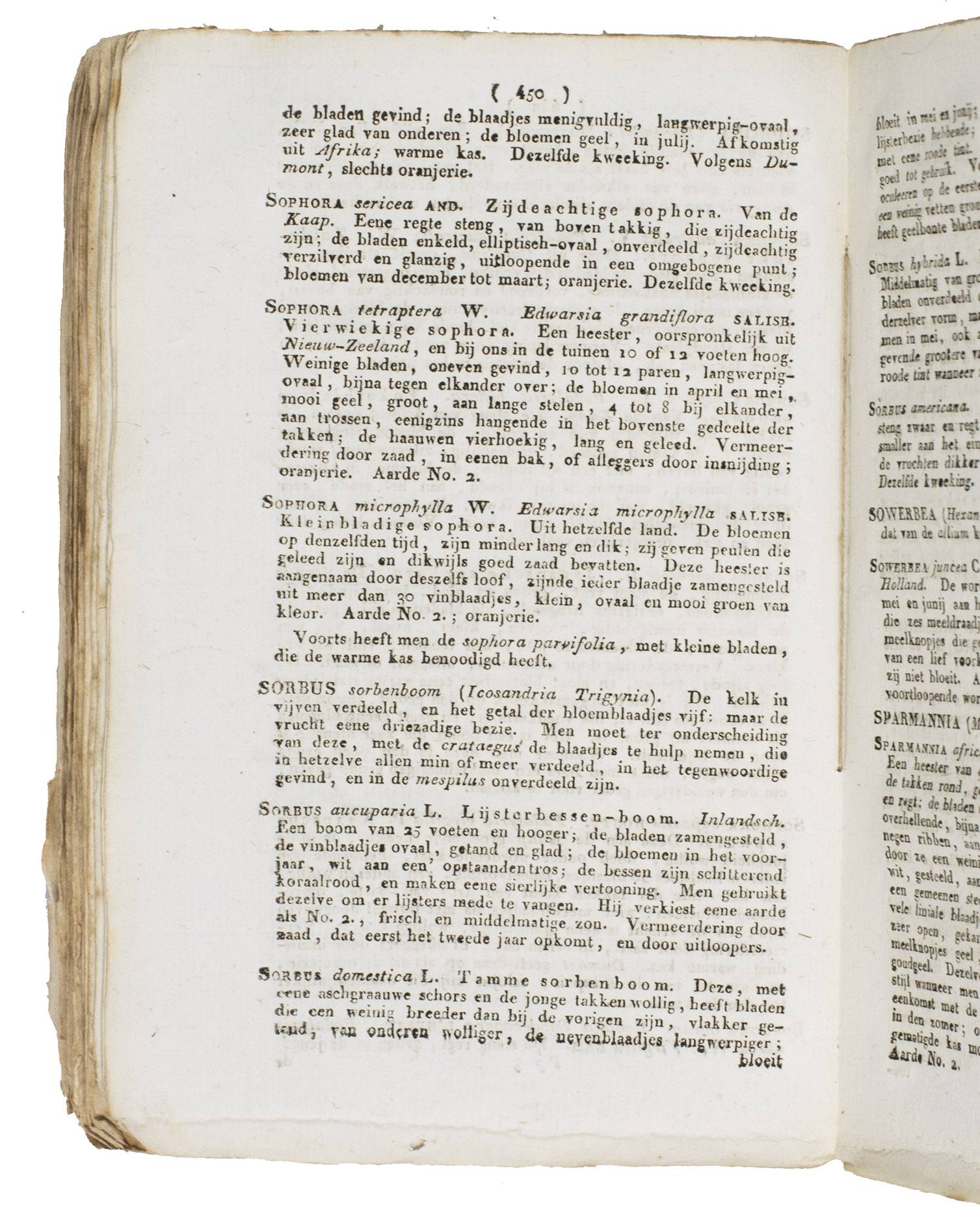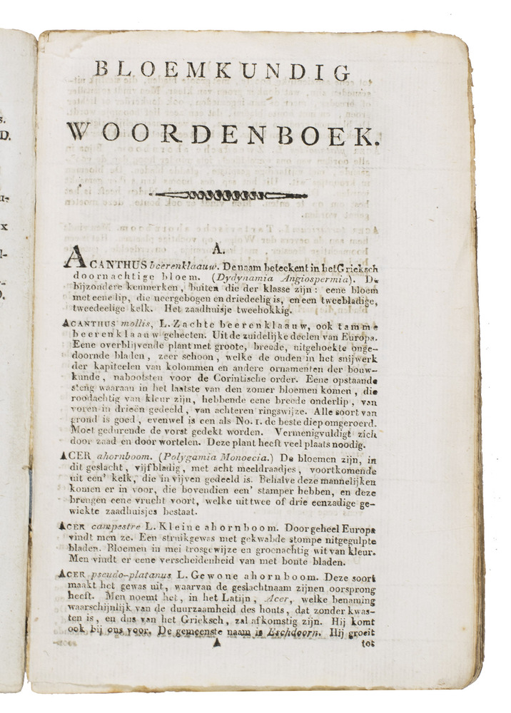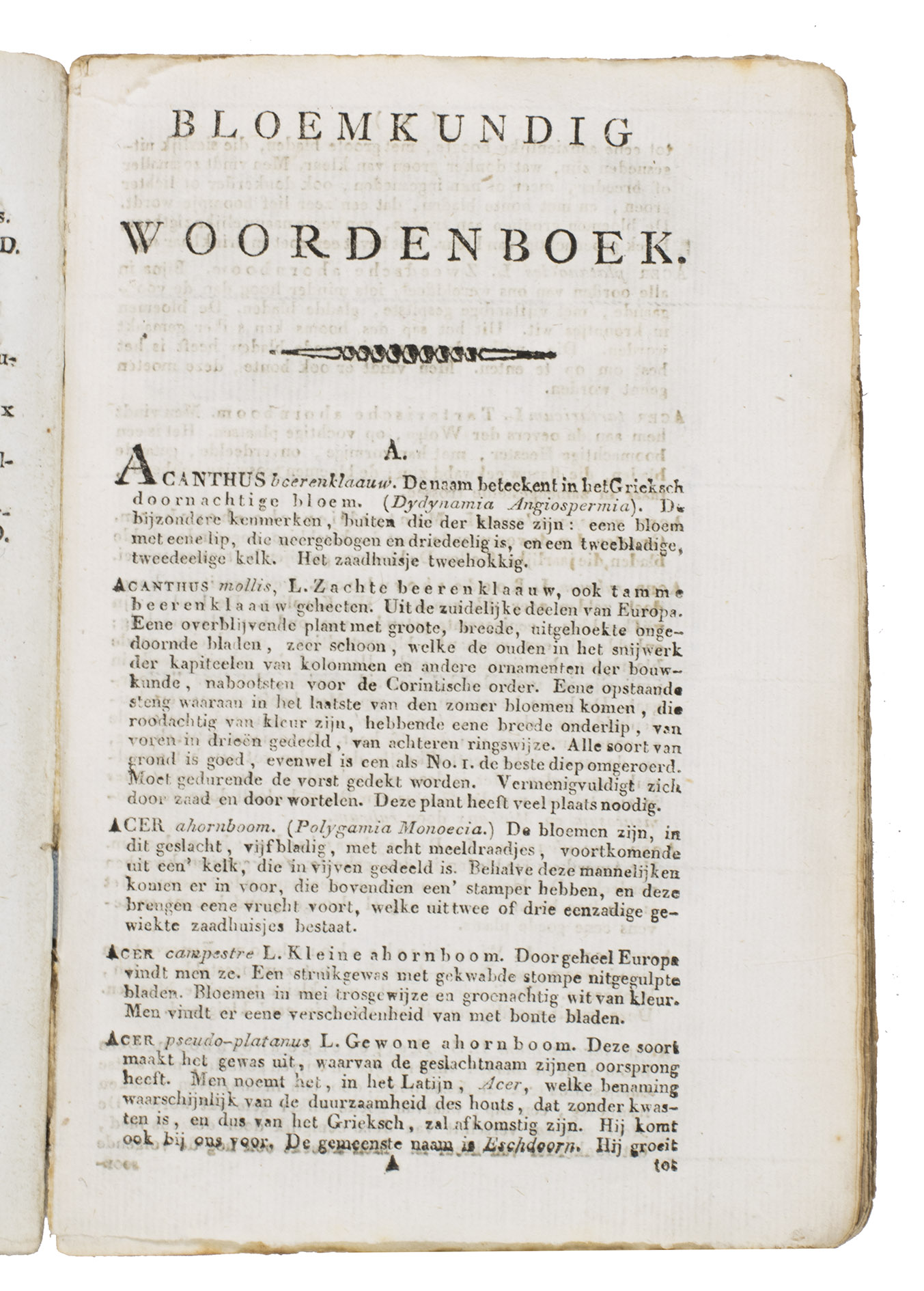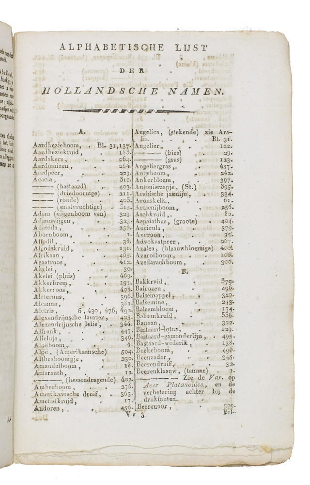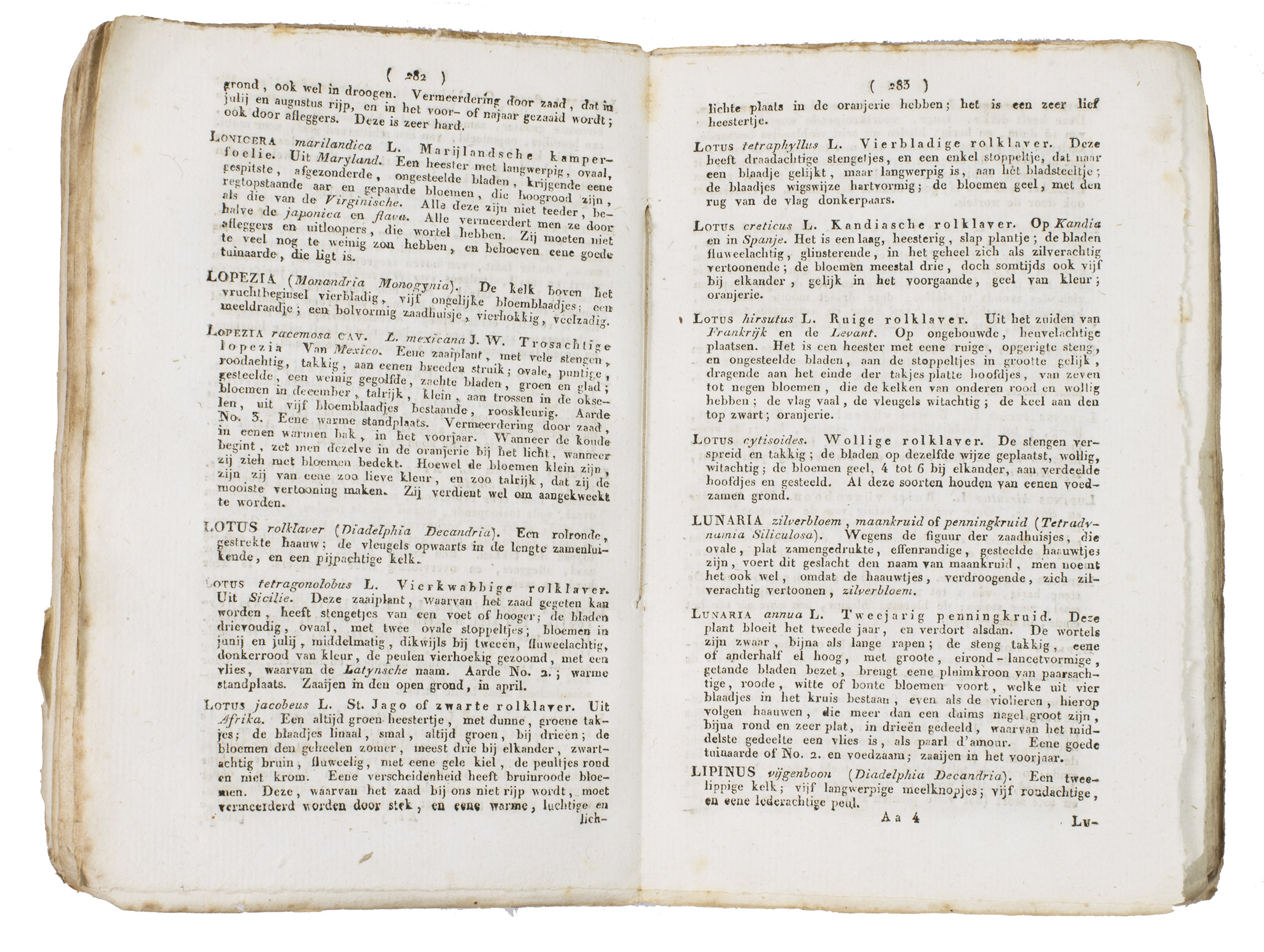 First edition of this extensive work on the cultivation and multiplication of plants and trees, accompanied by an introduction which explains the basics of horticulture. The work discusses hundreds of plants in alphabetical order, and gives important facts about their growth and development. All mentioned plants were considered suitable for Dutch gardens. The work was very accessible and easy to read for the general public. According to Van Eeden, it was so popular, that the publisher still received inquiries for it in the 1860s. However, since the information in it was no longer up-to-date by this time, the work was edited and re-published in 1868 as Hortus Batavus. The present work, however, is the first edition.