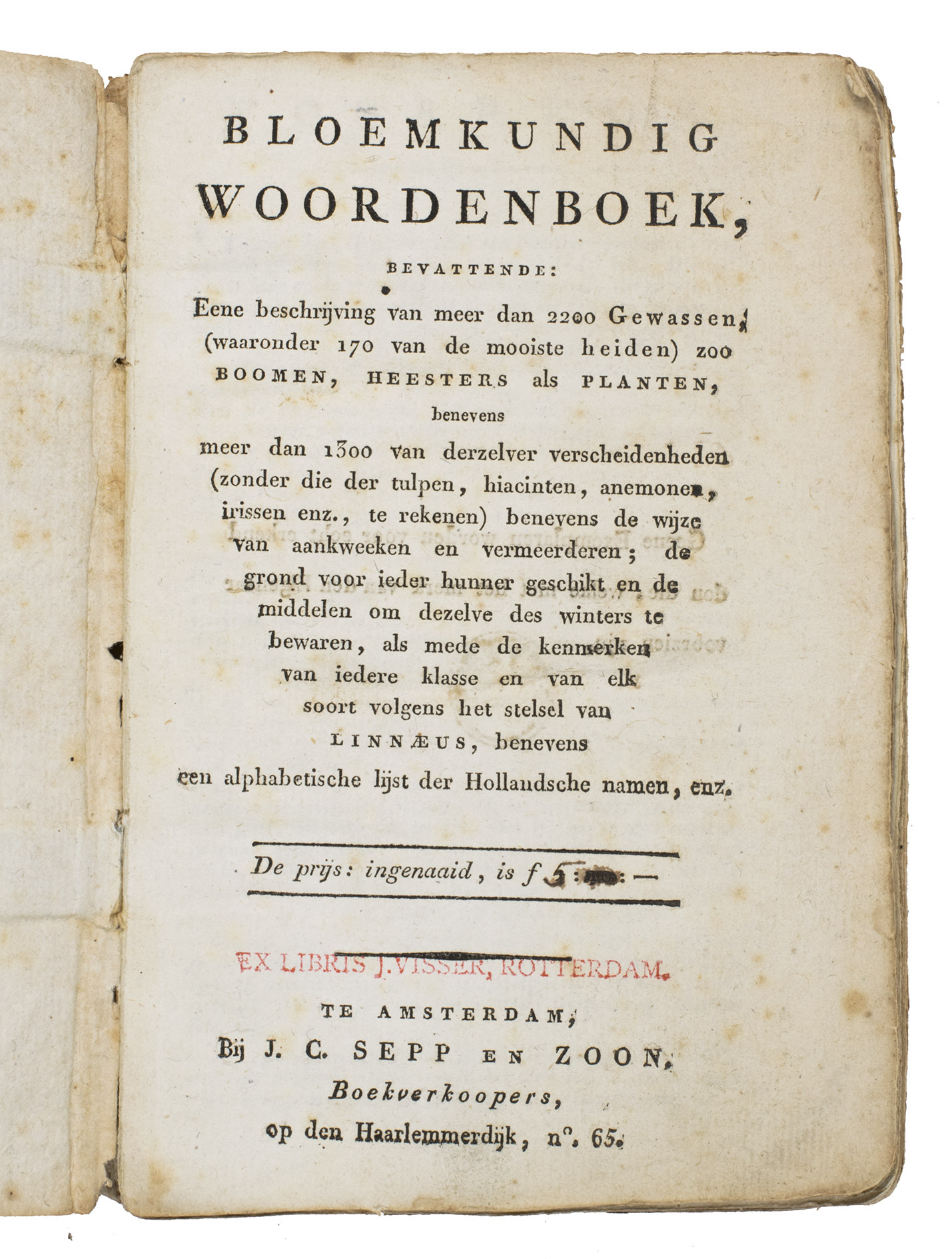 With a red ownership stamp ("Ex Libris J. Visser, Rotterdam") on the front wrapper and the title-page, the printed price of the work on the title-page has been corrected by hand. The edges and corners of the wrappers are frayed and the spine is damaged, with loss of material at the head and foot. The work is occasionally very slightly foxed and the edges are lightly browned. Otherwise in good condition. Cf. Eeden, F. W. van, Hortus Batavus, introduction; Stafleu & Cowan 1626; not in Pritzel.