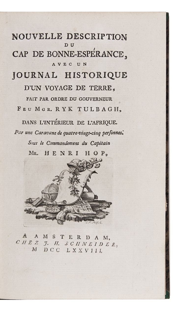 First and only edition of the French translation of a very interesting account of the Cape of Good Hope, together with an historical journal of an expedition into the interior of Africa, made by order of the late Governor Ryk Tulbach, with a force of 85 men under the command of Captain Henry Hope. The first part of the work contains an interesting description of the Cape. The journal making up the second part of this work contains no less interesting information on the fauna and flora, tribes and minerals met and found during the expedition to Namaqualand from 16 July 1761 to 27 August 1762 under the command of Henry Hop.