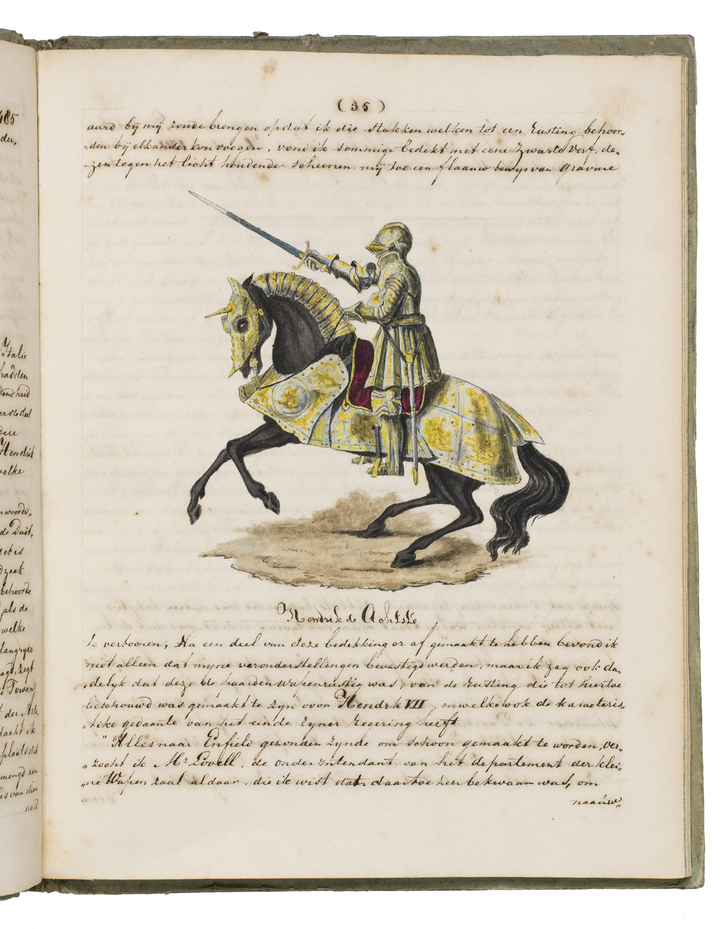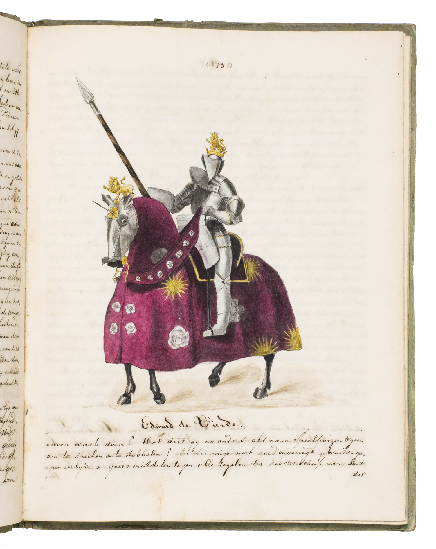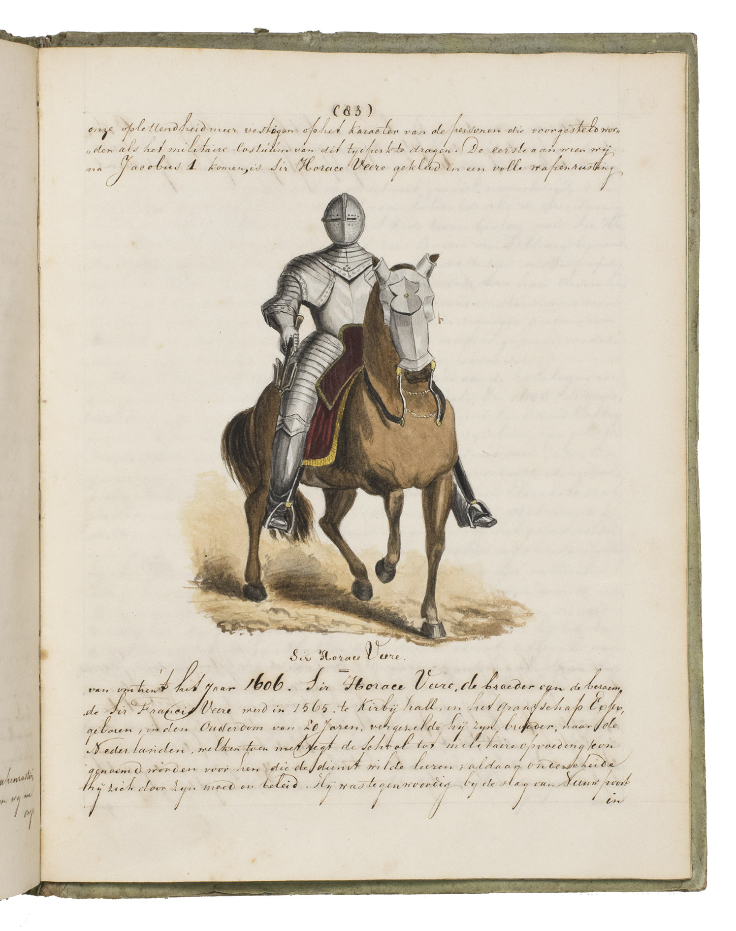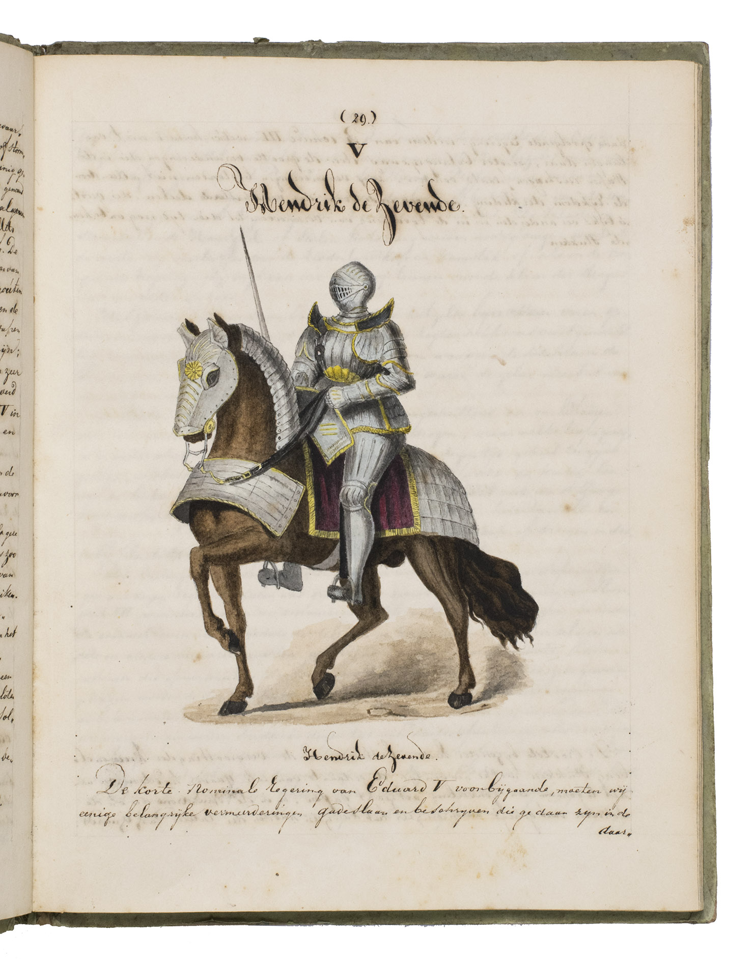 [The Netherlands, second quarter of the 19th century]. Ca. 21.5 x 17 cm. With 12 large, colourful ink drawings of knights on horseback, depicting various British kings and nobles, and a smaller ink drawing of knights in battle on the title-page. Contemporary green paper, over brown cloth, with a calligraphed title on the front in a baroque style floral frame, and a drawing of a knight on horseback on the back board within the same floral frame, blue speckled edges. [1], [1 blank], 105 pp.