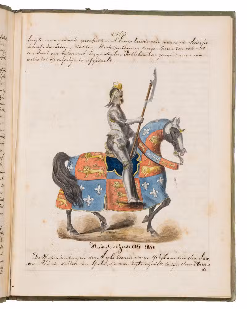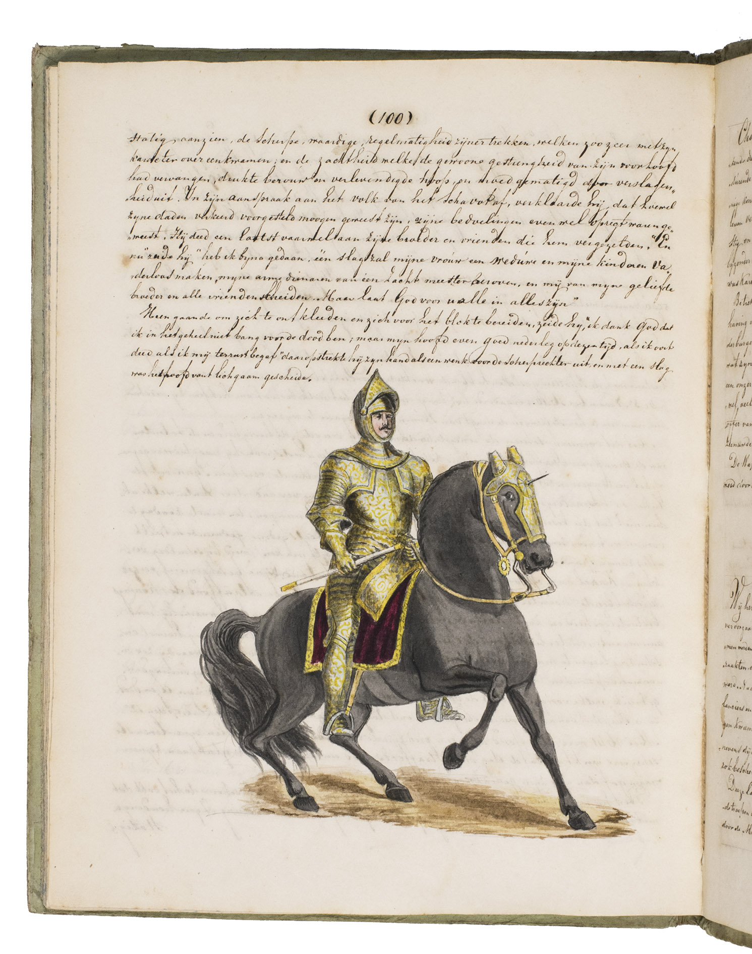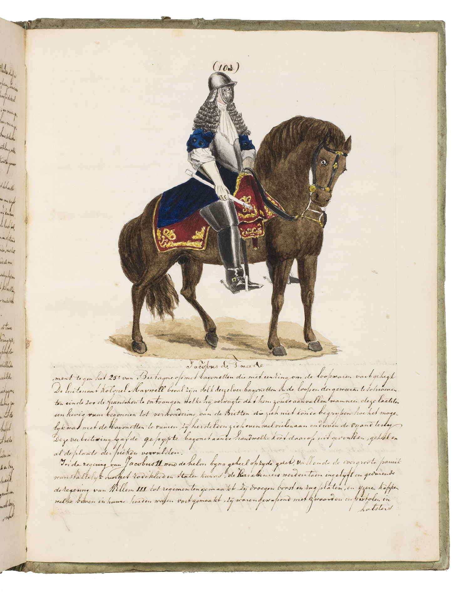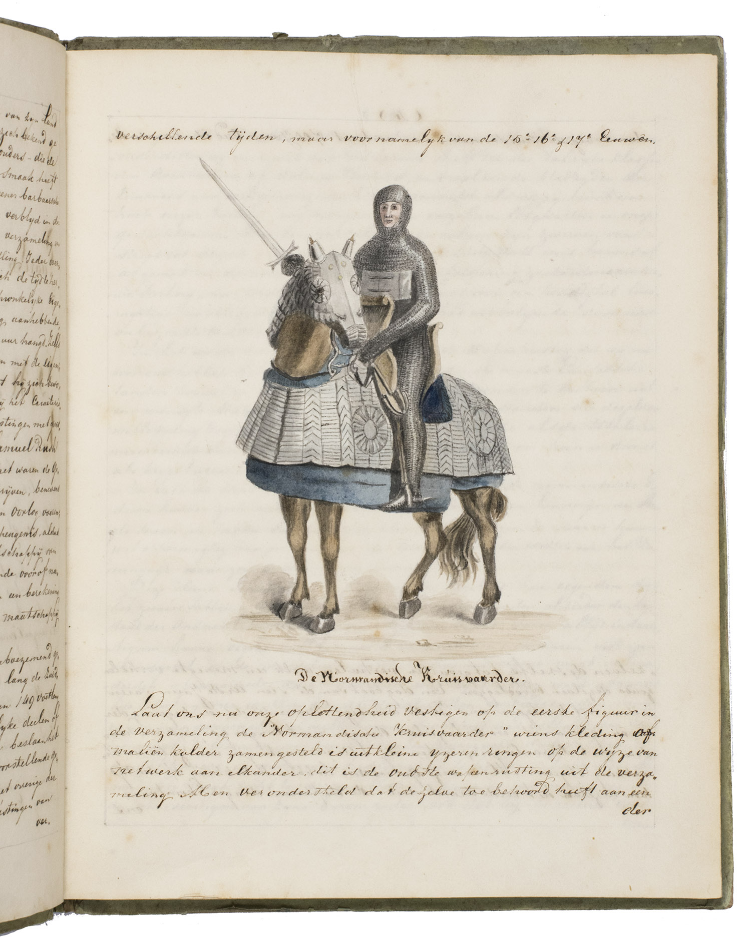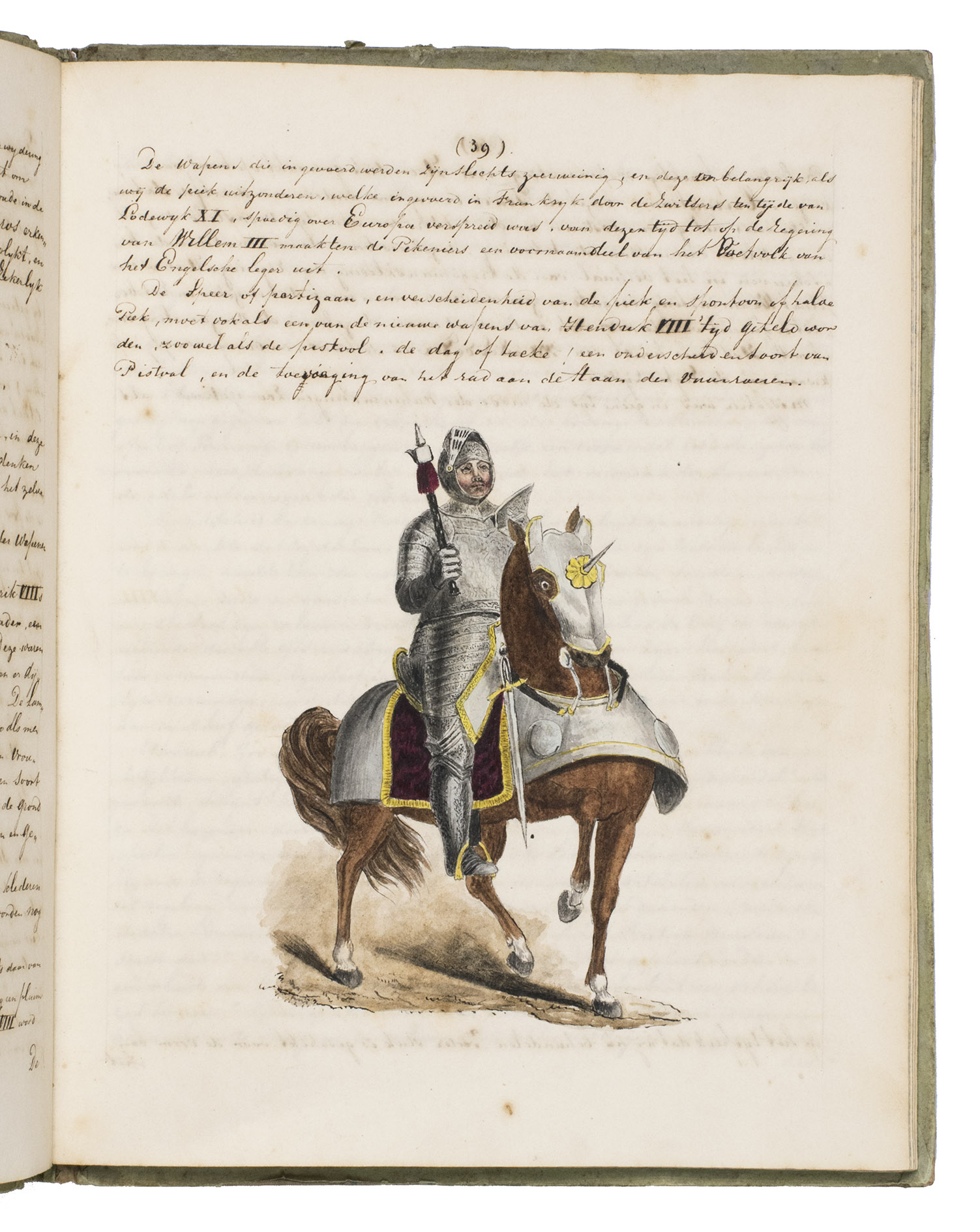 [The Netherlands, second quarter of the 19th century]. Ca. 21.5 x 17 cm. With 12 large, colourful ink drawings of knights on horseback, depicting various British kings and nobles, and a smaller ink drawing of knights in battle on the title-page. Contemporary green paper, over brown cloth, with a calligraphed title on the front in a baroque style floral frame, and a drawing of a knight on horseback on the back board within the same floral frame, blue speckled edges. [1], [1 blank], 105 pp.