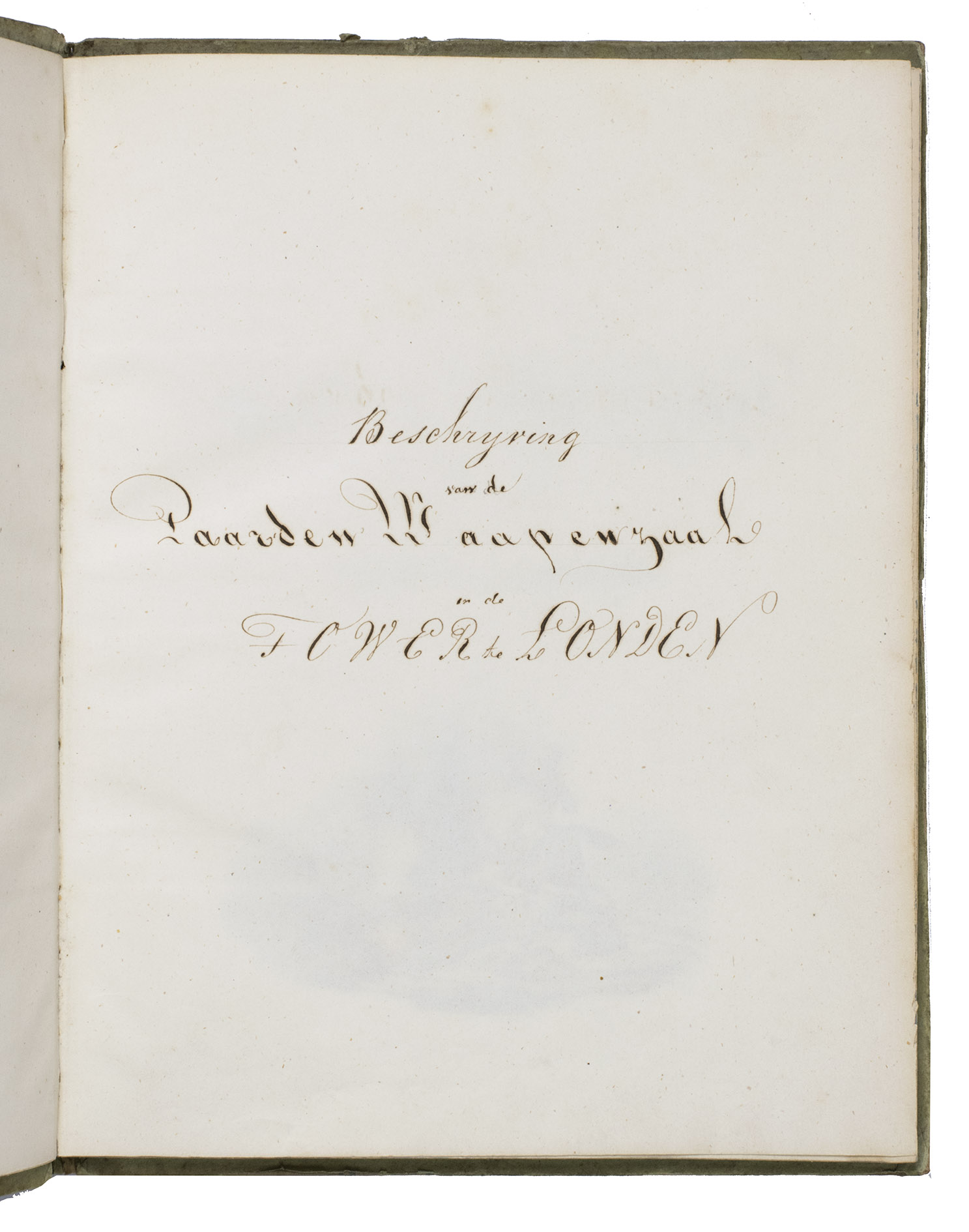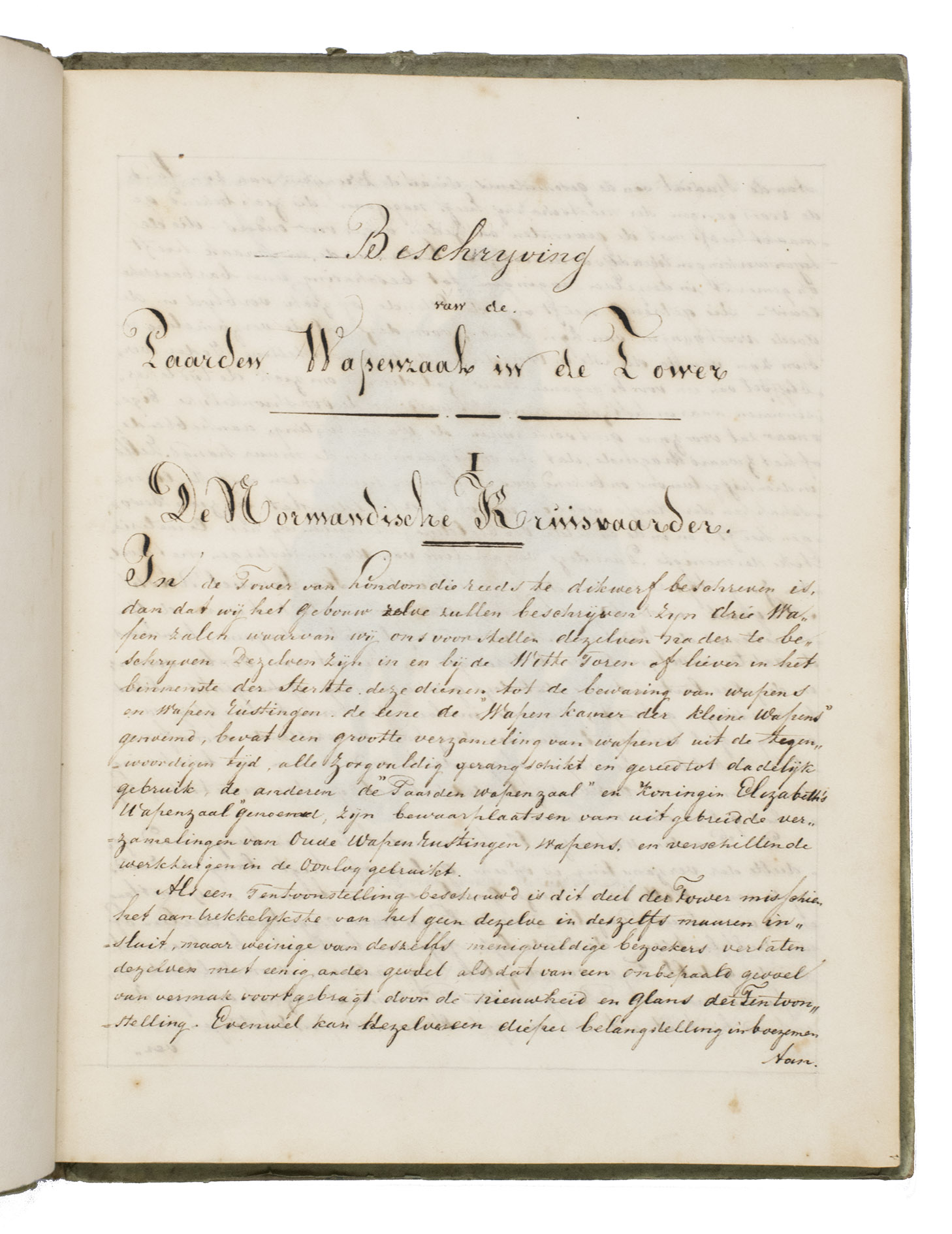 Remarkable manuscript with beautiful illustrations and descriptions of the displays in the Royal Armouries in the Tower of London. As the armoury was engulfed by a large fire in 1841, the largest in the history of the Tower of London, some of the depicted armour has been destroyed, making the present manuscript a unique source on these objects.