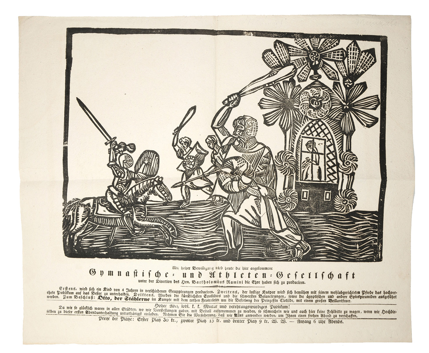 Very attractive early 19th-century broadside with a beautiful, large woodcut of a spectacular medieval show, enlivened with fireworks. The text below announces the show of a gymnastics (circus) company under the direction of Bartholomäus Ramini (dates unknown). According to the playbill, the show consisted of four parts: an acrobatic performance by a four-year old; a horse dressage by "lustige Kaspar"; an acrobatic act with, among others, balancing and a human pyramid; and a play of "Otto der Stählerne im Kampfe mit dem rothen Feuerriesen und die Befreiung der Prinzessin Clotilde" (translation: Otto the man of steel, fighting with the red fire giant and the liberation of Princess Clothilde), which included fireworks. This last part of the performance has also been mentioned as part of another circus show, which was held at Prague in June 1827, under the direction of a citizen of Prague named "Beranek" (Journal für Kunst, Literatur und geselliges Leben). The present broadside most likely announces the same theatre or circus company, now performing in a different location.