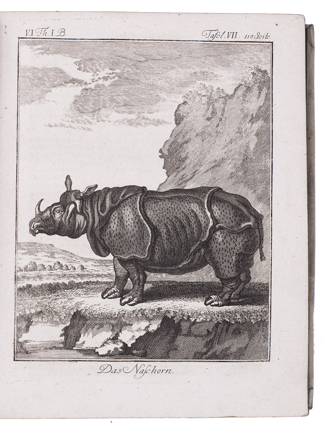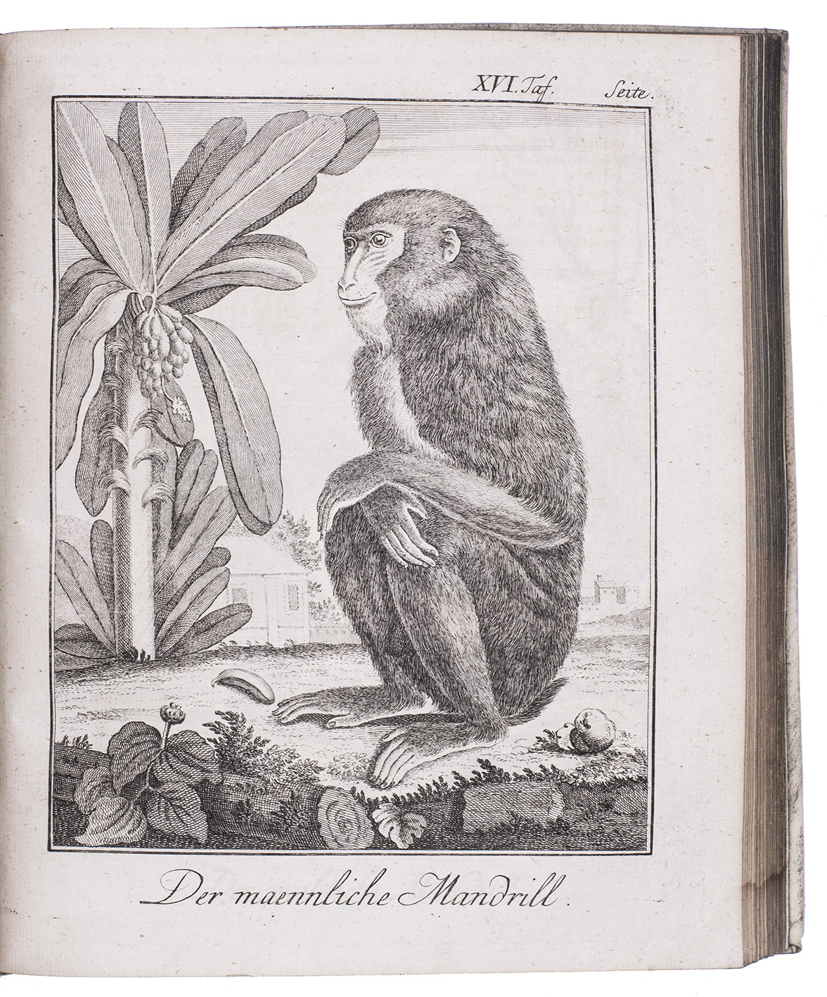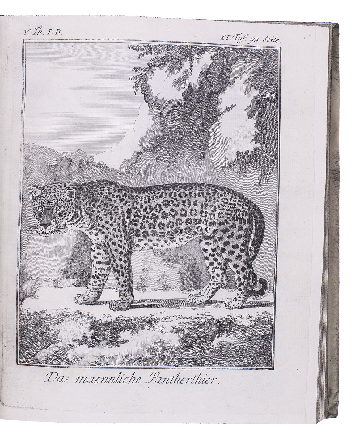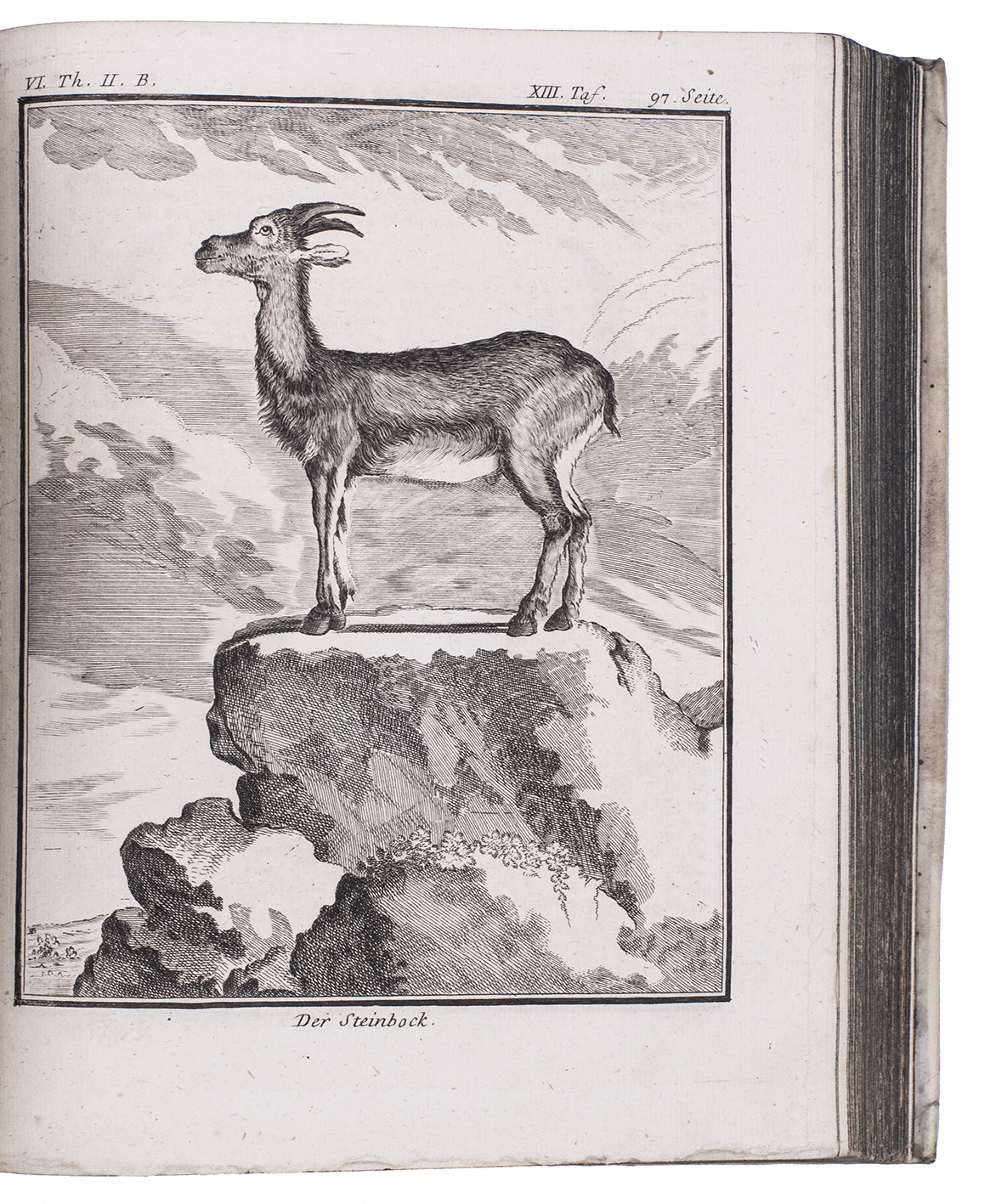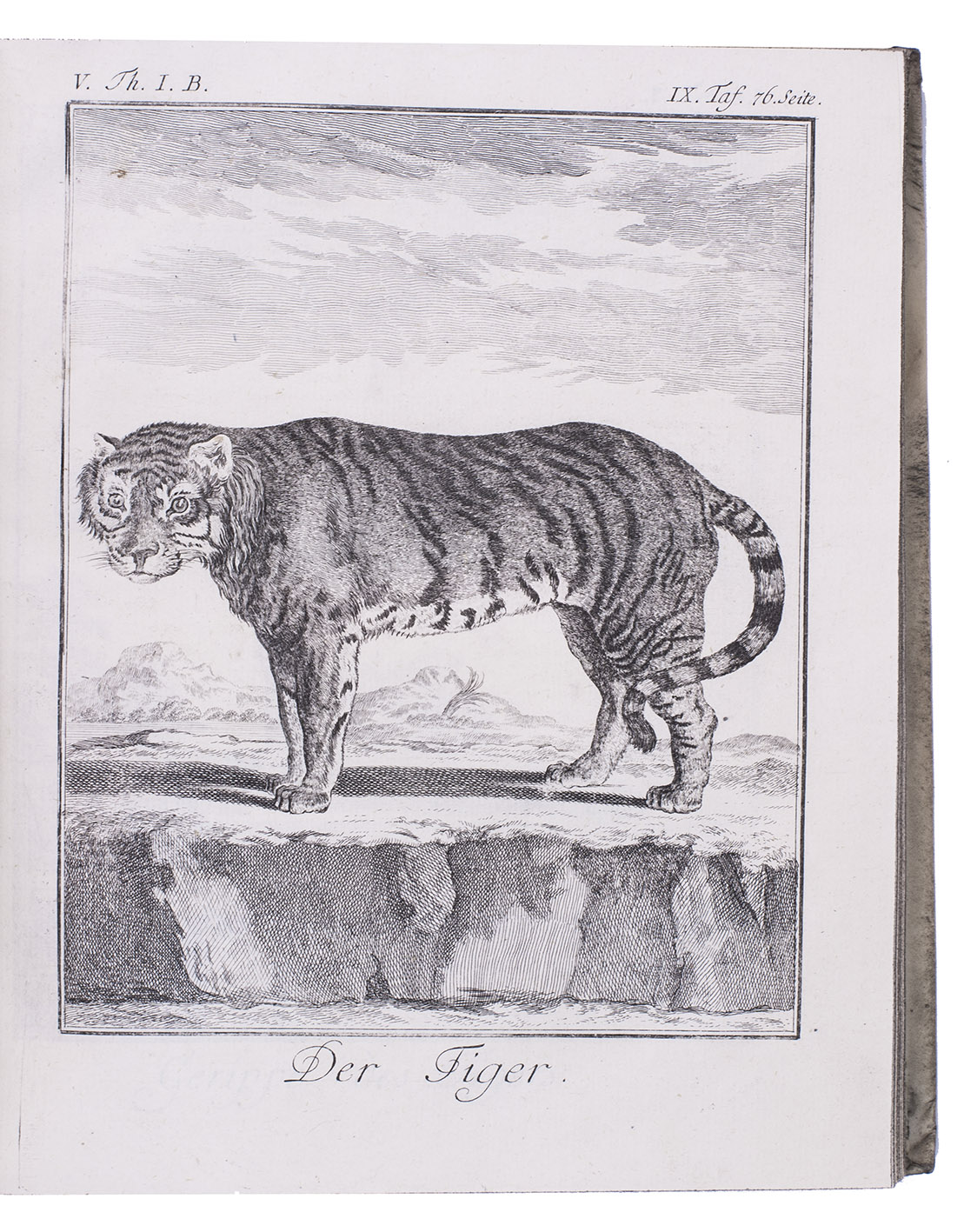 Very rare first edition of the German translation of Buffon's famous Histoire naturelle. Buffon's work presents ''for the first time a complete survey of natural history in popular form'' (PMM). The first volume contains Buffon's theoretical essays, including his essay on the earth where "for the first time he outlines a satisfactory account of the history of our globe and of its development as a fitting home for living things. In his view the earth had been originally part of the sun which was broken off by the impact of a comet. It gradually condensed from its gaseous state, and the forces shaping its continents and mountains are still active'' (PMM). This view of the universe not in a steady state but evolving was a revolutionary idea at the time, paving the way for Darwin in the following century. In his treatise on humans (volume II.1), Buffon ''studied the human species by the same methods that he applied to animal species, including the psychological, moral, and intellectual life of man. From his exhaustive research for the Histoire naturelle des quadrupèdes, Buffon came to the conclusion that it was necessary to reintroduce the notion of family. Breaking with the spirit of his time, Buffon attempted to separate science from metaphysical and religious ideas. As a disciple of Locke he denied idealistic metaphysics, stating that mental abstractions can never become principles of either existence or real knowledge; these can come only as the results of sensation'' (DSB). Volumes II-VIII deal with quadrupeds. The German edition was begun in 1750 but discontinued after the three volumes on ornithology in 1782 (not included here), while the original French, which had started in 1749, continued till 1804 and comprised eventually 44 volumes.