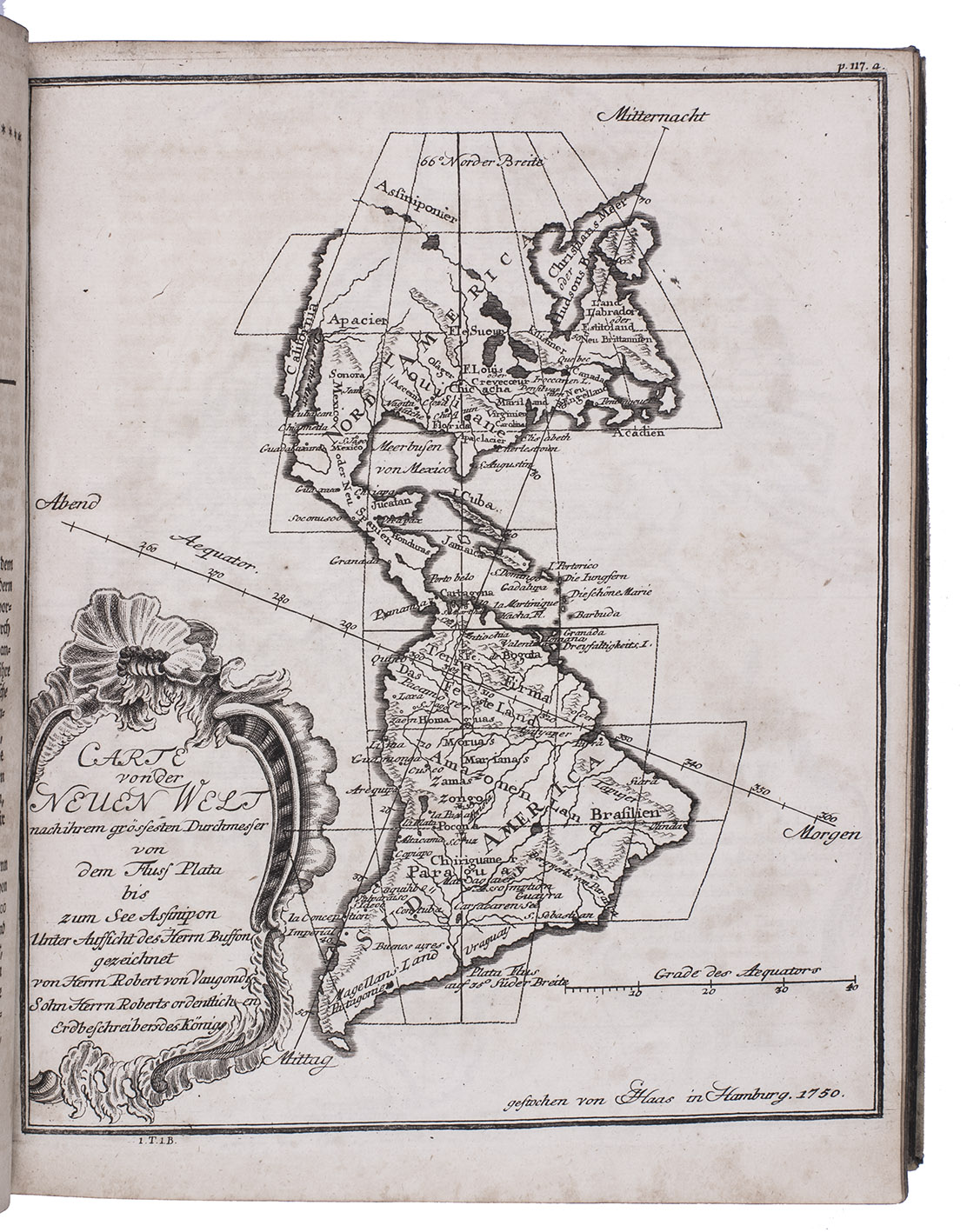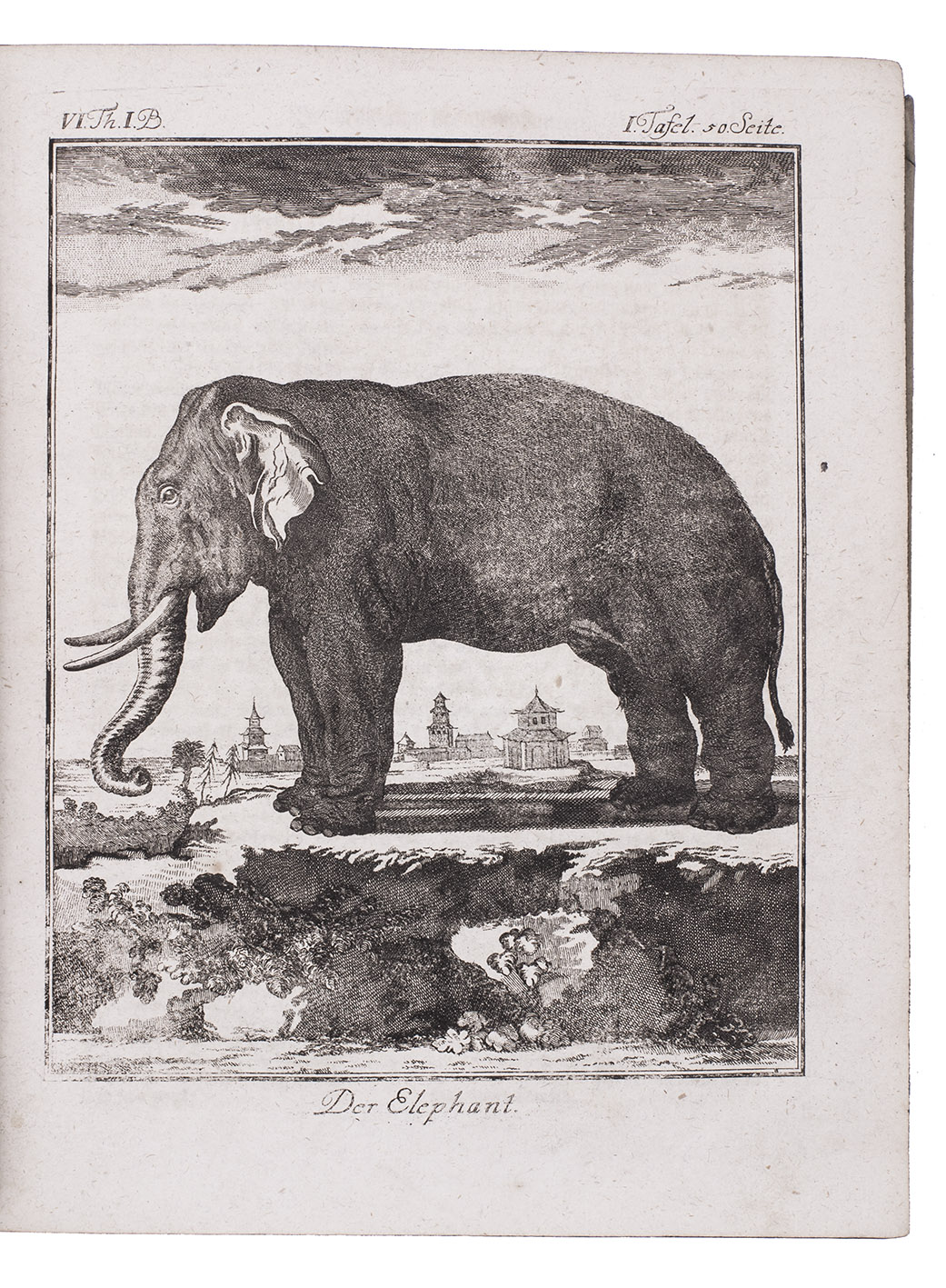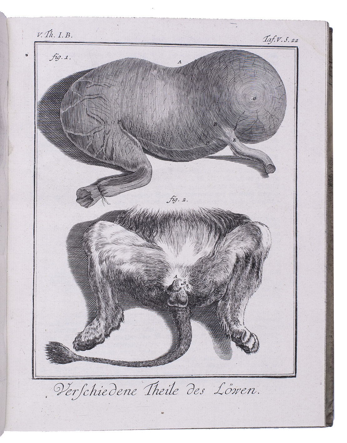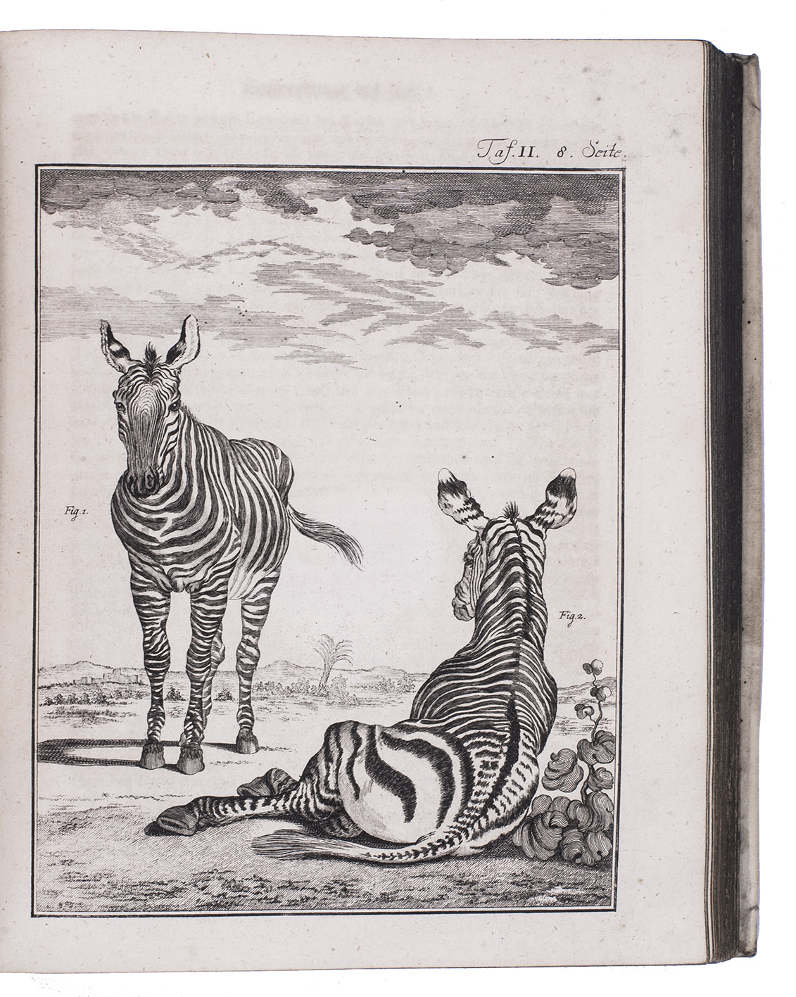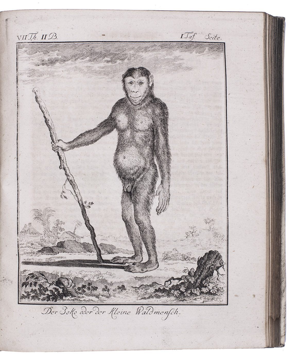 Very rare first edition of the German translation of Buffon's famous Histoire naturelle. Buffon's work presents ''for the first time a complete survey of natural history in popular form'' (PMM). The first volume contains Buffon's theoretical essays, including his essay on the earth where "for the first time he outlines a satisfactory account of the history of our globe and of its development as a fitting home for living things. In his view the earth had been originally part of the sun which was broken off by the impact of a comet. It gradually condensed from its gaseous state, and the forces shaping its continents and mountains are still active'' (PMM). This view of the universe not in a steady state but evolving was a revolutionary idea at the time, paving the way for Darwin in the following century. In his treatise on humans (volume II.1), Buffon ''studied the human species by the same methods that he applied to animal species, including the psychological, moral, and intellectual life of man. From his exhaustive research for the Histoire naturelle des quadrupèdes, Buffon came to the conclusion that it was necessary to reintroduce the notion of family. Breaking with the spirit of his time, Buffon attempted to separate science from metaphysical and religious ideas. As a disciple of Locke he denied idealistic metaphysics, stating that mental abstractions can never become principles of either existence or real knowledge; these can come only as the results of sensation'' (DSB). Volumes II-VIII deal with quadrupeds. The German edition was begun in 1750 but discontinued after the three volumes on ornithology in 1782 (not included here), while the original French, which had started in 1749, continued till 1804 and comprised eventually 44 volumes.
