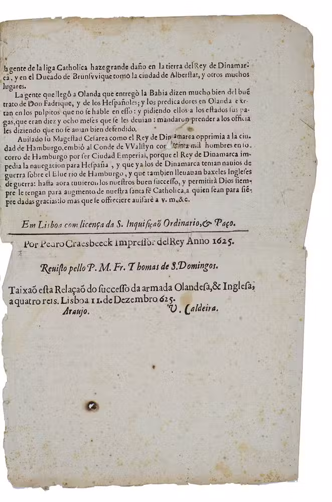 Rare Spanish propagandistic news publication emphasizing the success of the Spanish fleet against the English and Dutch during the Anglo-Spanish and Eighty Years' War, discussing the heavy losses of the Anglo-Dutch fleet on their way to Cádiz in 1625. In 1624, negotiations for the marriage between Charles, Prince of Wales, son of King James I, and the Spanish infanta Maria, sister of Philip IV, broke down and war broke out because the Spanish court could not accept a marriage as long as Charles refused to convert to Catholicism. In 1625, the English prepared a fleet to sail to Spain, more specifically Cádiz, an important trading port of the Spanish silver fleet.
