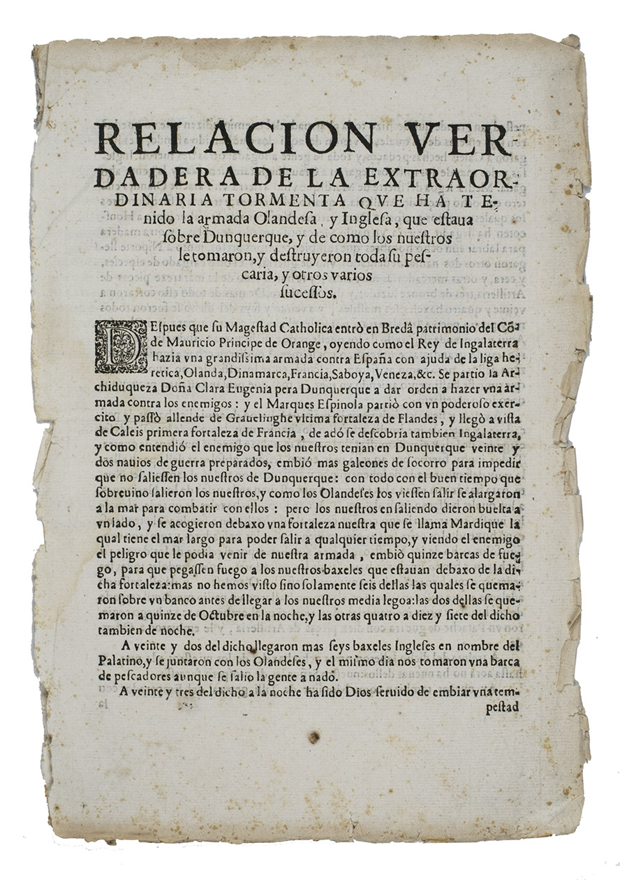 The present publication can be seen as Spanish propaganda presented as "news", emphasizing their victories. While sailing to Cádiz, the Anglo-Dutch fleet came in heavy weather near Dunkirk. The text describes in great detail how ships went down or how they were captured, but also the drowning of many people on board. The present publication in Spanish was printed in Lisbon, in 1625 still under the rule of the Spanish monarchs (the Crown of Portugal was united with the Crowns of Castile and Aragon from 1580 to 1640). It is an outstanding example of the Spanish annus mirabilis, praising the Spanish victories during the wars with England and the Dutch Republic.