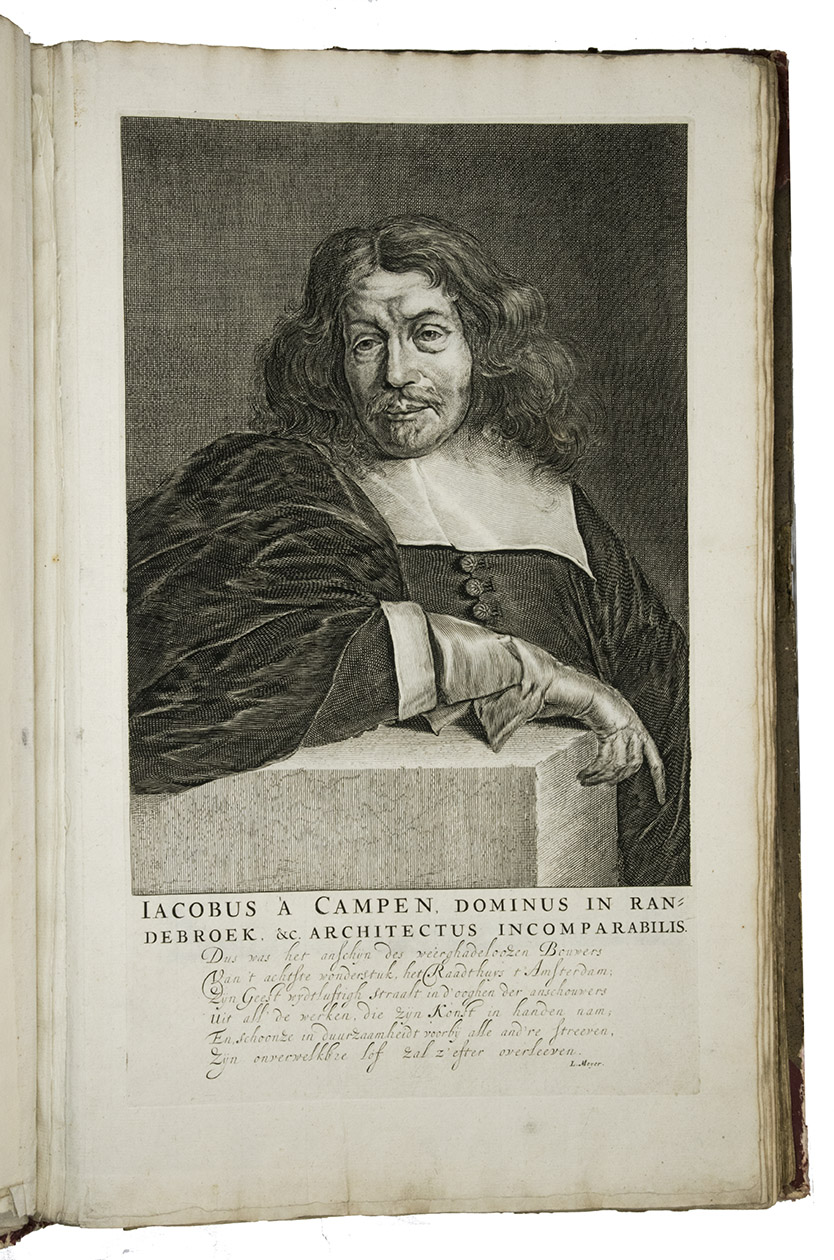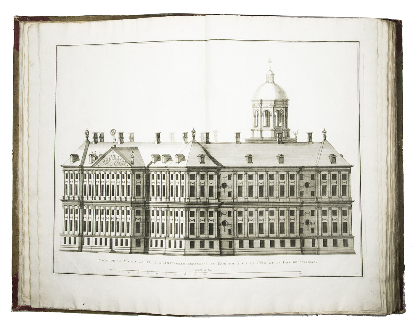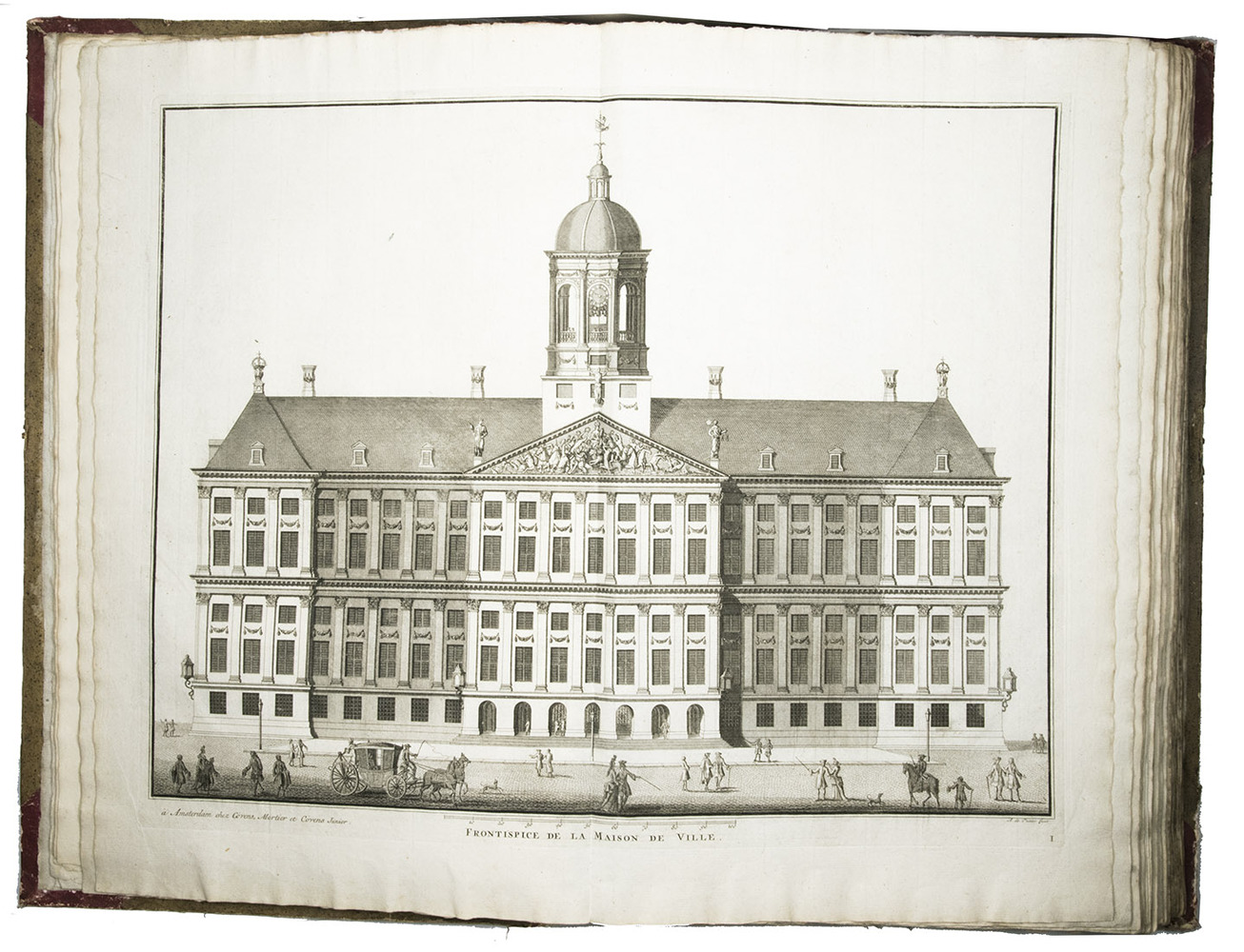 Binding a little worn, untrimmed, otherwise in good condition. The Amsterdam city hall in full glory with all its architectural features and sculpture. BAL 132 note (description of 1719 French language ed. but citing Berlin Kat. & Kuyper for unseen "1730" Dutch ed.); Berlin Kat. 2236; Kuyper, Dutch Classicist architecture (Delft, 1980), pp. 212- 215 and note 25 (p. 318); STCN (3 copies); cf. for dating the impressum: Van Egmond, Covens & Mortier (2005), pp. 66, 83-88.