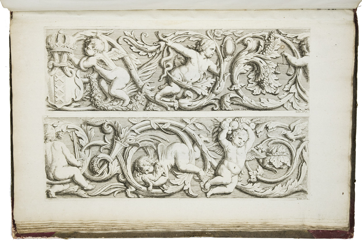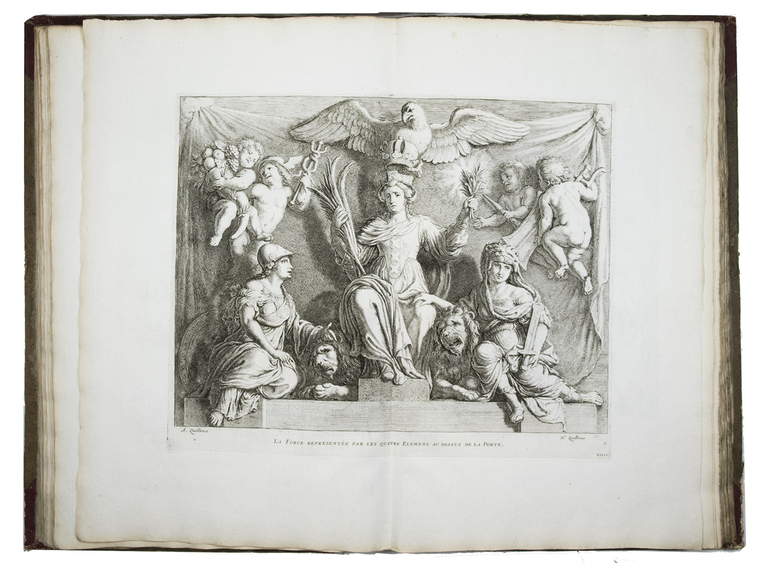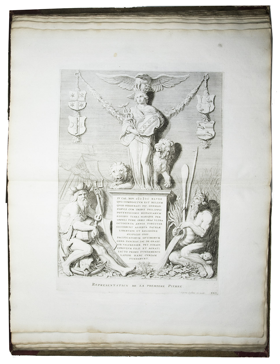 A comprehensive collection of plates showing all architectural features and sculpture of the Amsterdam City Hall, since 1808 the Royal Palace, here in the Covens & Mortier firm's rare ca. 1780 issue with the engravings newly printed from the original copper plates from the years 1655 to 1664 and the text reissued from Leonardus Schenk's 1747 Dutch language edition, the whole with a new title-page. ''This version has not been seen'' (BAL). At least most of the plates were engraved for and first published in Jacob van Campen's masterpiece Afbeelding van 't stadt huys van Amsterdam (Amsterdam, Frederick de Wit, 1664), Hubert Quiellinus's Prima [et secunda] pars praecipuarum ... curiae Amstelrodamenis (Amsterdam, Frederick de Wit 1655-1663) and Afbeelding van 't stadt huys van Amsterdam in dartigh coopere plaaten ... geteeckent door Jacob Vennekool (Amsterdam, Dancker Danckerts, 1661).
