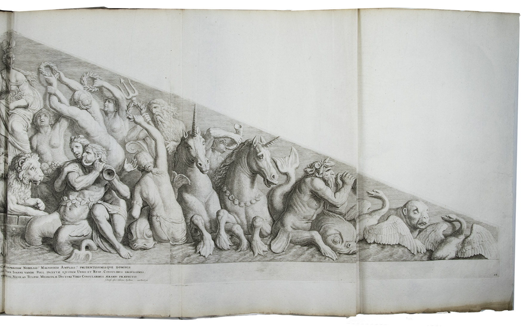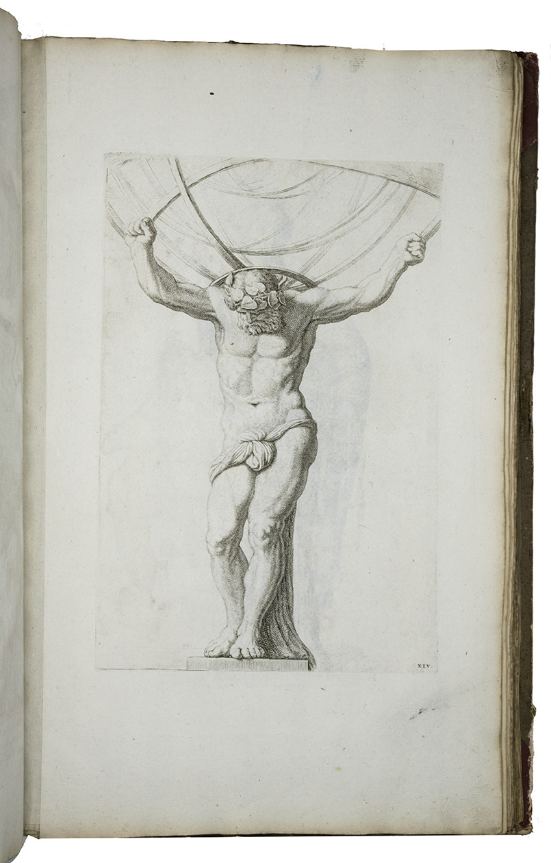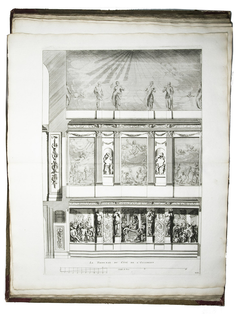 A comprehensive collection of plates showing all architectural features and sculpture of the Amsterdam City Hall, since 1808 the Royal Palace, here in the Covens & Mortier firm's rare ca. 1780 issue with the engravings newly printed from the original copper plates from the years 1655 to 1664 and the text reissued from Leonardus Schenk's 1747 Dutch language edition, the whole with a new title-page. ''This version has not been seen'' (BAL). At least most of the plates were engraved for and first published in Jacob van Campen's masterpiece Afbeelding van 't stadt huys van Amsterdam (Amsterdam, Frederick de Wit, 1664), Hubert Quiellinus's Prima [et secunda] pars praecipuarum ... curiae Amstelrodamenis (Amsterdam, Frederick de Wit 1655-1663) and Afbeelding van 't stadt huys van Amsterdam in dartigh coopere plaaten ... geteeckent door Jacob Vennekool (Amsterdam, Dancker Danckerts, 1661).