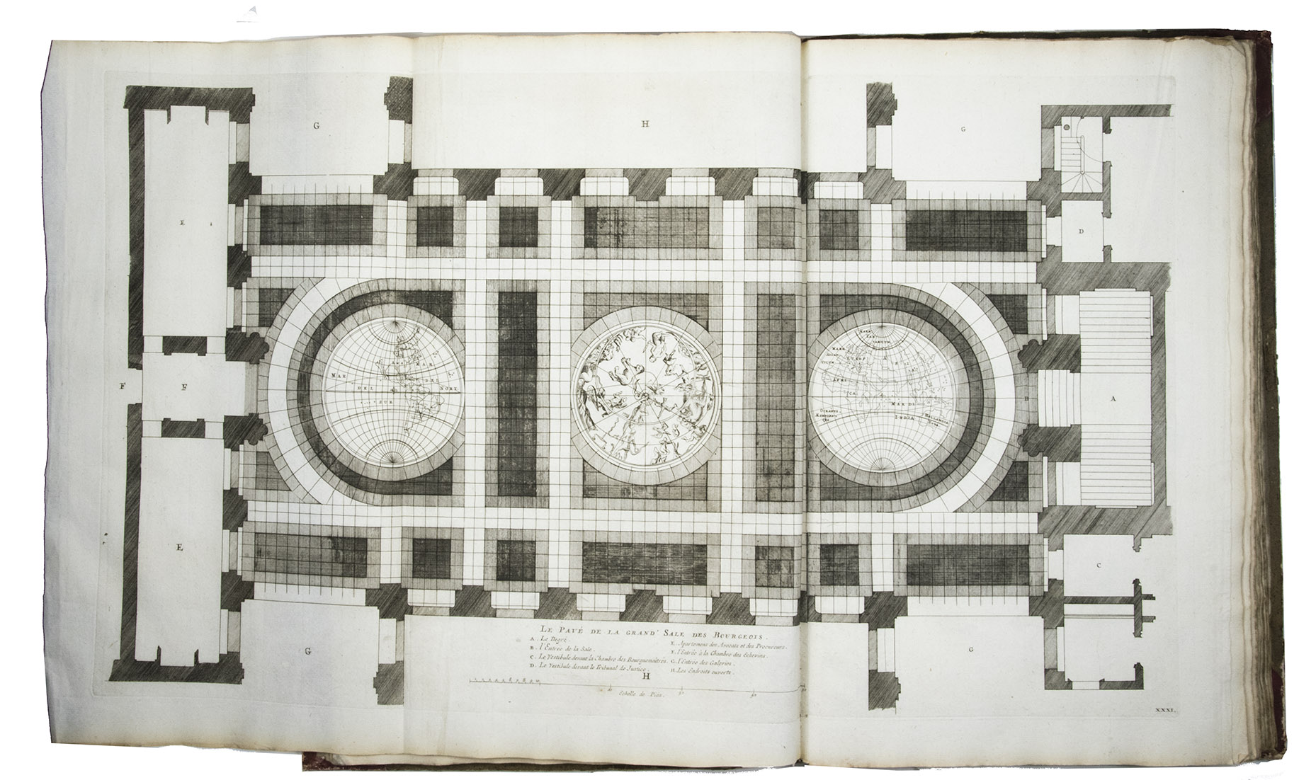 It includes the famous plate showing the extraordinary cartographic mosaic floor of the Burgerzaal of the Amsterdam City Hall, designed by Jacob van Campen, with a celestial map in the centre and the magnificent map of the world in 2 hemispheres on either side. The engraving was first published in 1661, and the map shows Tasman's recent discoveries in Australia and Tasmania, and depicts California as an island. Many discoveries from his second voyage remained otherwise unpublished until the end of the 17th century. The drawing of the floor was made by Jacob Vennekool who worked closely with Van Campen, and since his drawings were first published even before the building was completed, they may reflect Van Campen's plan more closely than the finished building itself. They also, of course, show it before the alterations made at various times in later years.