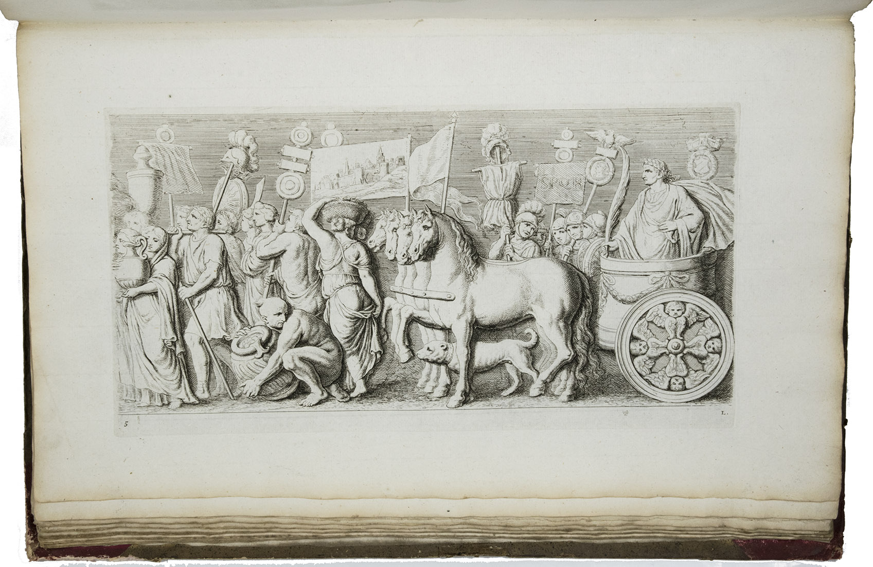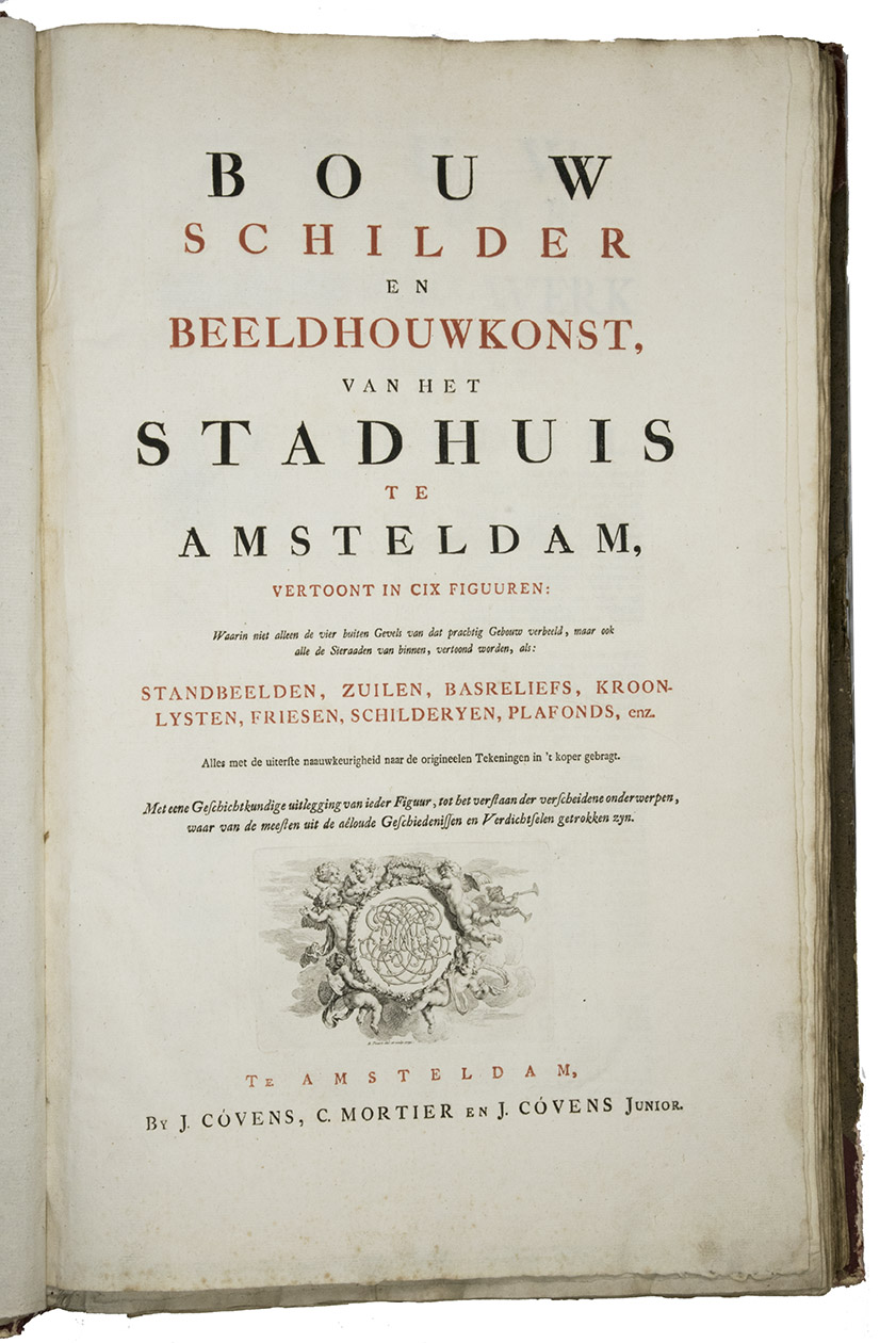 Amsterdam, Johannes Covens, Cornelis Mortier and Johannes Covens junior, [ca. 1758?, ca. 1767? or possibly 1772/83]. Large folio (49.5 x 30 cm). With the title page printed in red and black with J. Covens & C. Mortiers engraved device by Bernard Picart ("JCCM" cypher monogram in a laurel wreath carried by 6 putti, dated 1730); 2 preliminary plates containing portraits of Jacob van Campen [by Lutma] and Arthus Quellinus by Henricus Quellinus; CIX (109) numbered engraved and etched architectural plates. All plates have French captions, some with laudatory verses below, and are described in Dutch in the letterpress text (pp. 3-15). Contemporary half red roan (sheepskin), brown sprinkled paper sides. 15 pp.