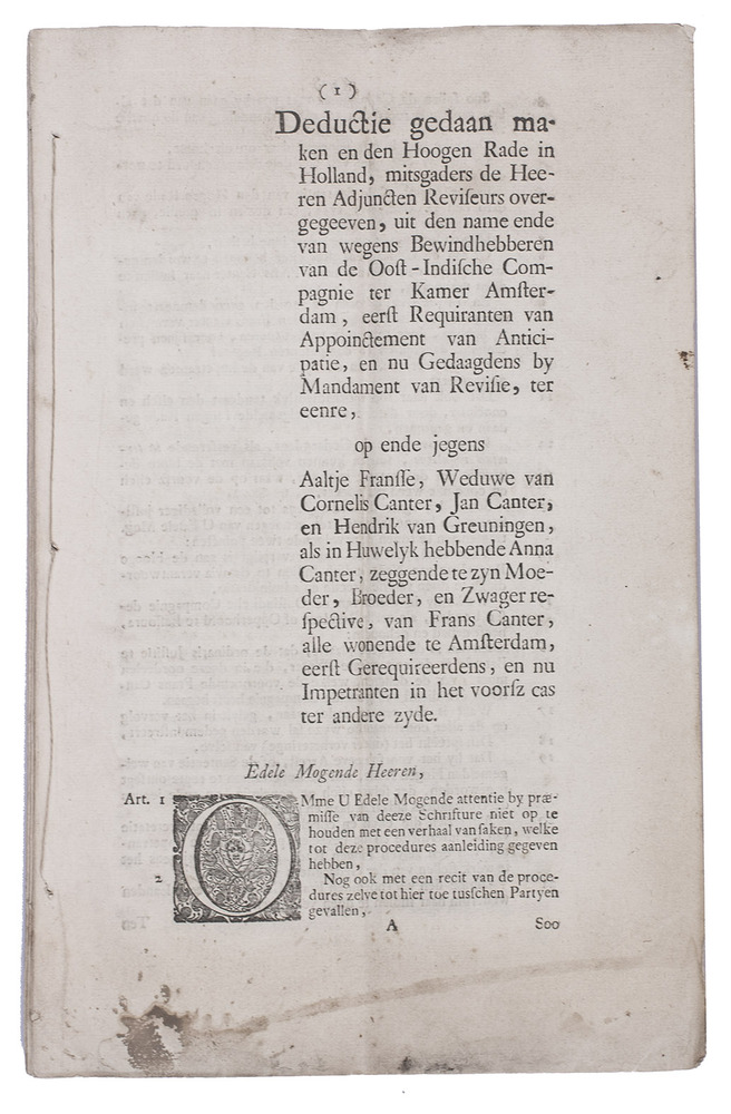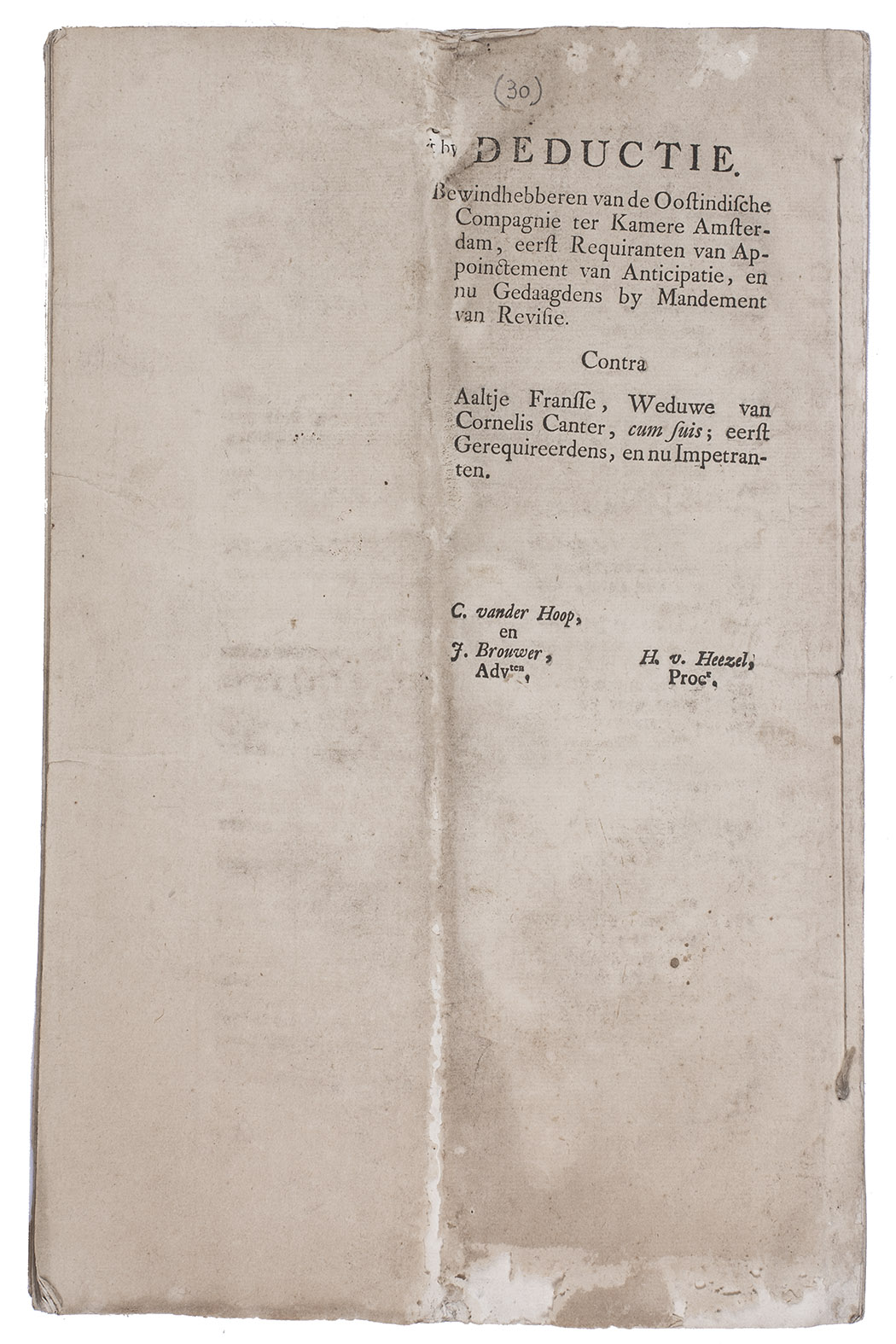 Deductie gedaan ... uit den name ende van wegens bewindhebberen van de Oost-Indische Compagnie ter kamer Amsterdam, eerst requiranten van appoinctement van anticipatie, en nu gedaagdens by mandament van revisie, ter eenre, op ende jegens Aaltje Fransse, weduwe van Cornelis Canter, Jan Canter, en Hendrik van Greuningen, als in huwelyk hebbende Anna Canter, zeggende te zyn moeder, broeder, en zwager respective, van Frans Canter, alle wonende te Amsterdam, ...