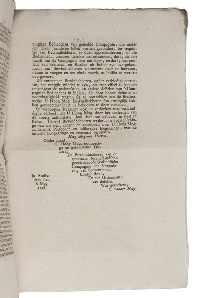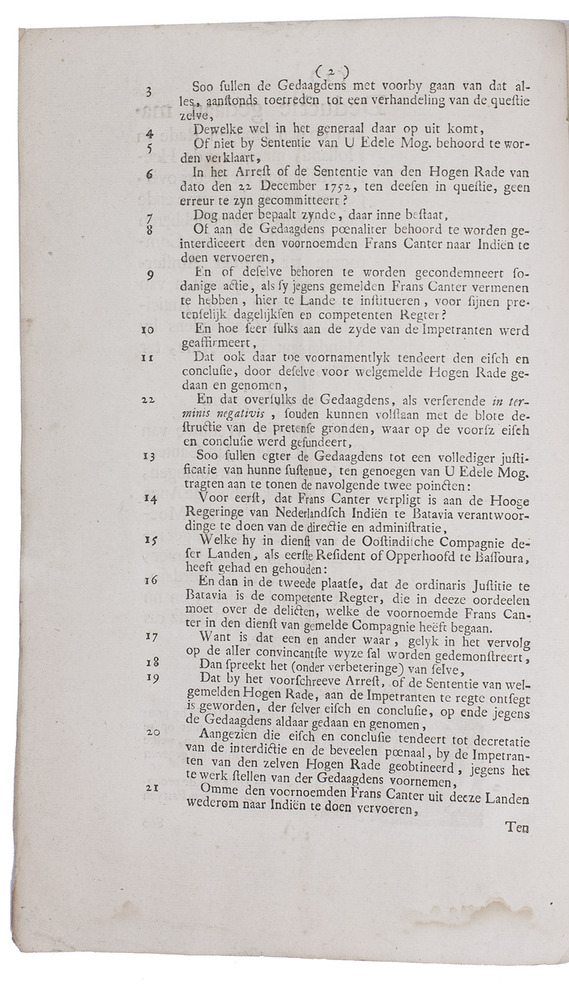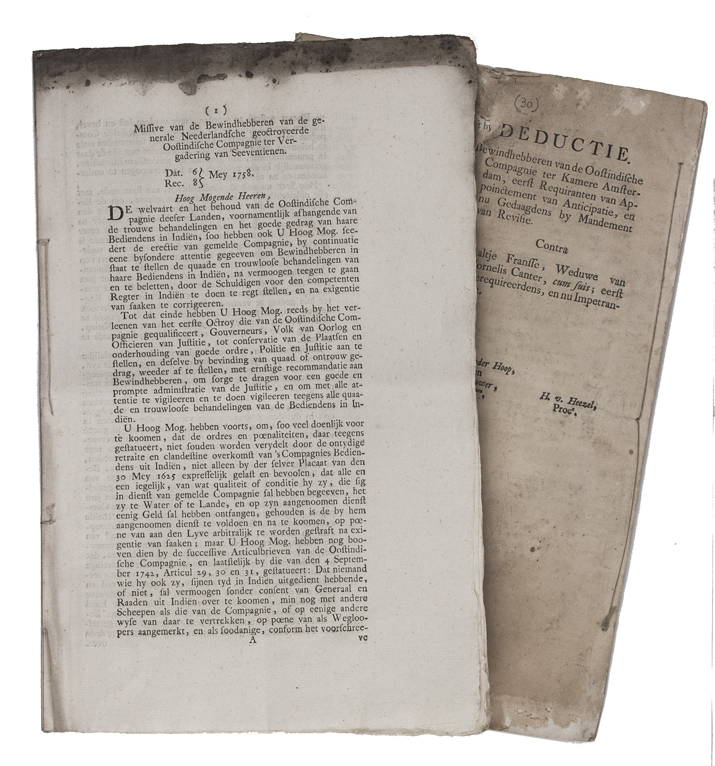Rare first and only edition of a legal injunction against the mother, father and brother-in-law of Frans Canter, manager of the VOC (Dutch East India Company) factory at Basra in southern Iraq from 1746 to 1750, who upon a summons to Batavia (apparently regarding misconduct), fled to Europe. Added is an even rarer missive from the directors of the VOC, on the misconduct of the company's personnel, including a summary of the case against Canter. In this period the VOC was plagued by rising debts and corruption.