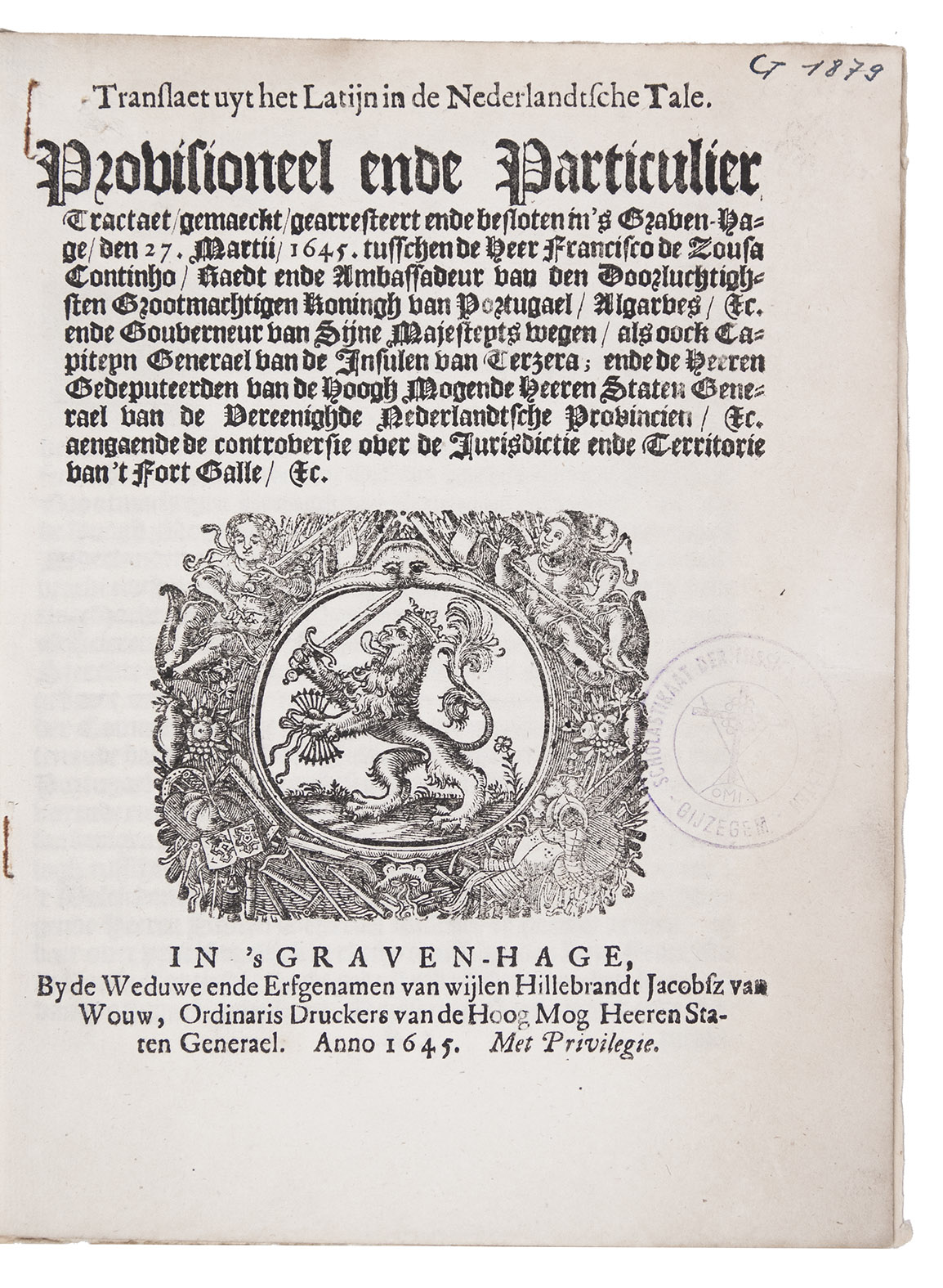 Provisioneel ende particulier tractaet, gemaeckt, gearresteert ende besloten in 's Graven-Hage, den 27. Martii, 1645. tusschen de heer Francisco de Zousa Continho, raedt ende ambassadeur van den doorluchtighsten grootmachtigen Koningh van Portugael, Algarves, &c. ...; ende de ... Staten Generael van de Vereenighde Nederlandtsche Provincien, &c. aengaende de controversie over de jurisdictie ende territorie van 't Fort Galle [in Ceylon], &c.