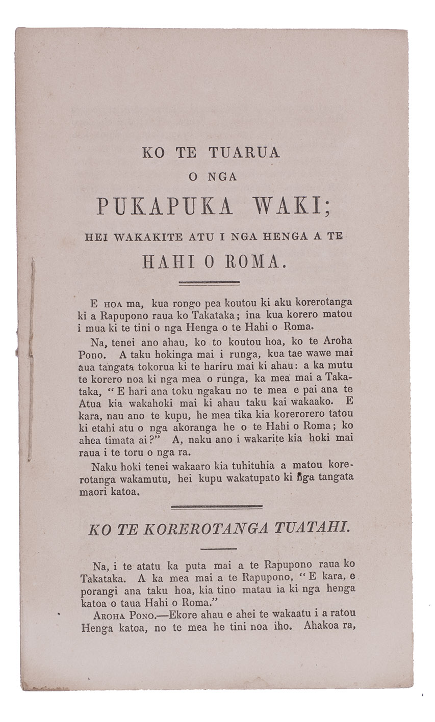 First edition, printed in Tasmania in the Maori language, of an anti-Catholic pamphlet by William Colenso (1811-1899), printer, missionary, botanist and explorer in New Zealand, containing three dialogues between "Rapupono" ("Truth Seeker") and "Aroha Pono" ("True Love", the pen-name Colenso used in his religious polemics) exposing what he saw as six errors in the Roman Catholic Church. These are additional to six that he had discussed in a pamphlet with three similar dialogues earlier in the same year.