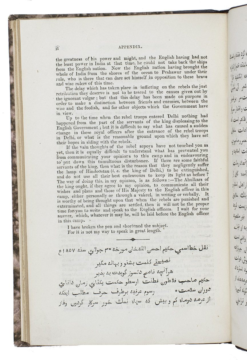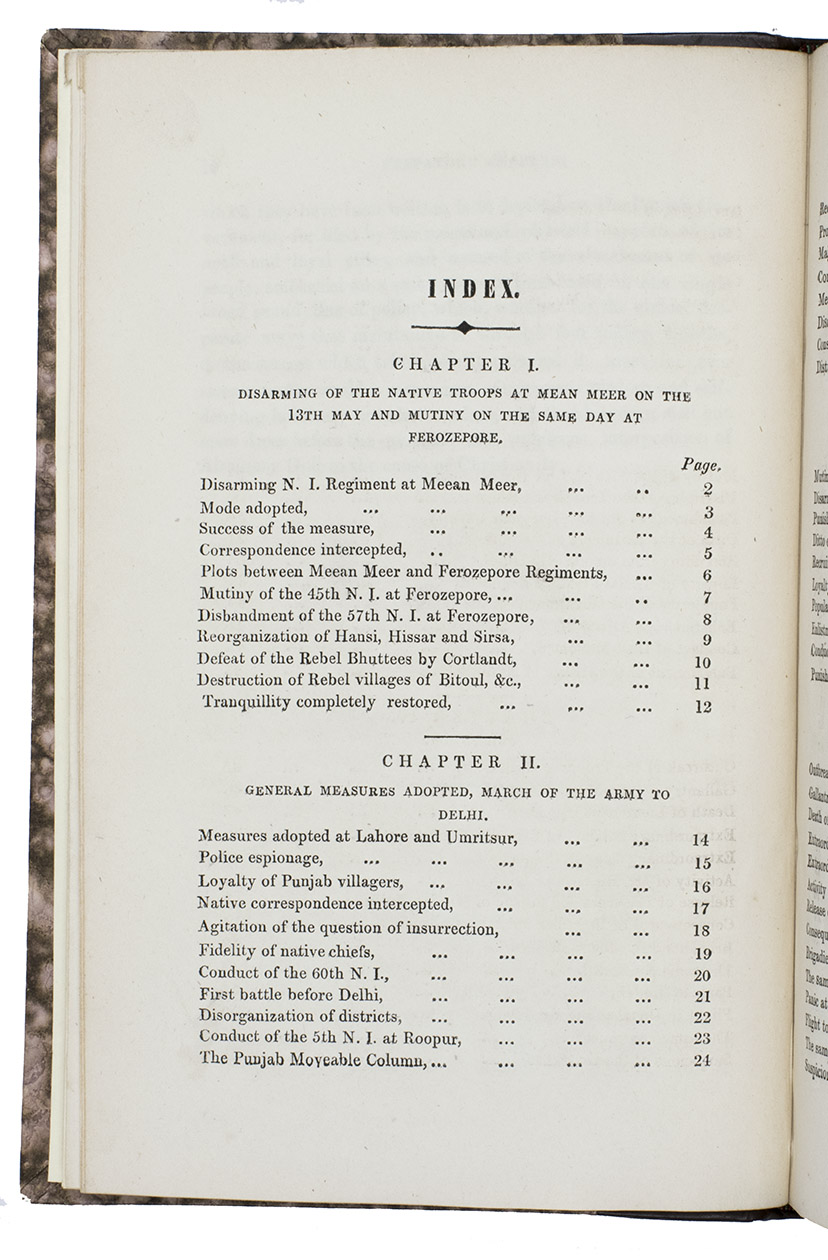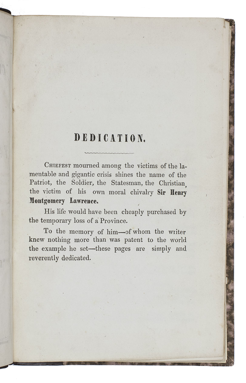 Very first edition, printed in Lahore in the Punjab region in 1858, of a controversial account by "a Punjab employe[!]". This employee was Frederick Henry Cooper (1827-1869), who was a British civil servant working with the British East India Company in the Punjab region. The present work is a very early publication on the Indian Mutiny of 1857, it was possibly published before, or in any case simultaneously with, the London edition of the same year.