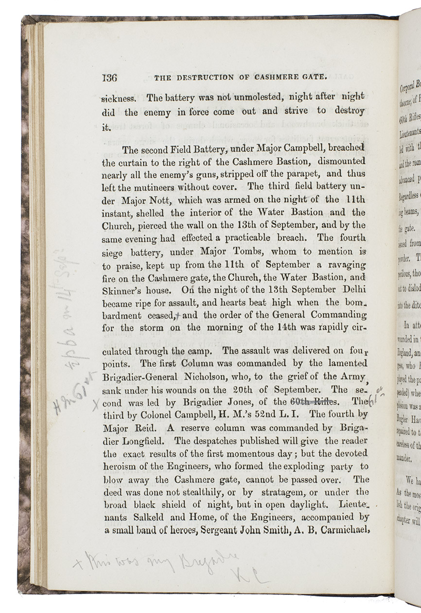 The title page is signed by the author "Fred Cooper C.B." and with pencil and ink annotations in the margins, most of these annotations giving translations of terms and occasional comments on the text itself are by someone who served with the 61st brigade and has initialled some of his notes "K.C.". The corners of the boards are very slightly scuffed, the outer margin of pp. 25-28 is cut slightly short, without affecting the text and some occasional very slight spotting. Otherwise in very good condition. Ladendorf 244; P.J.O. Taylor, Companion to the Indian Mutiny of 1857 (OUP, 1996), p. 170; WorldCat 800580831 (1 copy British Library), 17529071 (2 or more copies, unclear because of different eds.).