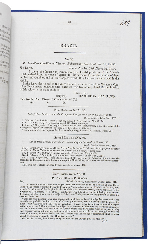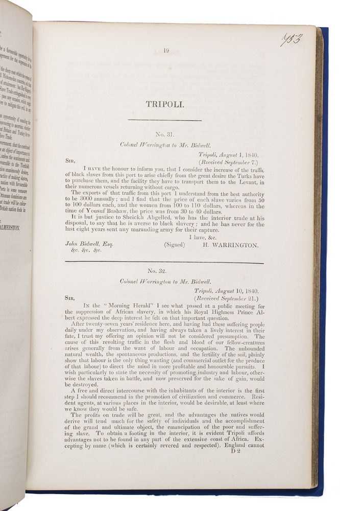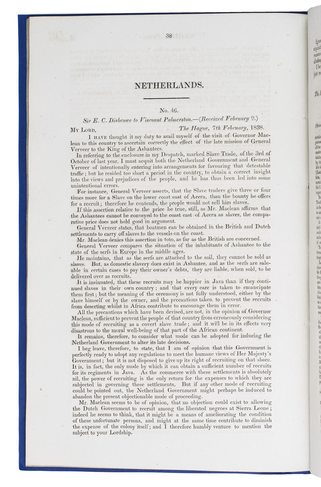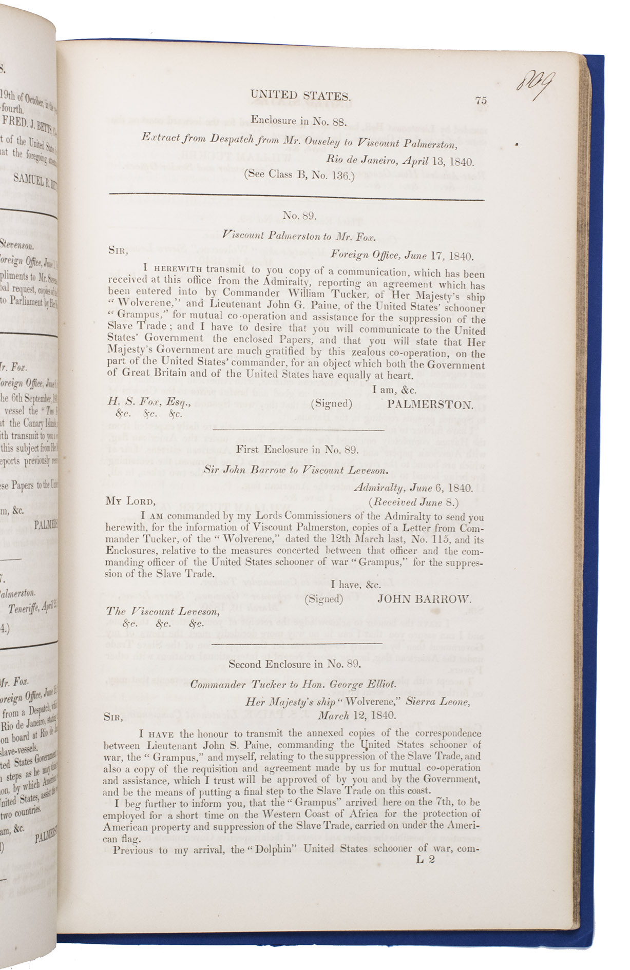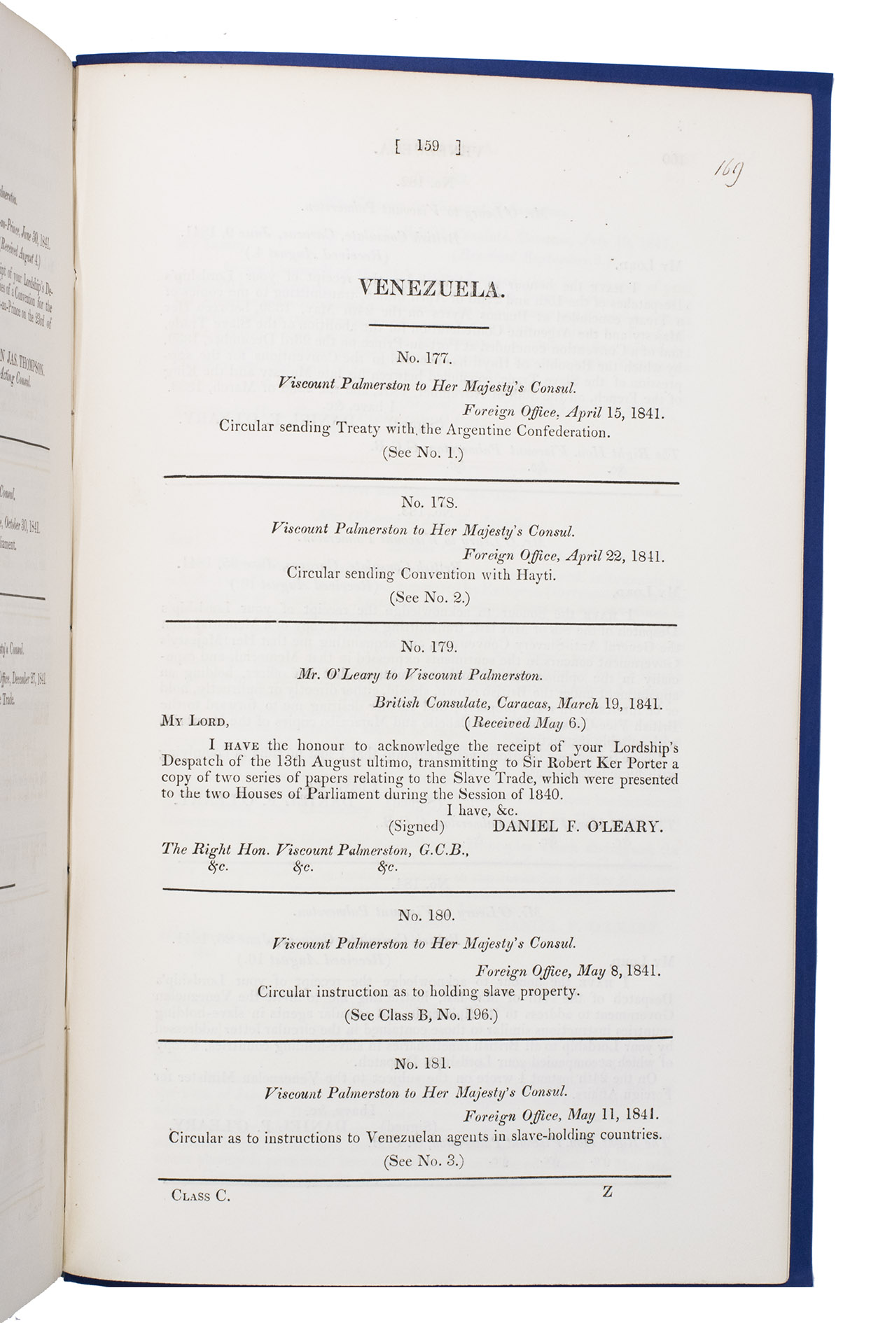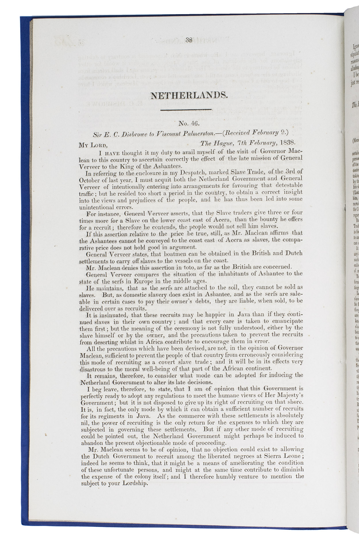 Rare collection of 14 volumes containing transcriptions of British diplomatic correspondence with other countries relating to the slave trade in the 19th century, printed for the British government. Although slavery in the British Empire was abolished in 1807, enslaved people in the colonies were not freed until 1838. In the present volumes, which mostly date from 1837-1846, directly after slavery was abolished in most British colonies, the British government urges other countries to help put a halt to the now illegal slave trade.