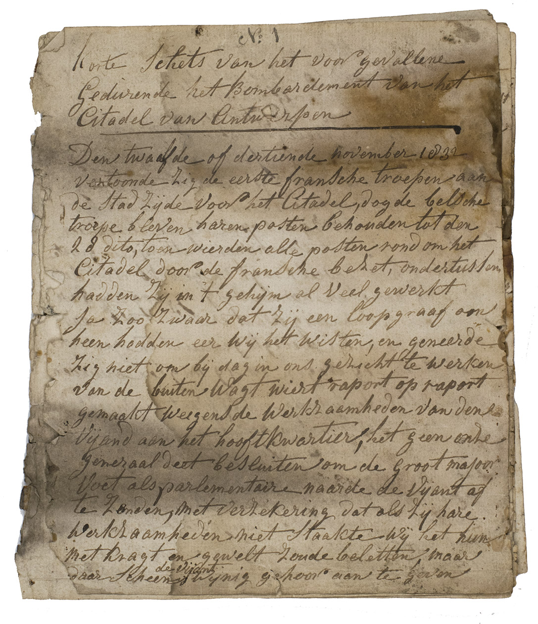 A very lively day-to-day eyewitness account of the siege of the Antwerp citadel from 12 November 1832 to the authors imprisonment in St. Omer as a result of the 23 December 1832 surrender. He remained in prison until June 1833, when he returned to Amsterdam. The account testifies to the intensity of the bombardments and exhausting battles as well as to the good treatment of prisoners by the French troops after surrender. The manuscript is written in Dutch in a legible hand of, apparently, a Dutch soldier possibly named Defourny. At the end of the letter, three members of the Defourny family testify that they have read the text: W[illem]. Defourny on 21 August 1897 (1864-1922), his son Engelbertus Jozephus Defourny W[illem]zn. (1901-1957), and E.J.s son Jacobus Cornelis Defourny (b. 1939). They may have been the grandson, great- and great-great grandson of Pierre Josephus Defourny (1808-pre 1880), a gunmaker who lived in Amsterdam after 1833, possibly the author of this account.