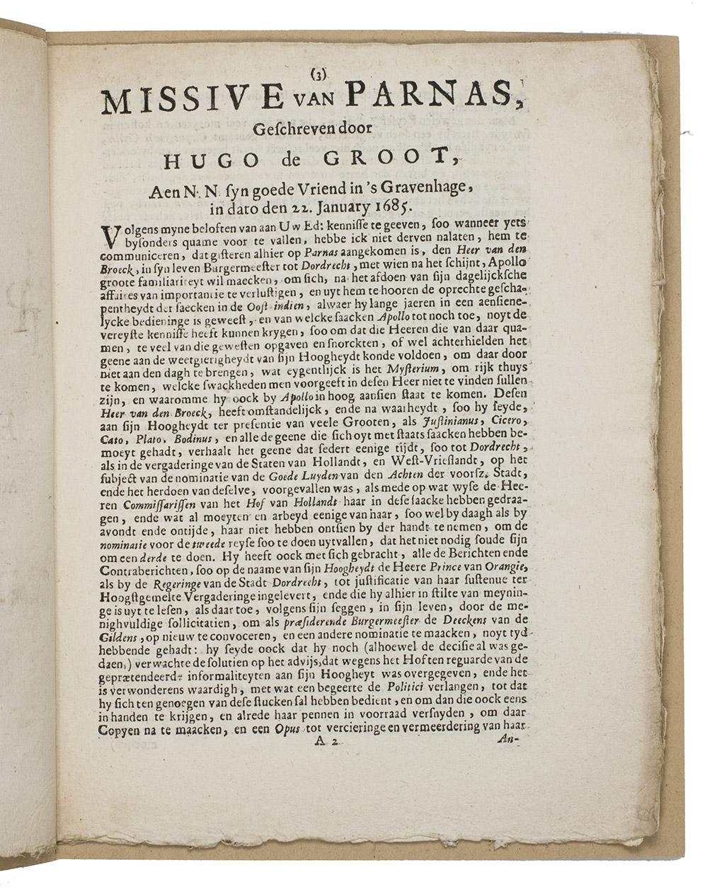 Missive van Parnas, geschreven door Hugo de Groot, aen N.N. syn goede vriend in s Gravenhage, in dato den 22 January 1685.