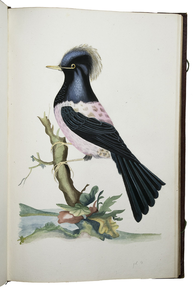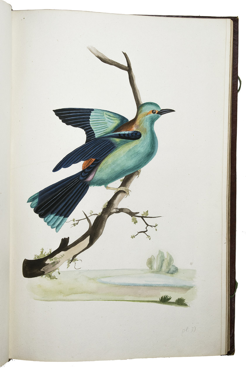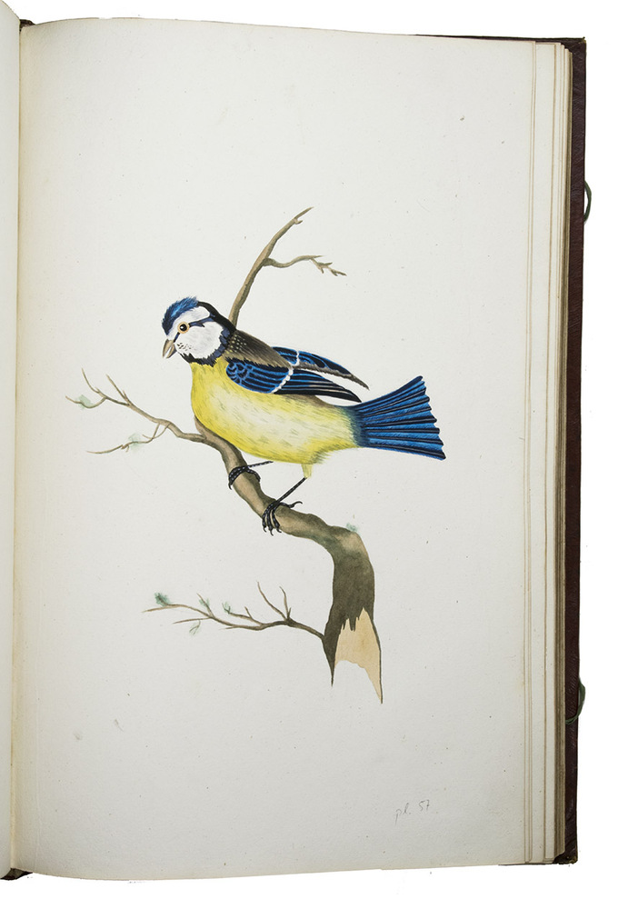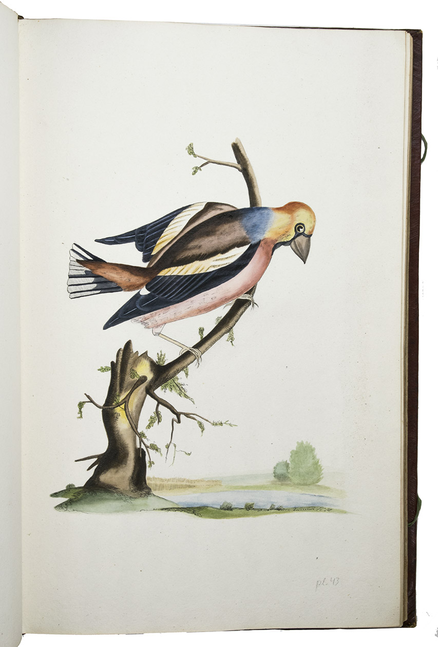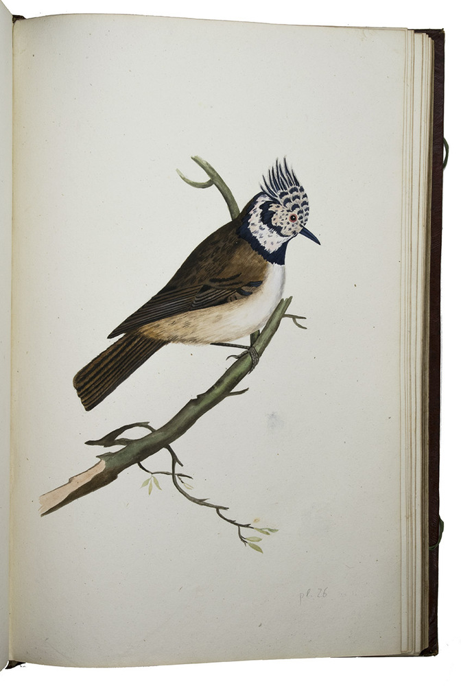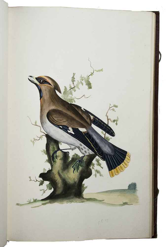 Splendidly bound drawing book containing 18 unsigned, detailed, watercolour and gouache drawings of birds. The colourful birds appear to be drawn after the plates in Edward Donovan's The natural history of British birds, first published in instalments between 1794 and 1819. If so, the present drawings must have been added to the drawing book at least 10 years after it was bound.