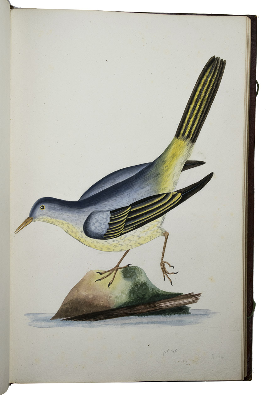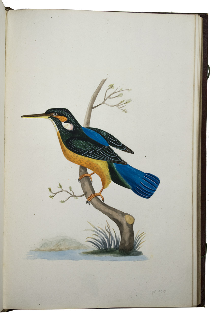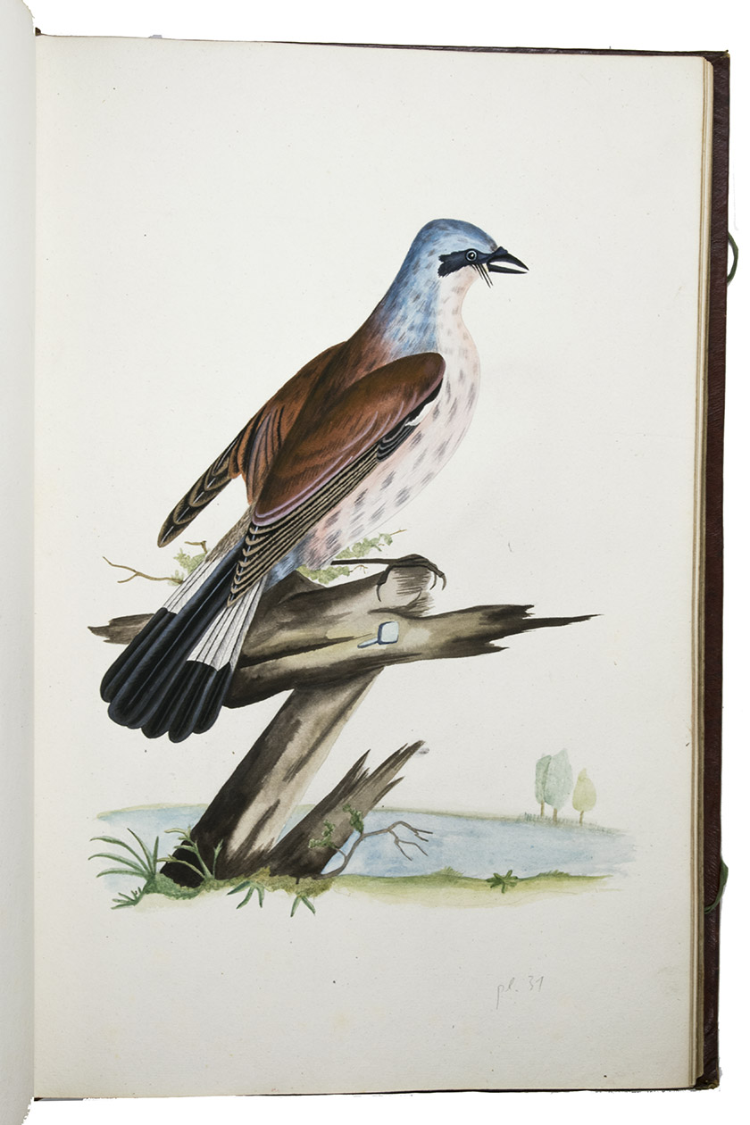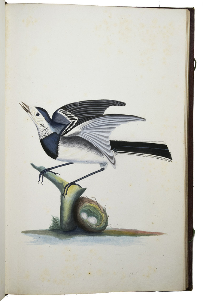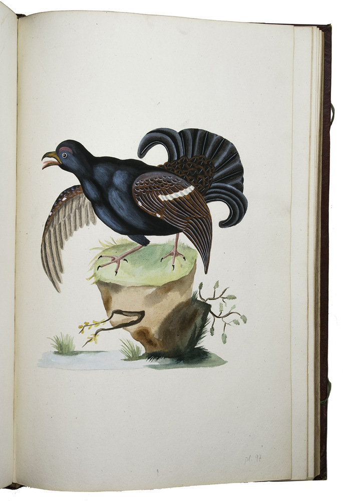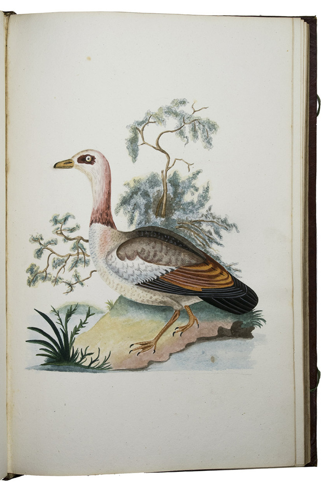 Splendidly bound drawing book containing 18 unsigned, detailed, watercolour and gouache drawings of birds. The colourful birds appear to be drawn after the plates in Edward Donovan's The natural history of British birds, first published in instalments between 1794 and 1819. If so, the present drawings must have been added to the drawing book at least 10 years after it was bound.