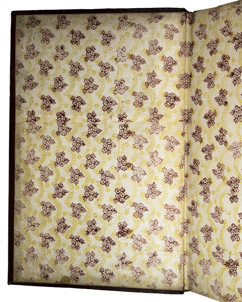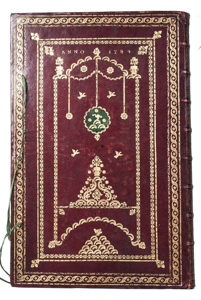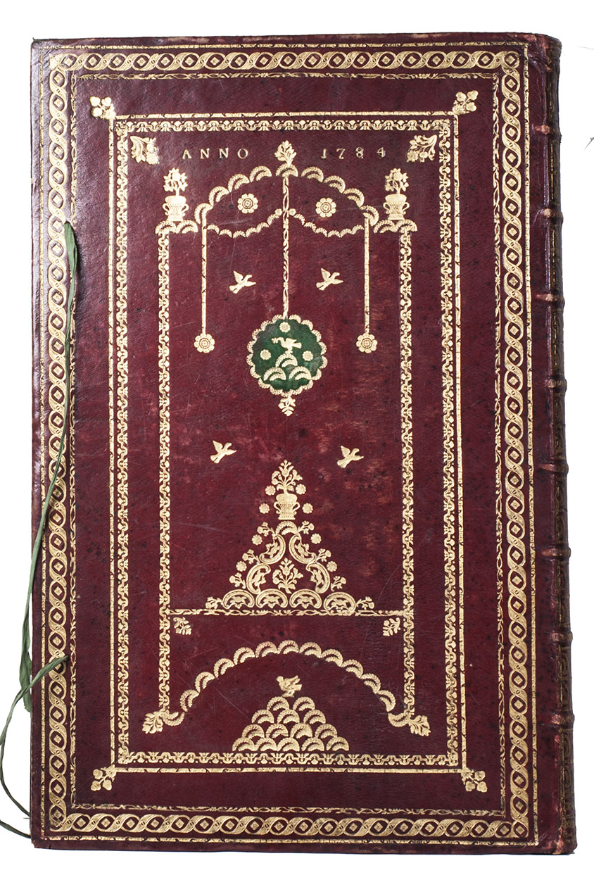 The blank drawing-book was bound, according to the gold lettering on the back board, in 1784, and the tools identify it as the work of the most important and arguably the best bindery in the 18th-century Netherlands, dubbed the First Stadholder Bindery by Storm van Leeuwen. Since the names of the binders remain unknown, the name now used alludes to the fact that it produced many bindings by order of the Stadholder Willem V and presumably his father Willem IV. Its great importance rests on the number of its surviving bindings, the diversity of the work it produced, the quality of the tooling, the exceptionally large number of binding tools it must have owned and the length of time it must have been operating, from at least 1722 to 1793 (Storm van Leeuwen). The paper is laid, with no watermark, and appears to be quite consistent.