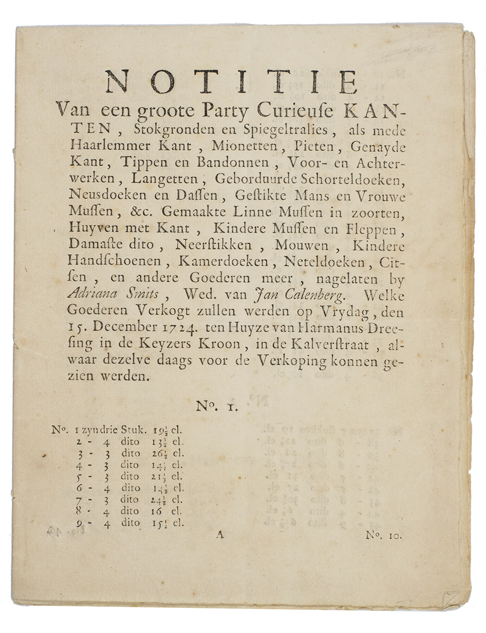 [Drop-title:] Notitie van een groote party curieuse kanten, stokgronden en spiegeltralies, als mede Haarlemmer kant, mionetten, pieten, genayde kant, tippen en bandonnen, voor-en achter- werken, langetten, geborduurde schorteldoeken, neusdoeken en dassen, gestikte mans en vrouwe mussen, &c. ... nagelaten by Adriana Smits, wed. van Jan Calenberg. Welke goederen verkogt zullen werden op vrydag, den 15. December 1724. Ten huyze van Harmanus Dreesing in de Keyzers Kroon, in de Kalverstraat ...