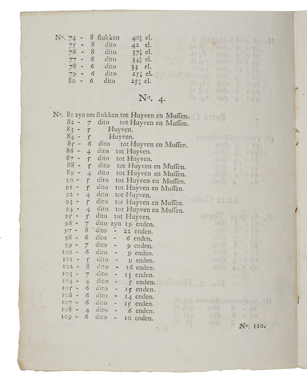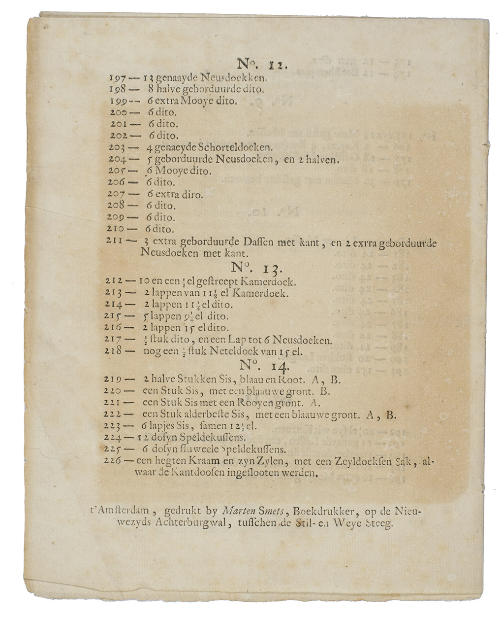 Only copy located of the first and only edition of an auction catalogue that lists a variety of valuable textiles offered for sale on 15 December 1724 at the premises of Harmanus Dreesing in Amsterdams Kalverstraat. The kinds of textiles offered at the sale include lace, damask cloth and embroidered materials. These fabrics had belonged to Adriana Smits, widow of East India Company employee Jan Callenberg (d. 1715) who had travelled to Indonesia at least once. We have traced no other copy of present catalogue.
