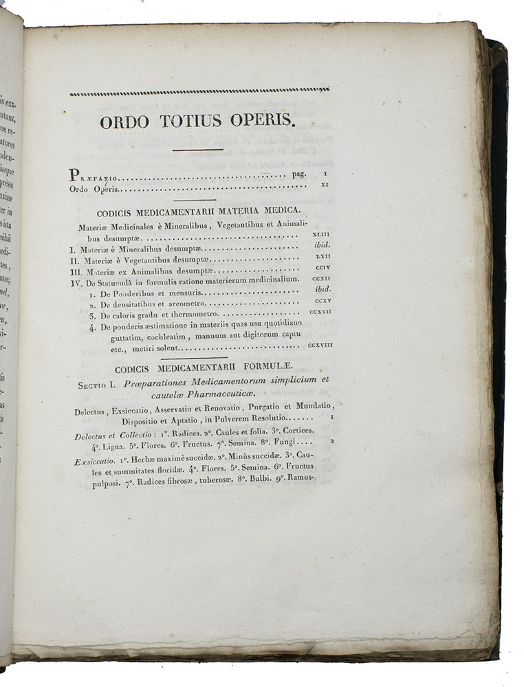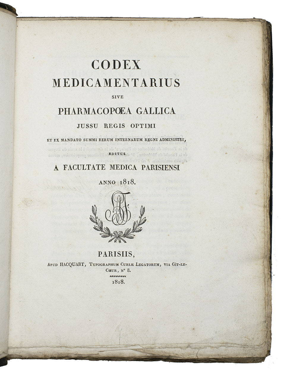 An official copy of the original Latin edition, with the stamp of the Faculté de la Médecine and the signature of the dean of the Faculté. In 1819 a French translation was published which became the official pharmacopoeia for all pharmacists of France: Pharmacopée française, ou code des médicamens (2nd ed.: 1827).