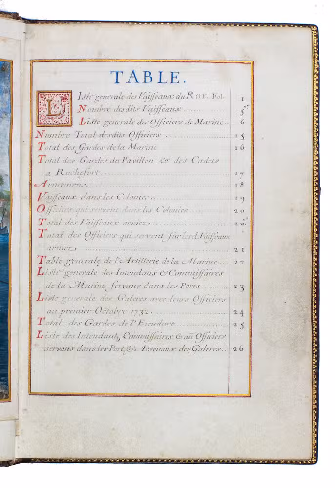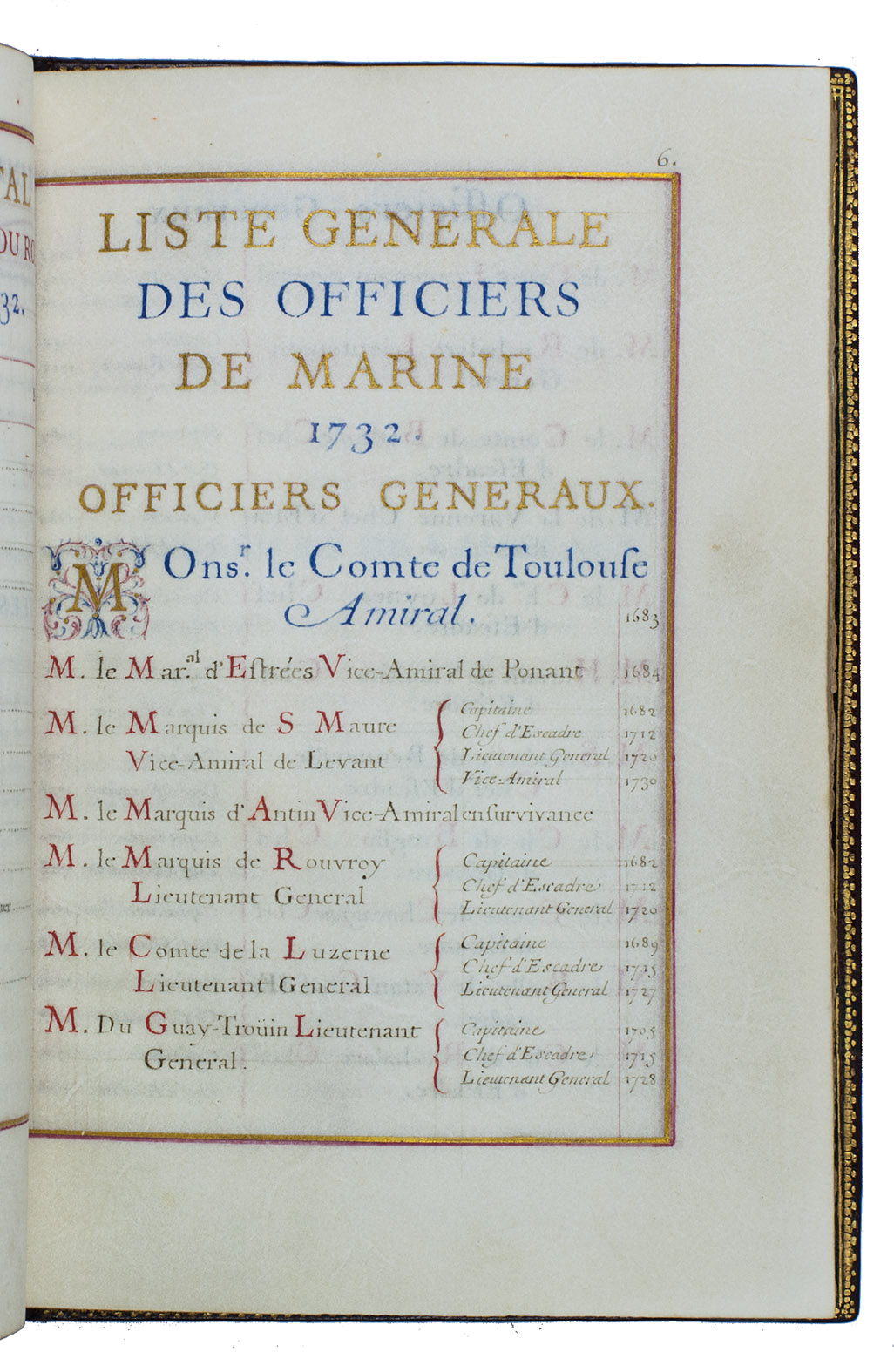 Splendid vellum manuscript on the condition and organisation of the French Royal Navy of King Louis XV in the year 1732, including maritime data on the French colonies in Canada, Louisiana and the West Indies. The manuscript is beautifully calligraphed in a formal roman and italic in brown-black, red and blue, sometimes with gold covering the ink, with 2 decorated initials in gold over red. The use of the high quality vellum, the fine gouache illustration, the lavishly executed calligraphy and the beautiful contemporary binding, indicate that the manuscript must have been produced for an important person, probably a head of the marine or an official at the court. The manuscript gives a complete survey of the size and organisation of the French navy of the Ancien Regime in 1732 and must have been top secret at the time!