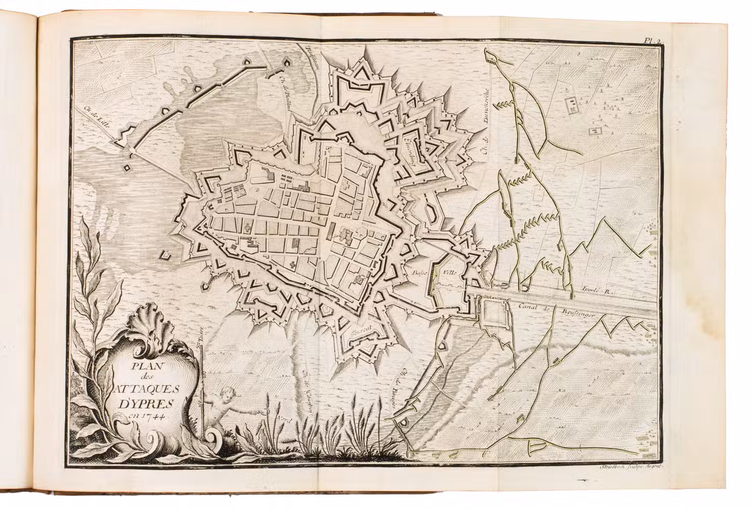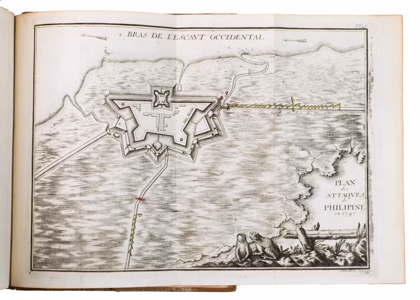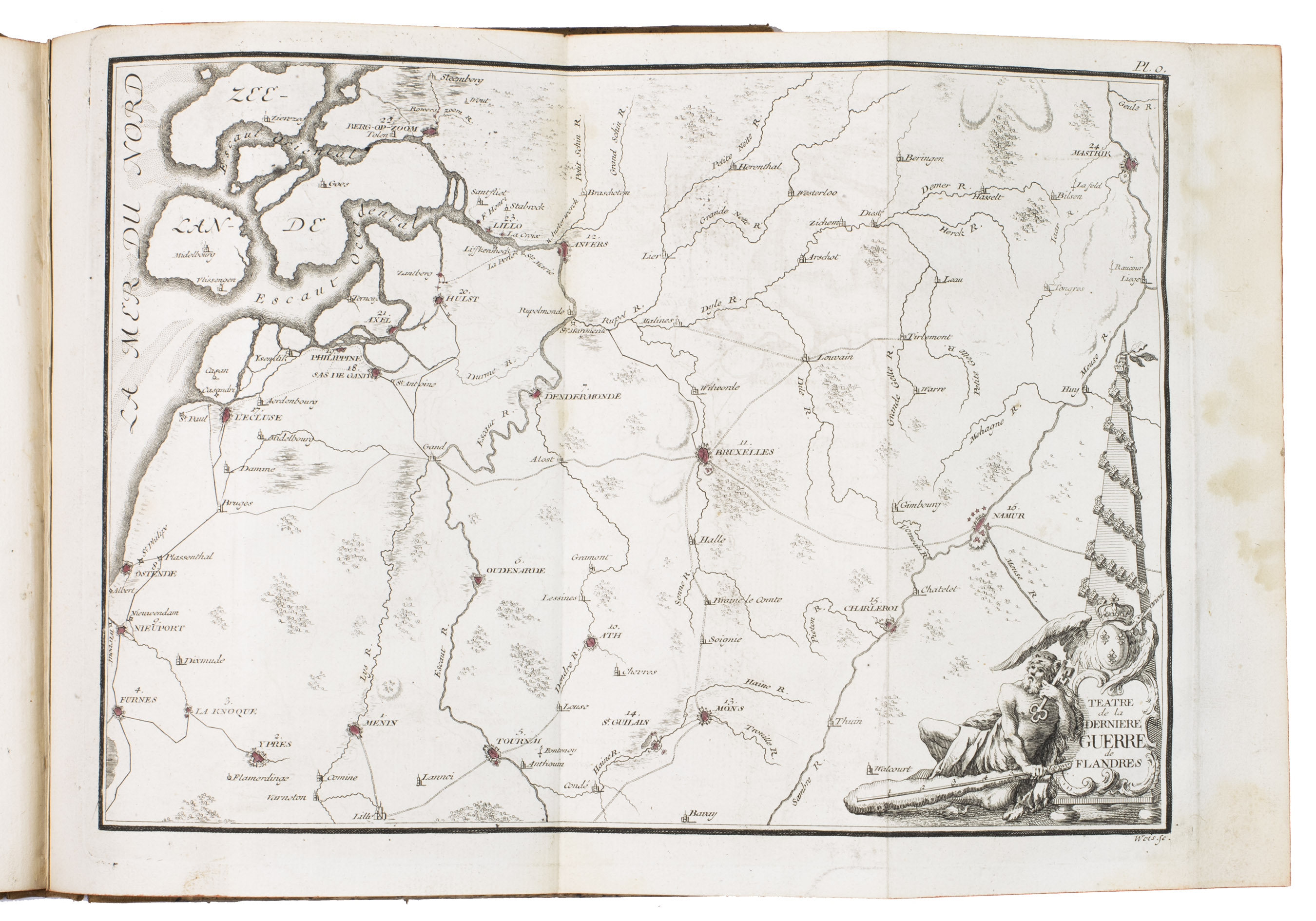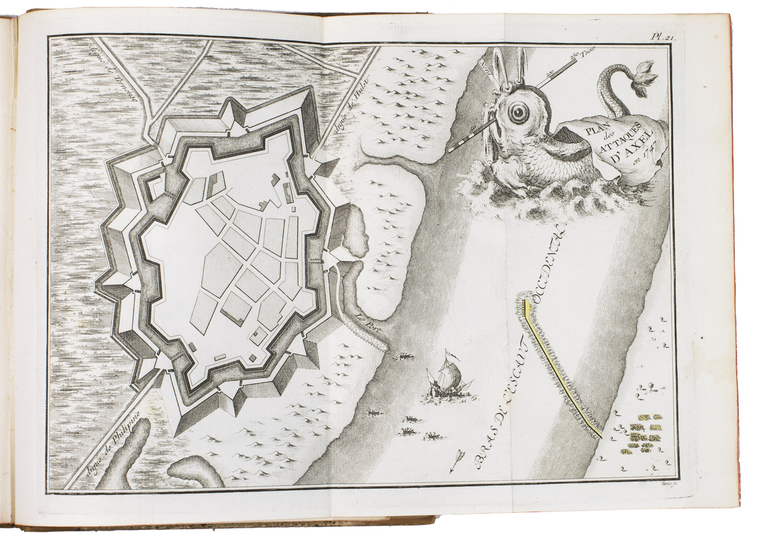 First edition, one of the two simultaneously published issues, of a richly illustrated account of sieges of Flemish towns during the War of the Austrian Succession (1740-1748). The two authors, Jakob Funck and Marc Guérard d'Illens, both captain in the French army, dedicated the book to the French minister of war, the Count of Argenson. The book is divided into 24 "journals", each describing the siege of a different town in Flanders in chronological order, starting at the siege of Menin in 1744 and ending with Maastricht in 1748. Each journal has its own folding plate, showing a ground plan of the besieged city and its fortifications with the "plan des attaques" highlighted in yellow. Included after the preliminaries is a table with a survey of the besieged towns, with the dates of the sieges, the days the battles took place, and the names of the leaders of the attacking and defending army. The map and plans are detailed and finely drawn, decorated with cherubs, monsters, ships, frogs, loving couples, soldiers, and some have additional artistic value, with maps with enlarged details rolled out on top of another map.