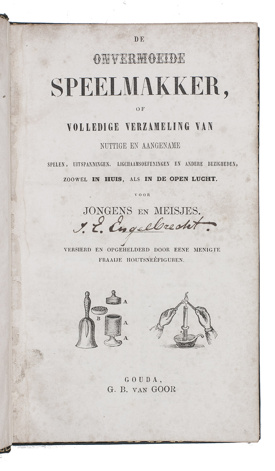 De onvermoeide speelmakker, of volledige verzameling van nuttige en aangename spelen, uitspanningen, ligchaamsoefeningen en andere bezigheden, zoowel in huis, als in de open lucht voor jongens en meisjes. Versierd en opgehelderd door eene menigte fraaije houtsneêfiguren.