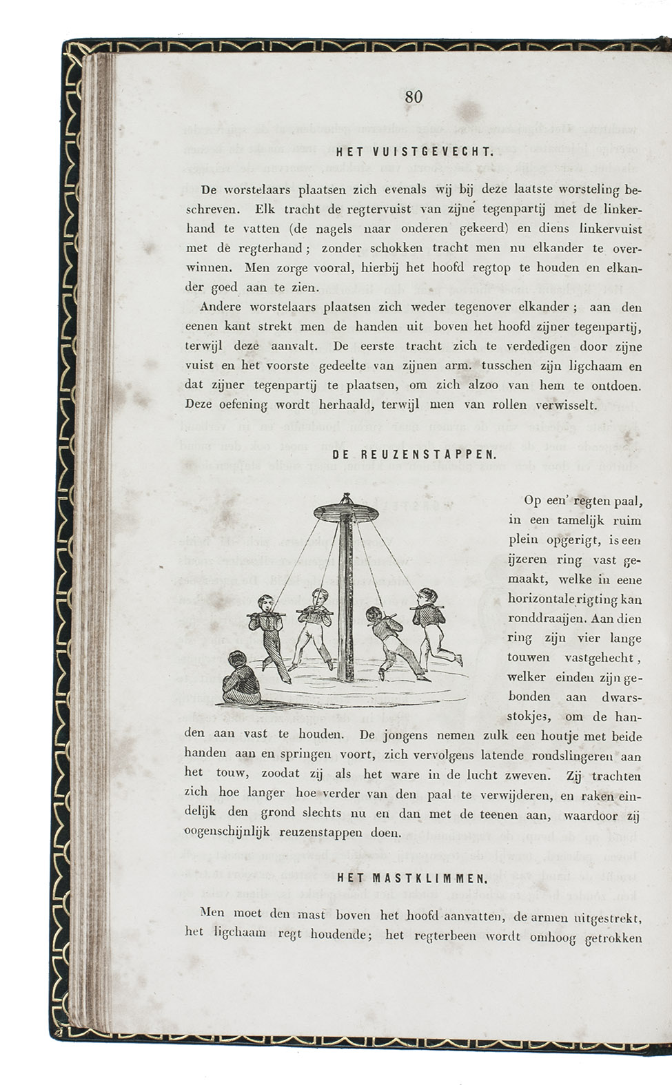 Rare first edition of a book on conjuring, magic, games and pastimes for young boys and girls. It contains both in- and outdoor games, games to measure strength and speed, swimming, gymnastics, ice-skating, dancing, music, fencing, fishing, and catching and preserving birds, including a list with different fish and bird species. Besides sports it also gives the rules for various card games and other games like chess, draughts (checkers), etc., and contains about 100 different kinds of magic and conjuring tricks. Also included is an alphabet for deaf people. The book closes with popular explanations of electricity, magnetism, optics, mathematics and arithmetic, the use of the magic lantern and the microscope, etc.